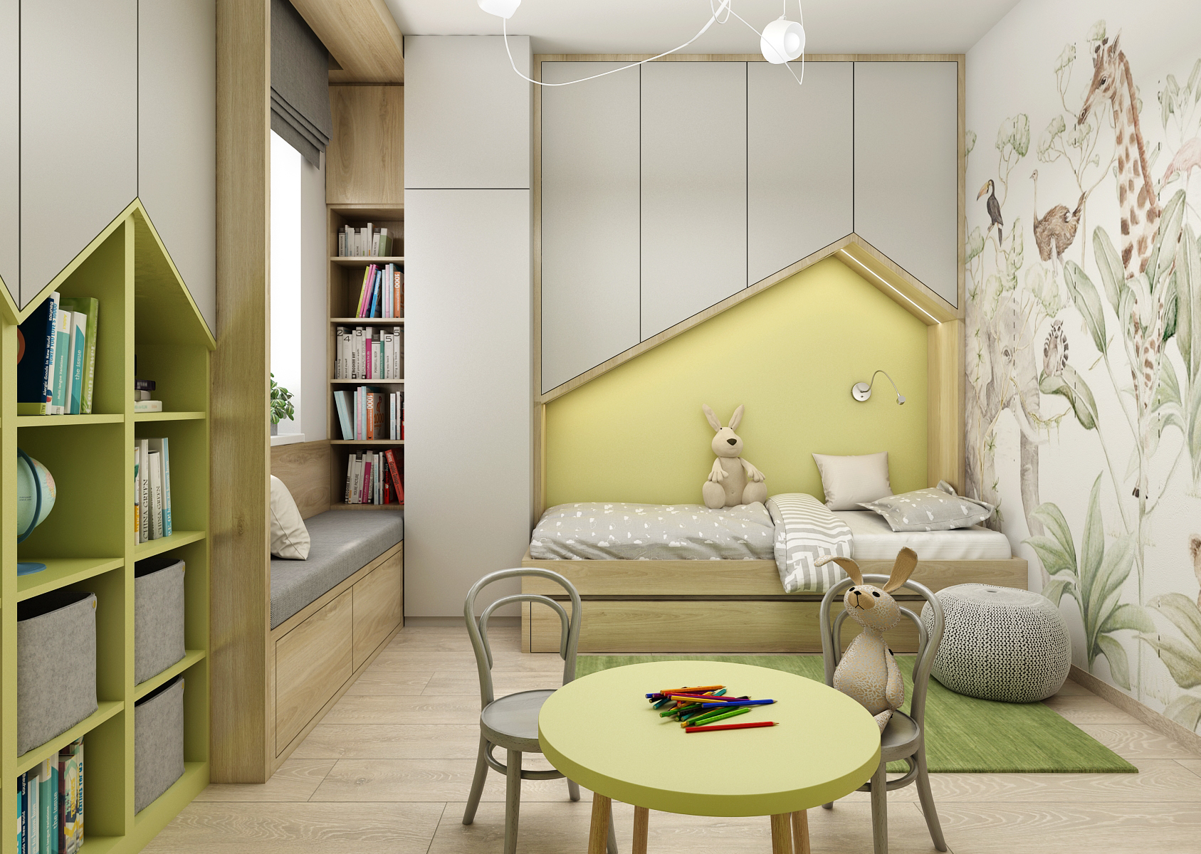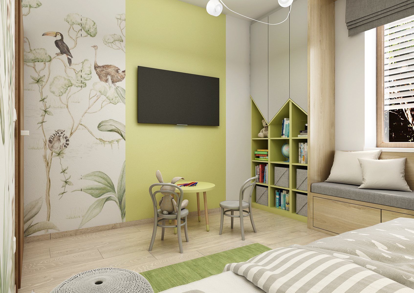 The cozy children's room is decorated in soft green tones in combination with gray.