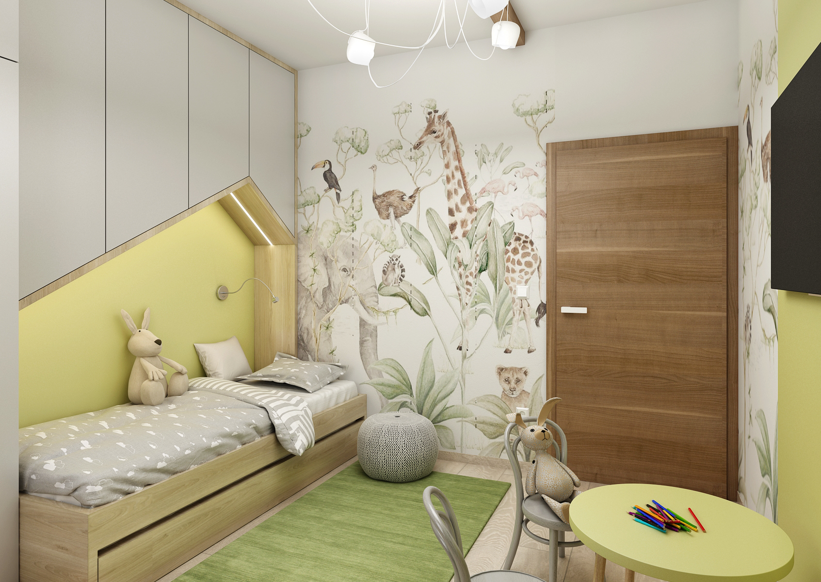 The space is decorated with wallpaper with animal motifs. An interesting element in the bedroom is the bed, which is set into the recess of the built-in wardrobe in the shape of a house. Above the imaginary canopy, which illuminates the bed thanks to an LED strip, there are several storage spaces behind the door.