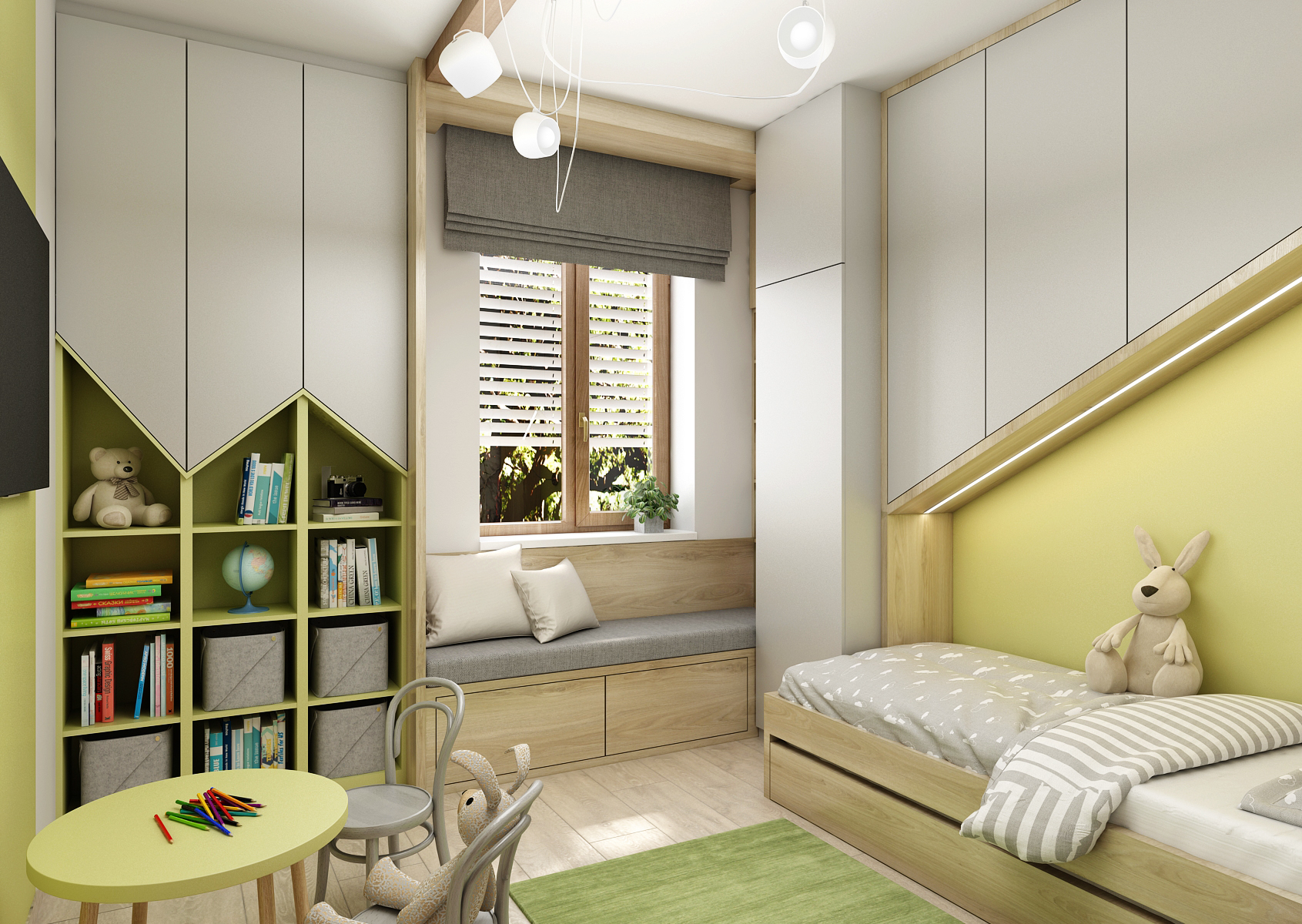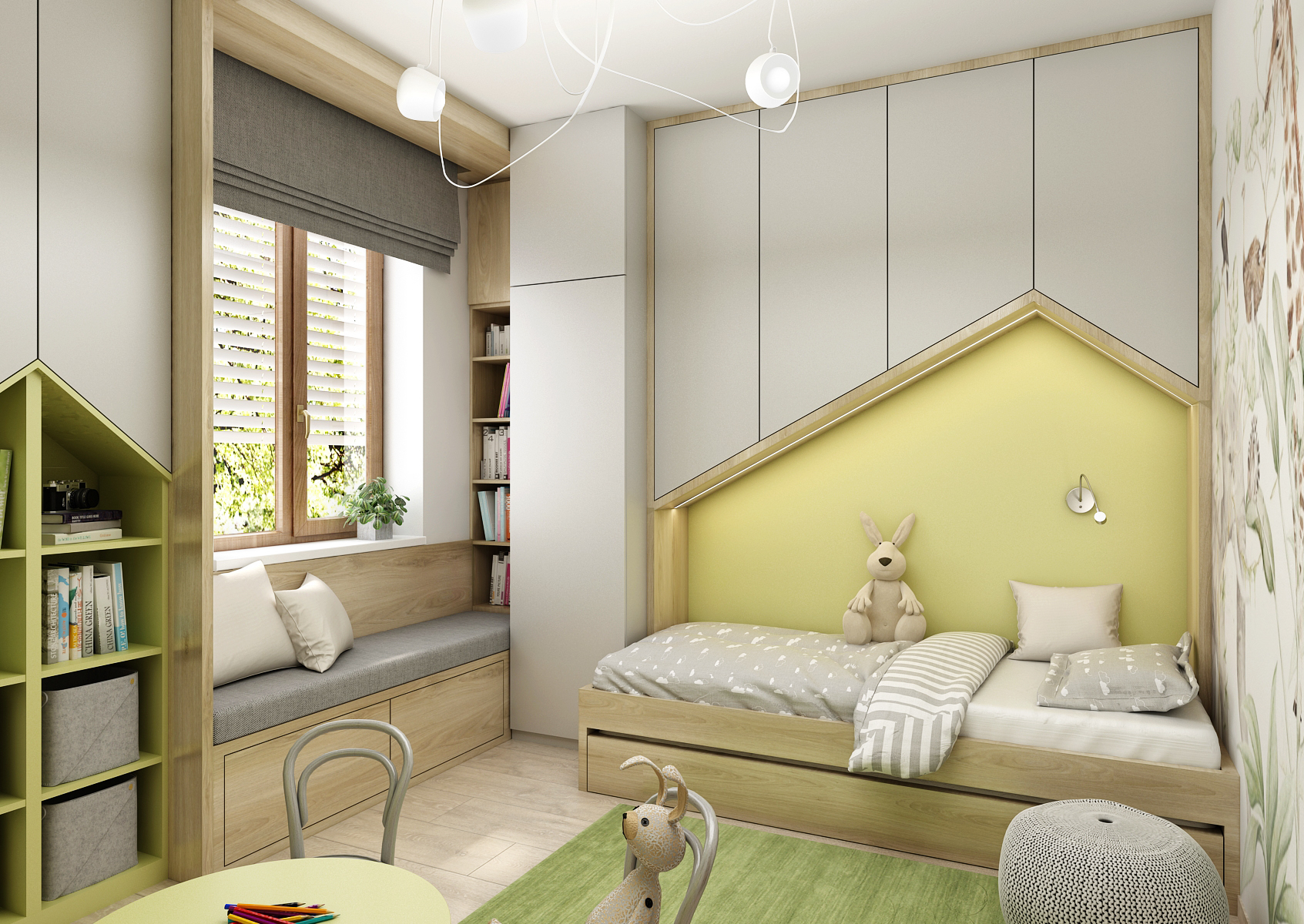 Under the window there is a sitting area with an upholstered seat and an open bookcase. Two drawers for storing things are incorporated into the seating structure. The shape of the houses is also found on the cabinet next to the window, where the lower part is equipped with shelves, the upper part is equipped with a door.