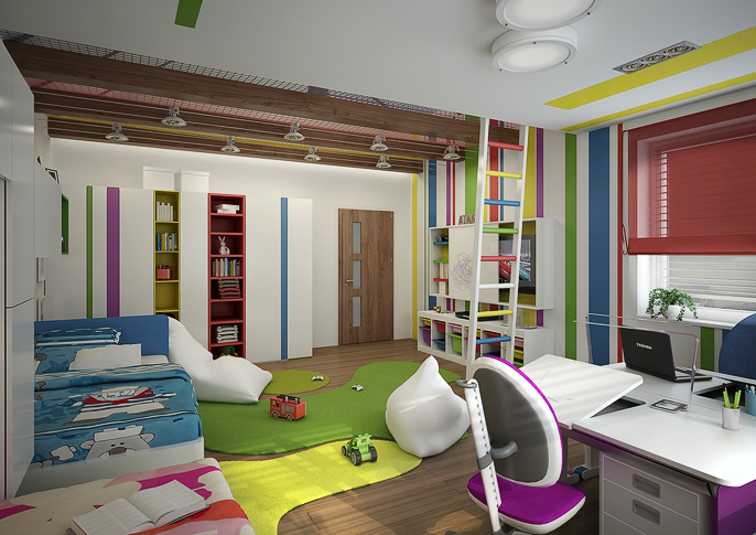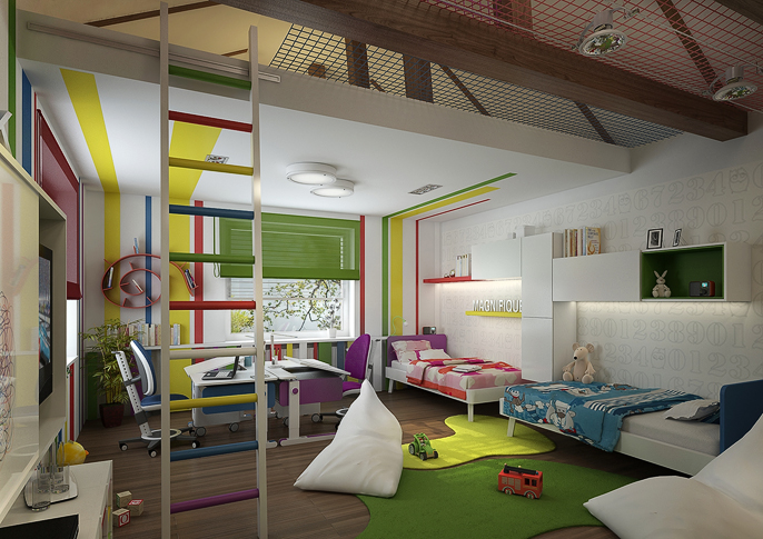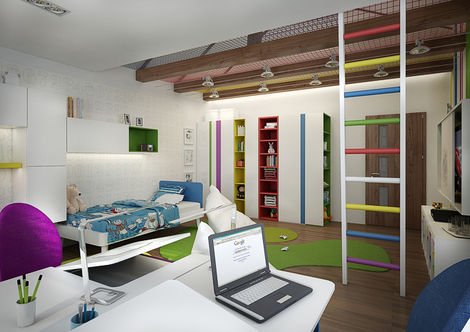 Colorful children's room for a boy and a girl with an atypical solution for the floor, where another area for playing is created. Unusually, a larger number of colors is used in combination with white. The wall behind the beds is brightened with light number wallpaper, which contrasts with the dark floor and dark wooden beams. An interesting element is the mesh part on the ceiling ensuring the safety of children.