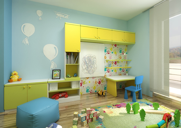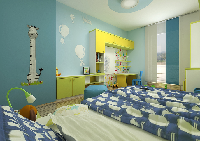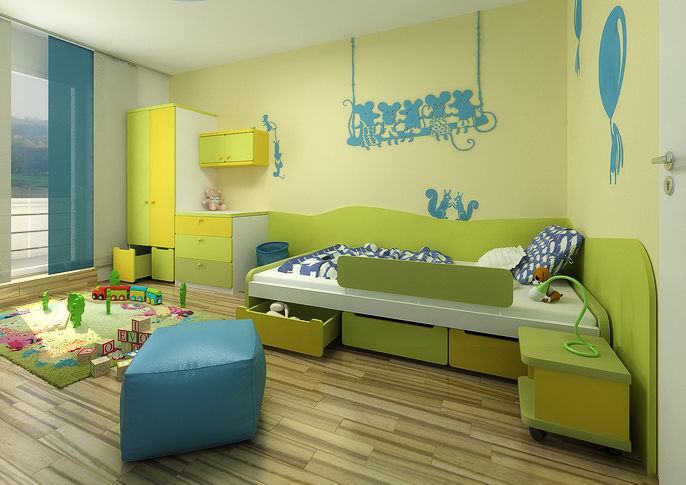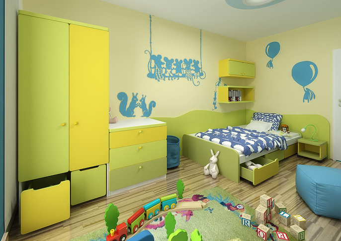 The equipment of the room for the preschooler is subject to the safety of the child when moving and playing in the room - you will not find dangerous sharp corners here. The children's room was designed in colors according to the child's preferences. The room is decorated in a combination of blue, green and yellow. On the walls there are colorful elements in the form of various wall stickers with animal or other motifs. The whole space looks playful thanks to the color.