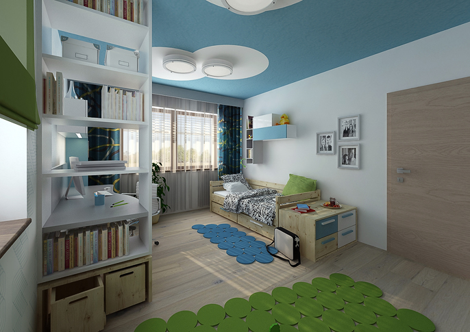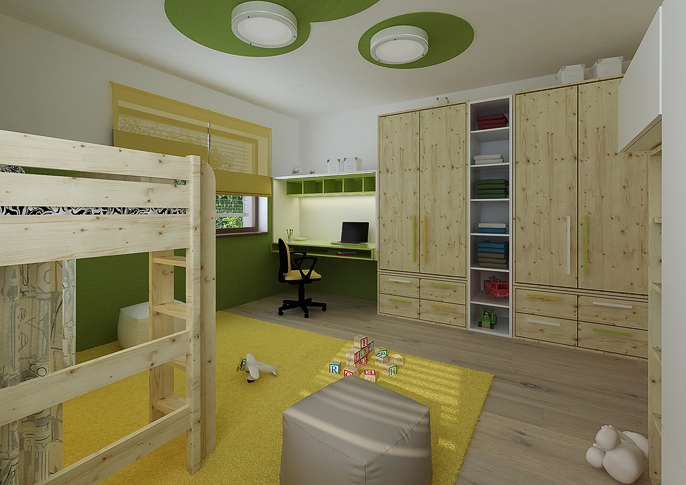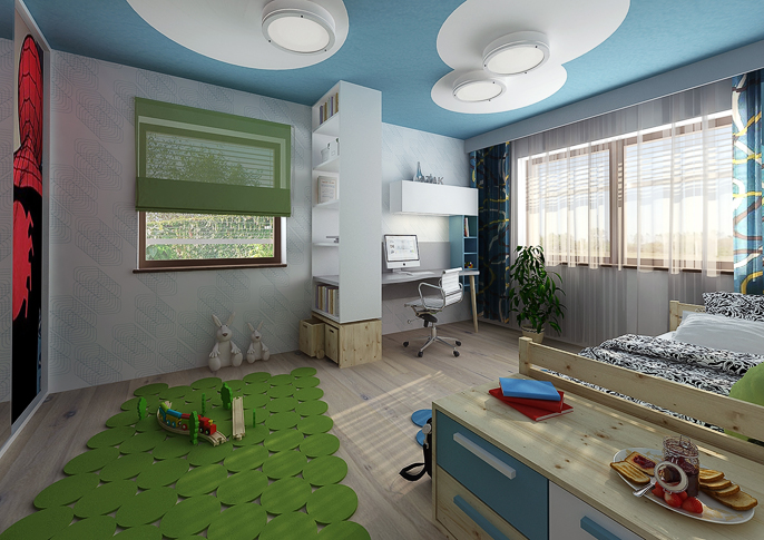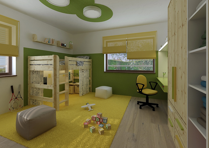 The two children's rooms are designed using the favorite colors of their occupants, and taking into account their age and study needs. In the first case, it is a combination of blue and green, the room looks fresh and cozy. The second variant, by matching the colors yellow and green, resembles nature. He approaches it with a patterned wallpaper with leaves. Both rooms are complemented by wooden pieces of furniture combined with white.