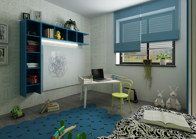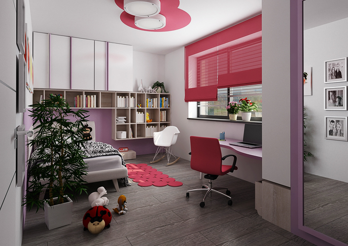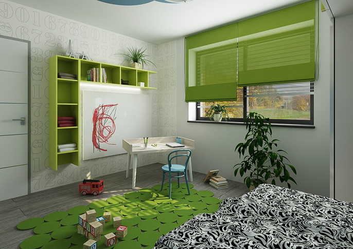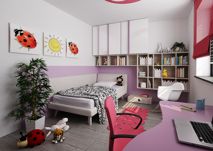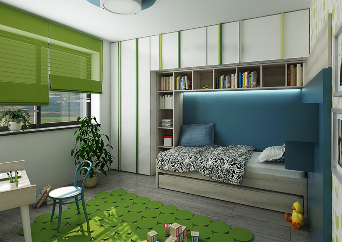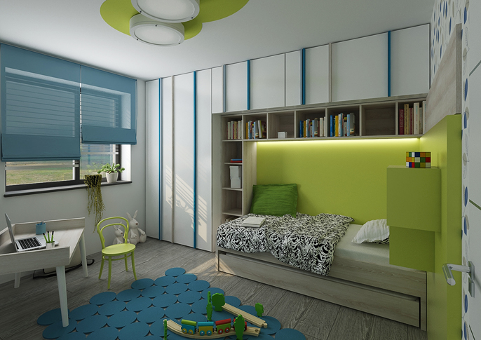 Children's rooms are designed in colors according to the preferences of their inhabitants. The storage doors are equipped with handles in the form of decorative colored strips. There are combinations of lush green with blue and pink with purple. Both variants are harmonized with white elements of furniture or various decorations. An interesting element are the patterned wallpaper and the floor in a darker shade of brown.