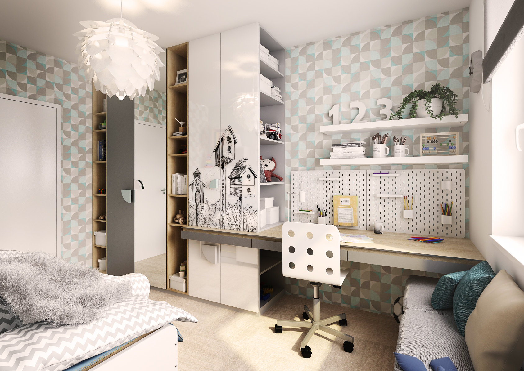 The cabinet system with a mirror next to the desk is enriched with a line art drawing of birdhouses. The desk is equipped not only with drawers, but also with IKEA perforated panels with hanging accessories.