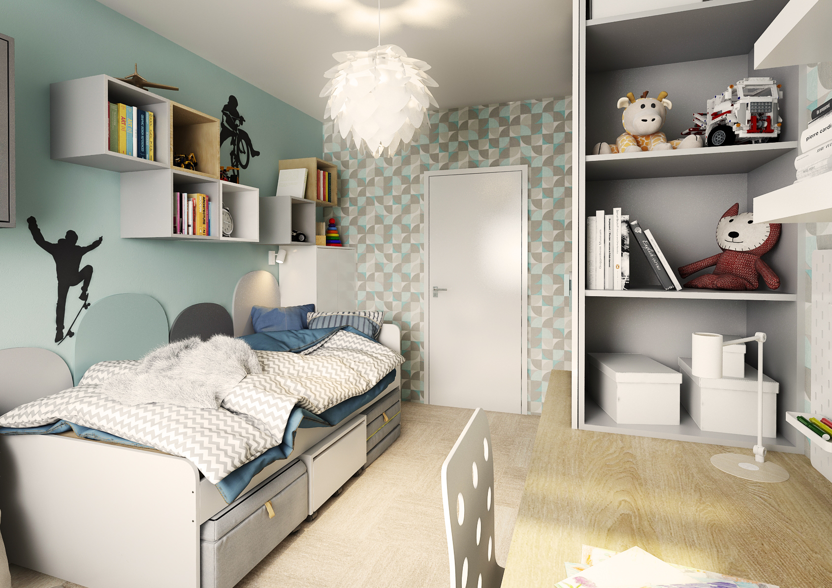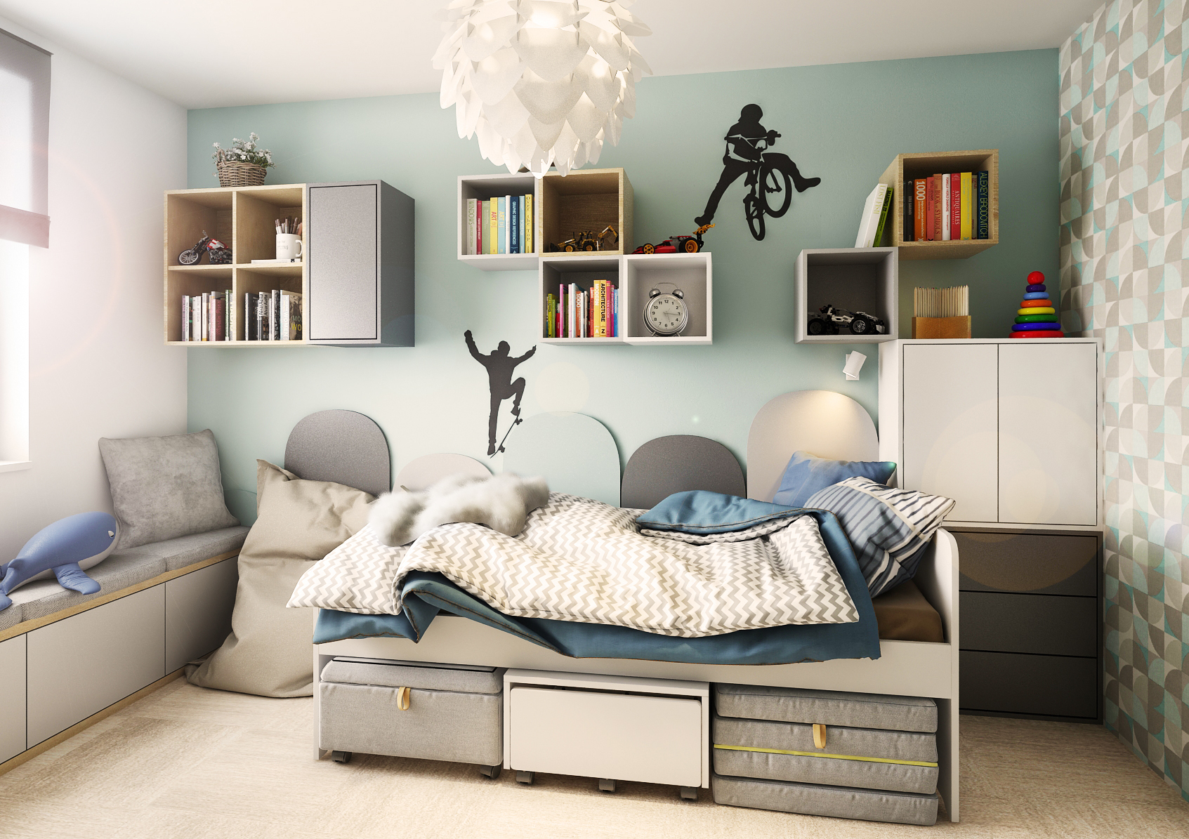 Here, the mint painting complements the patterned wallpaper together with the gray color, which is mainly found on the furniture elements. A bed with modular boxes placed under the structure is located in the center of the wall. The 3D shapes on the wall connect to the upholstered seating under the window, giving the impression of a skateboarding surface on the sticker. For a change, a sticker with a boy on a bicycle is placed between the wall-mounted square shelves.