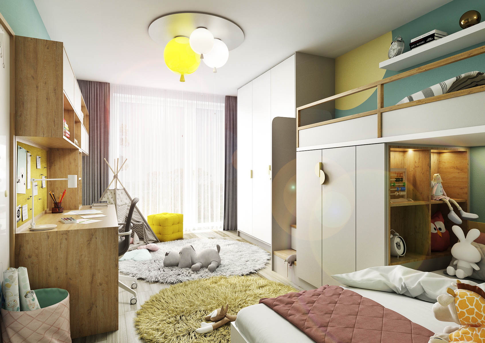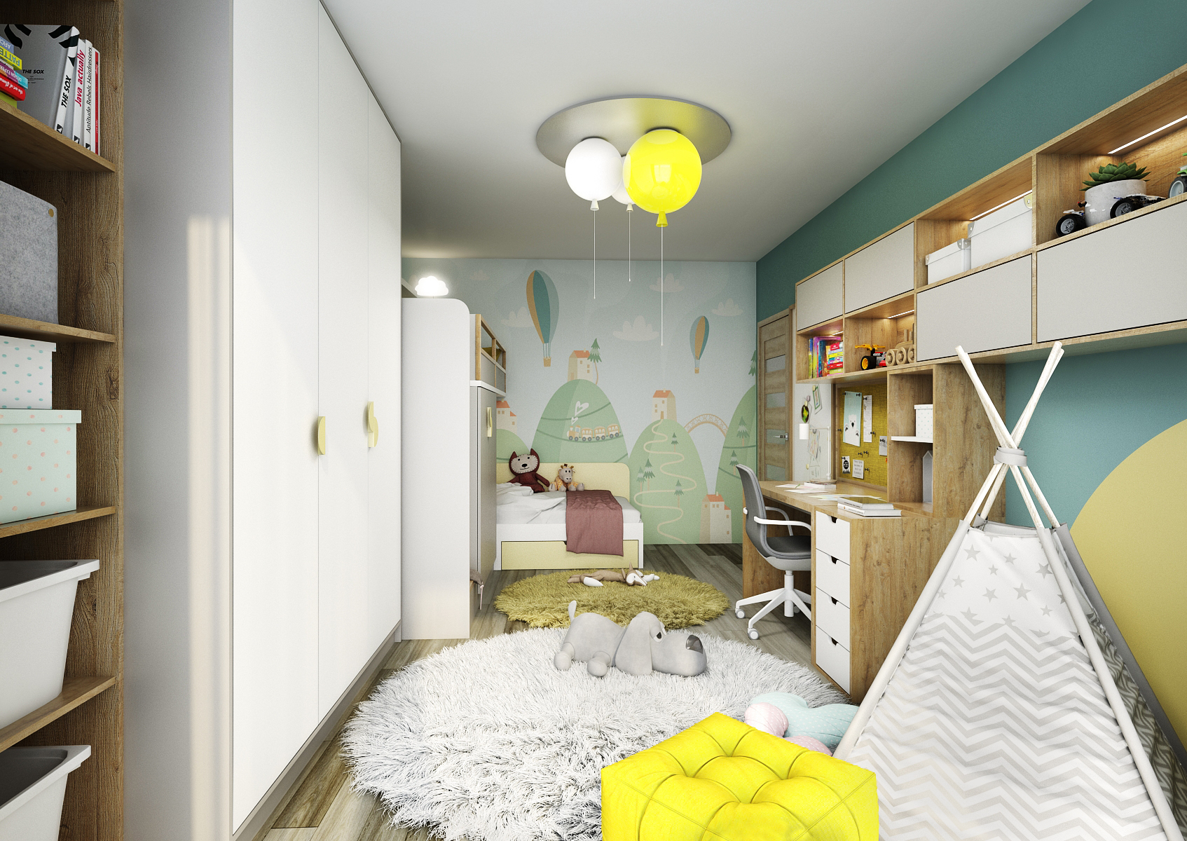 The room is colorful with painting and playful wallpaper with houses and hot air balloons. A chandelier in the form of three balloons in different sizes is matched to this. High-pile circular rugs and a teepee tent are placed on the ground.