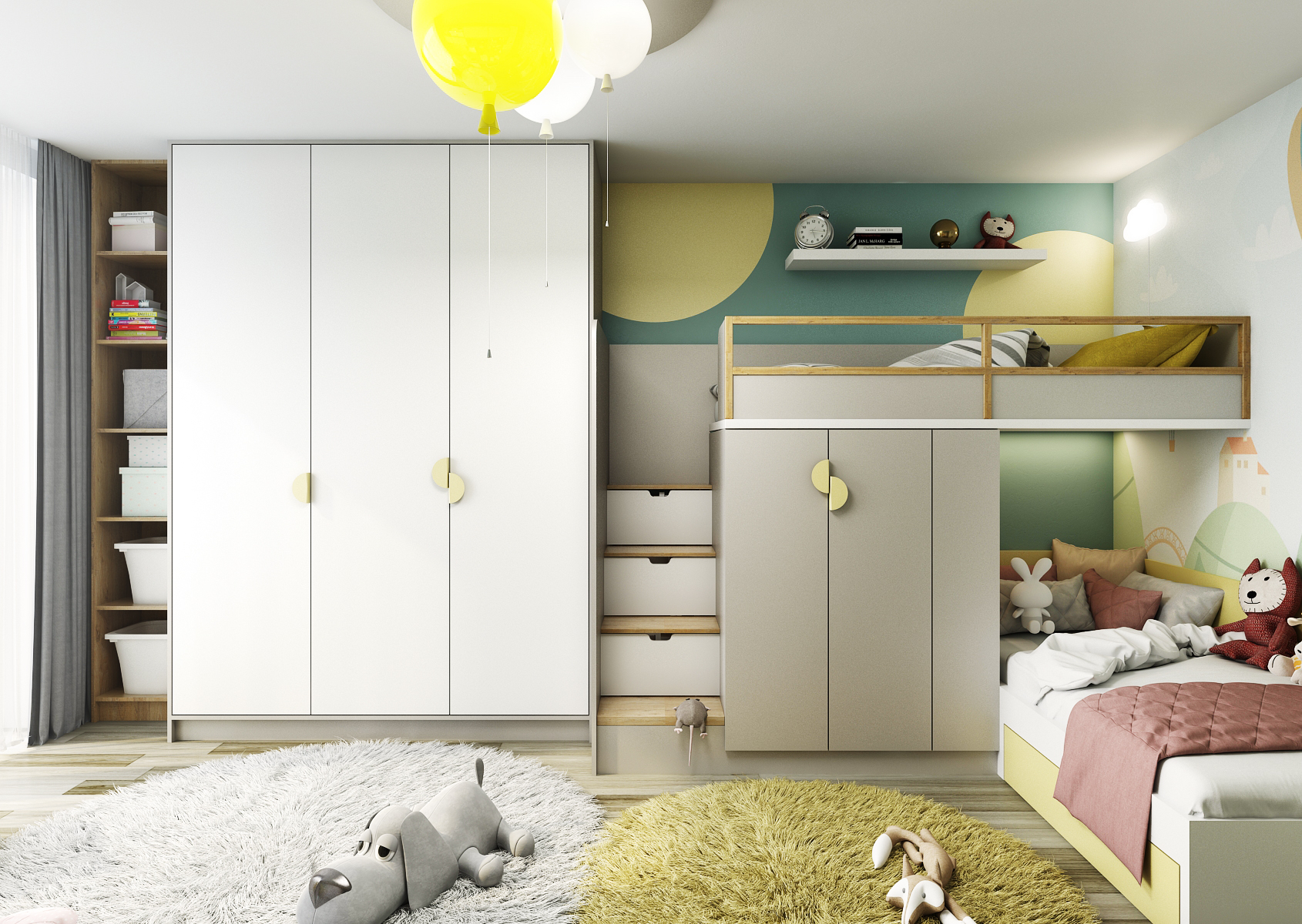 The playful children's room has a bunk bed with steps located at the entrance, which is visually connected to the built-in wardrobes with open shelves. Storage spaces are also found in the steps in the form of drawers. For a change, the opposite wall is equipped with a desk with a shelf system hung on the wall. There is also backlighting of the open shelves.