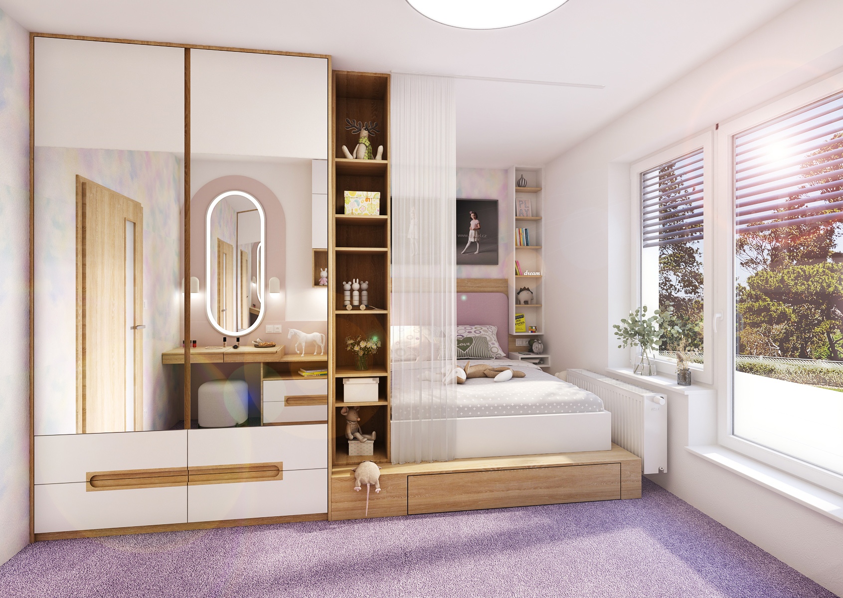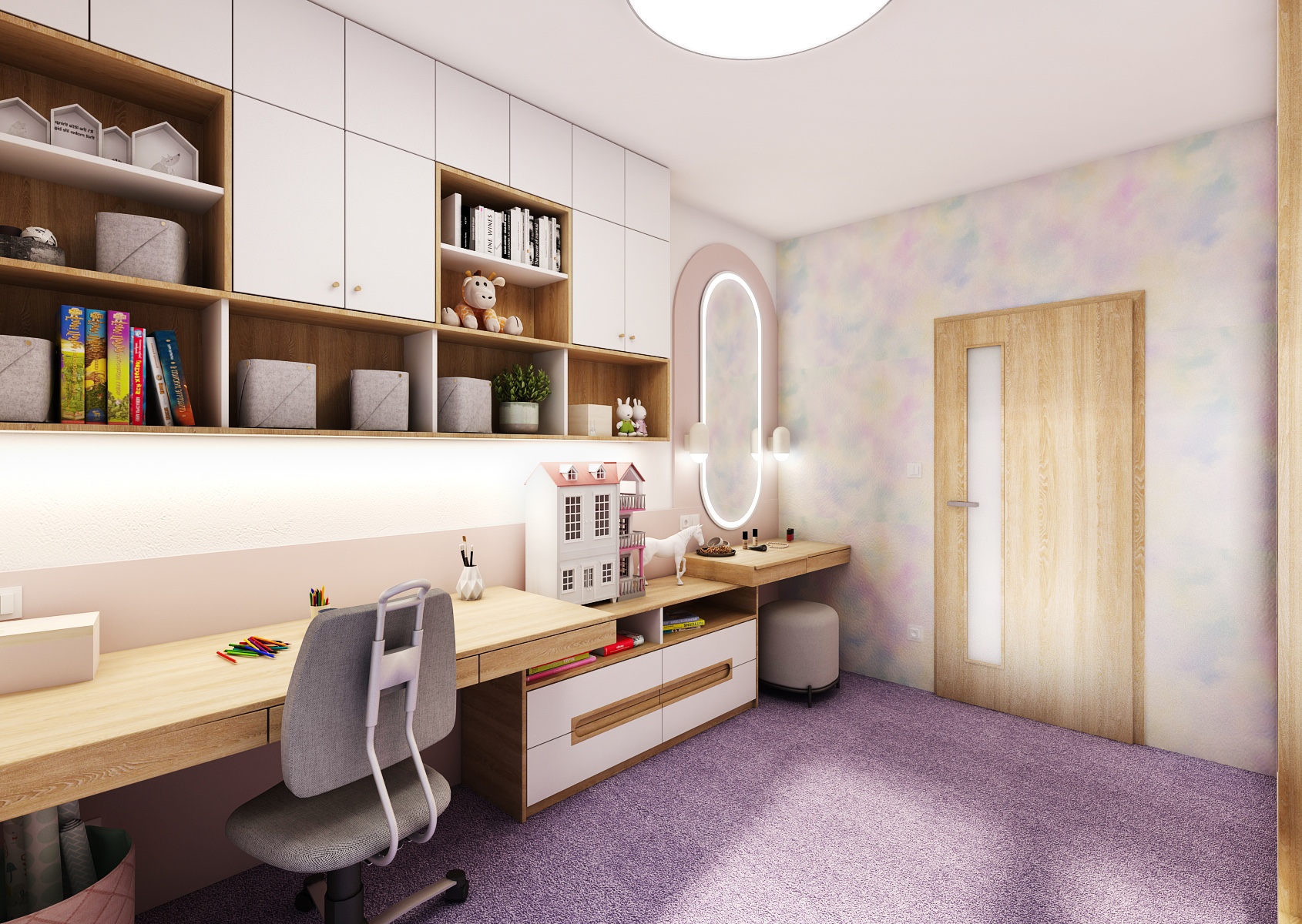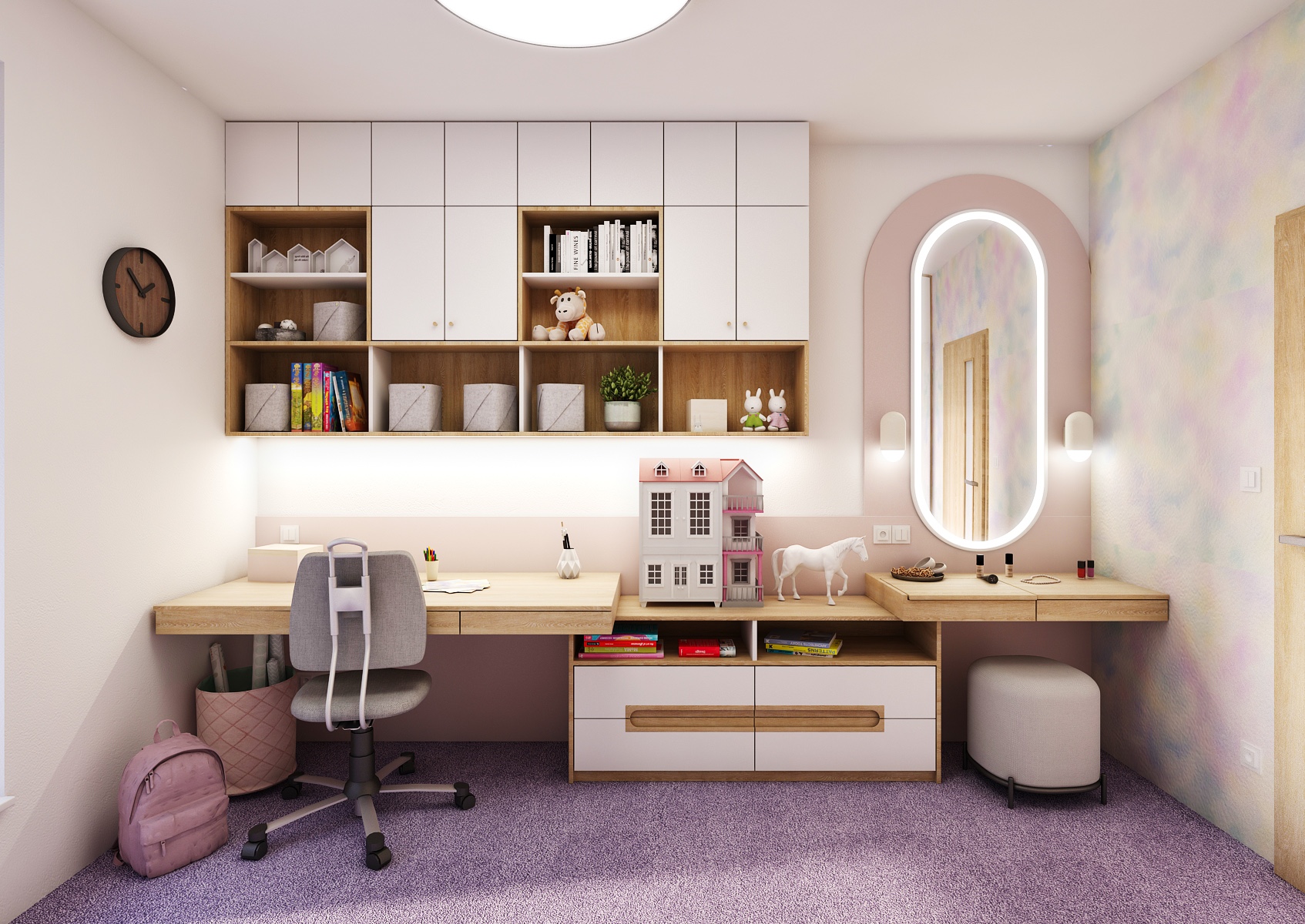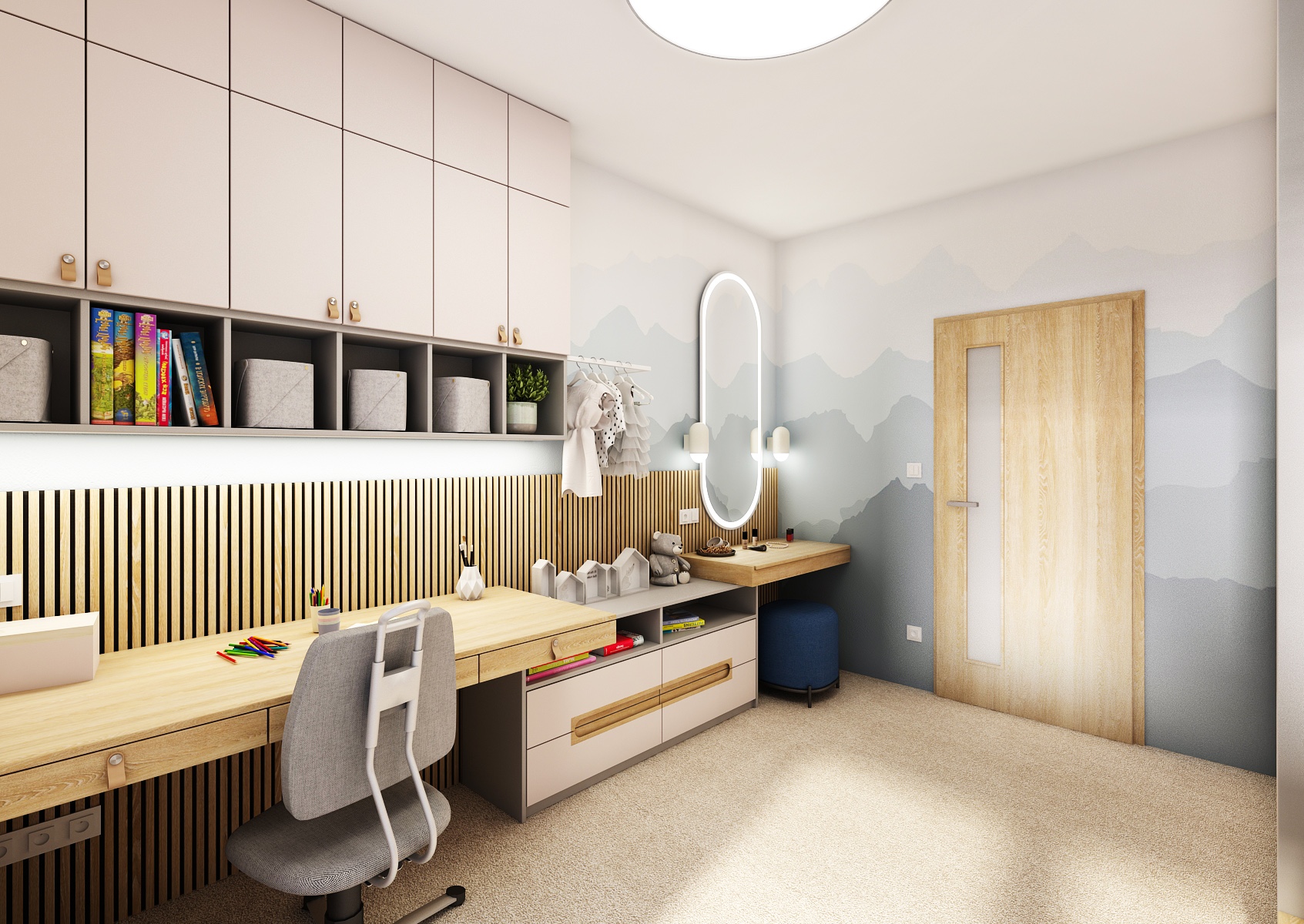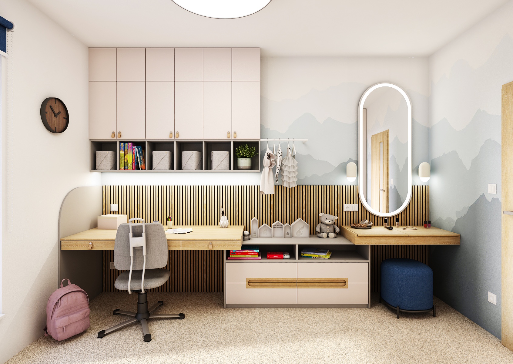 The second part of the room is dedicated to the study and game zone. A long desk along the wall offers plenty of space for creative activities, while above it there are closed cabinets and open shelves for storing school supplies and decorations. An interesting element is a modern round-shaped mirror with lighting, which gives the space an elegant touch. Wooden slats on the wall add texture to the space, contributing to the overall harmonious look of the room. Pastel colors and natural materials combine functionality and aesthetics, which creates a pleasant environment for the growth and development of the child.