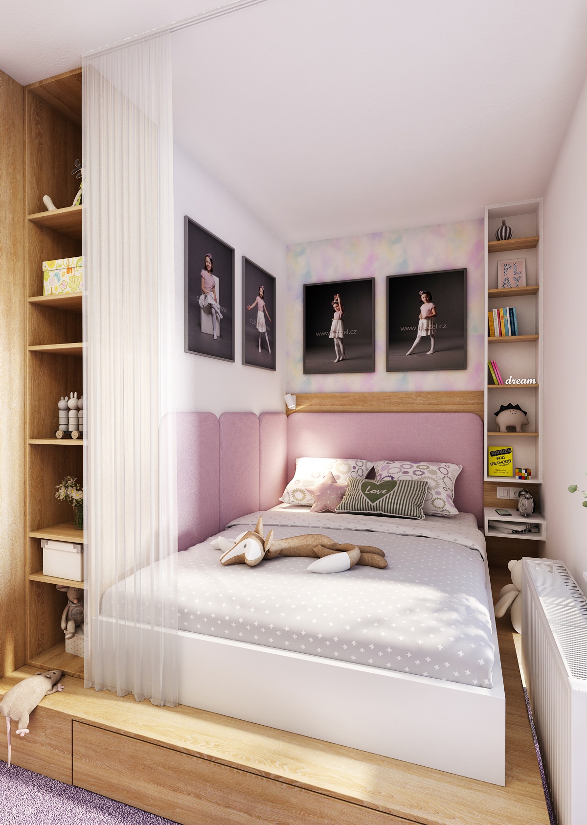 At first glance, the large window catches your eye, providing plenty of natural light and offering a view of nature, making the space visually larger and cozier. The bed is placed on a raised platform, thanks to which the space under the bed can be used as a storage space. There are built-in shelves and cabinets next to the bed, which helps keep the room organized and clean.