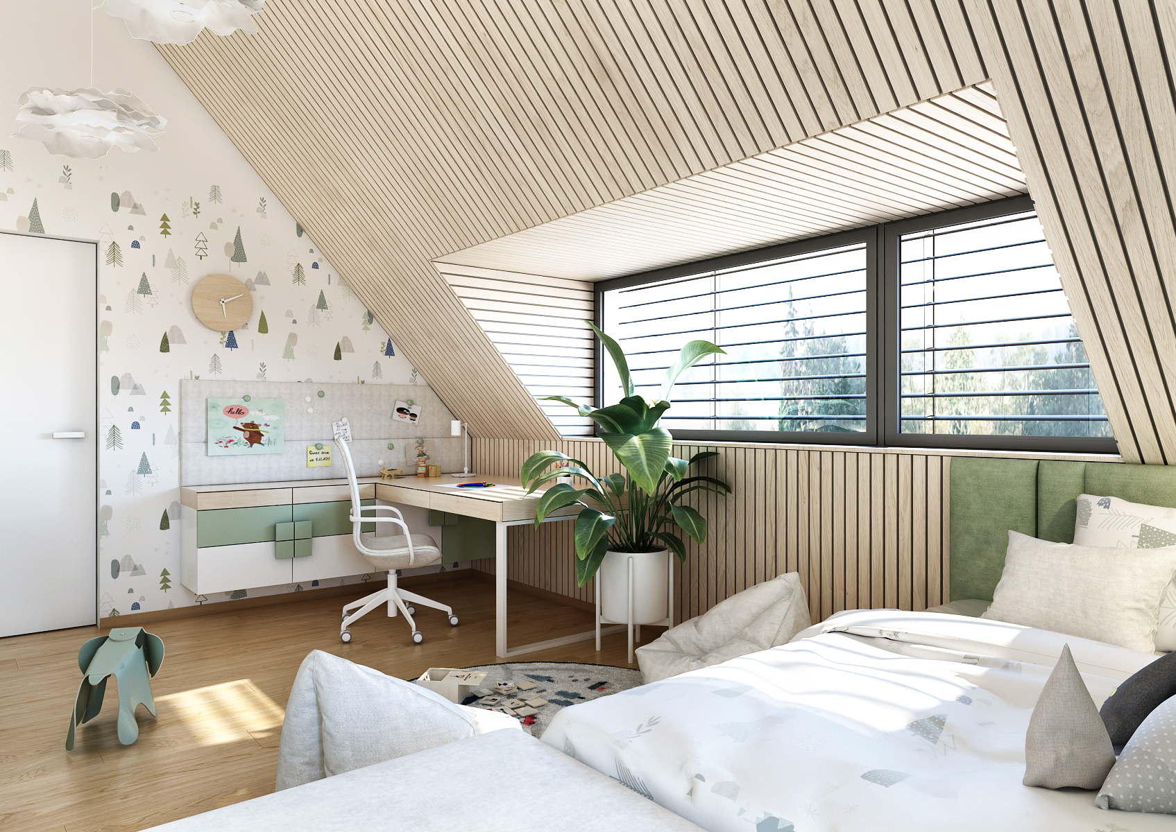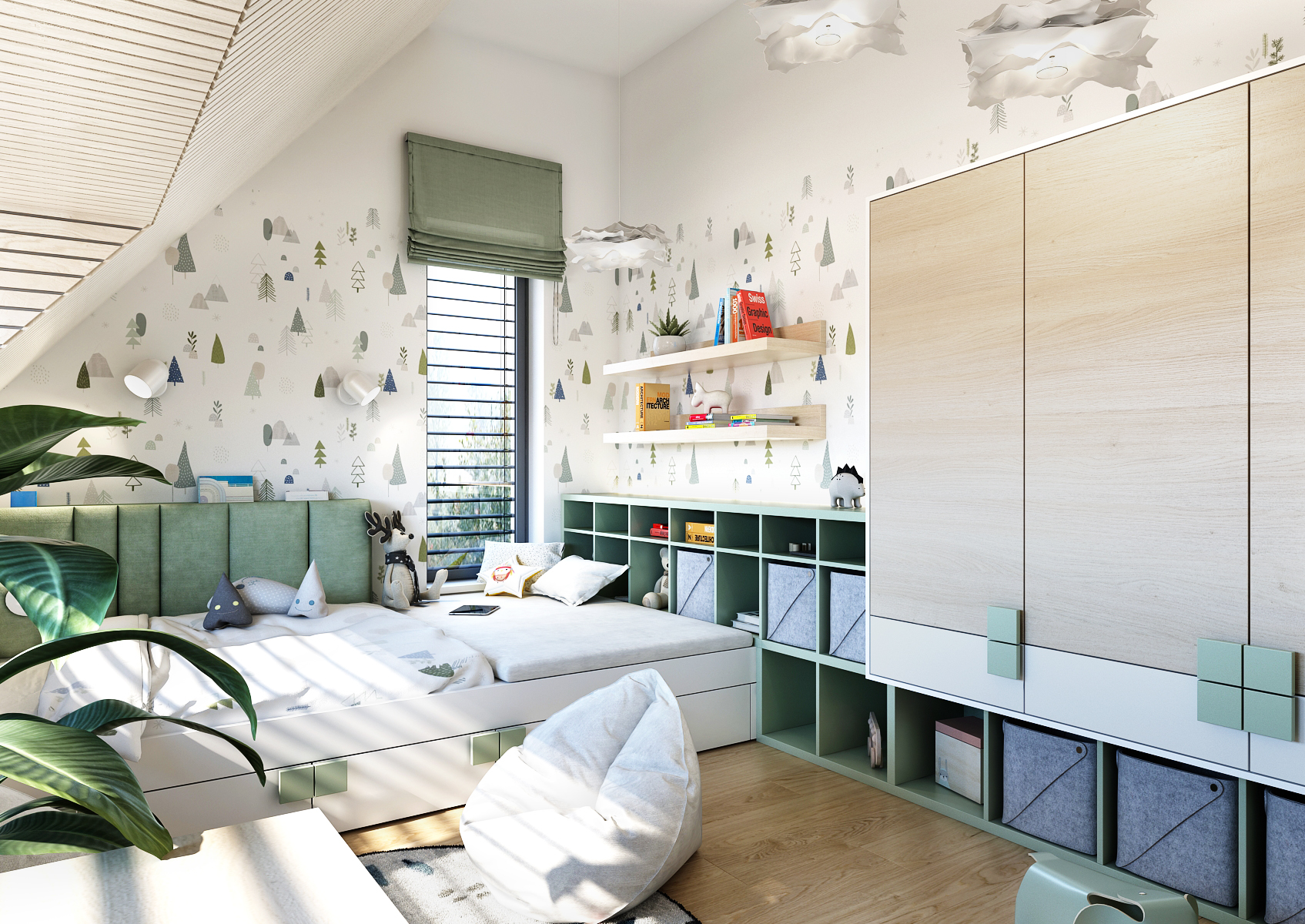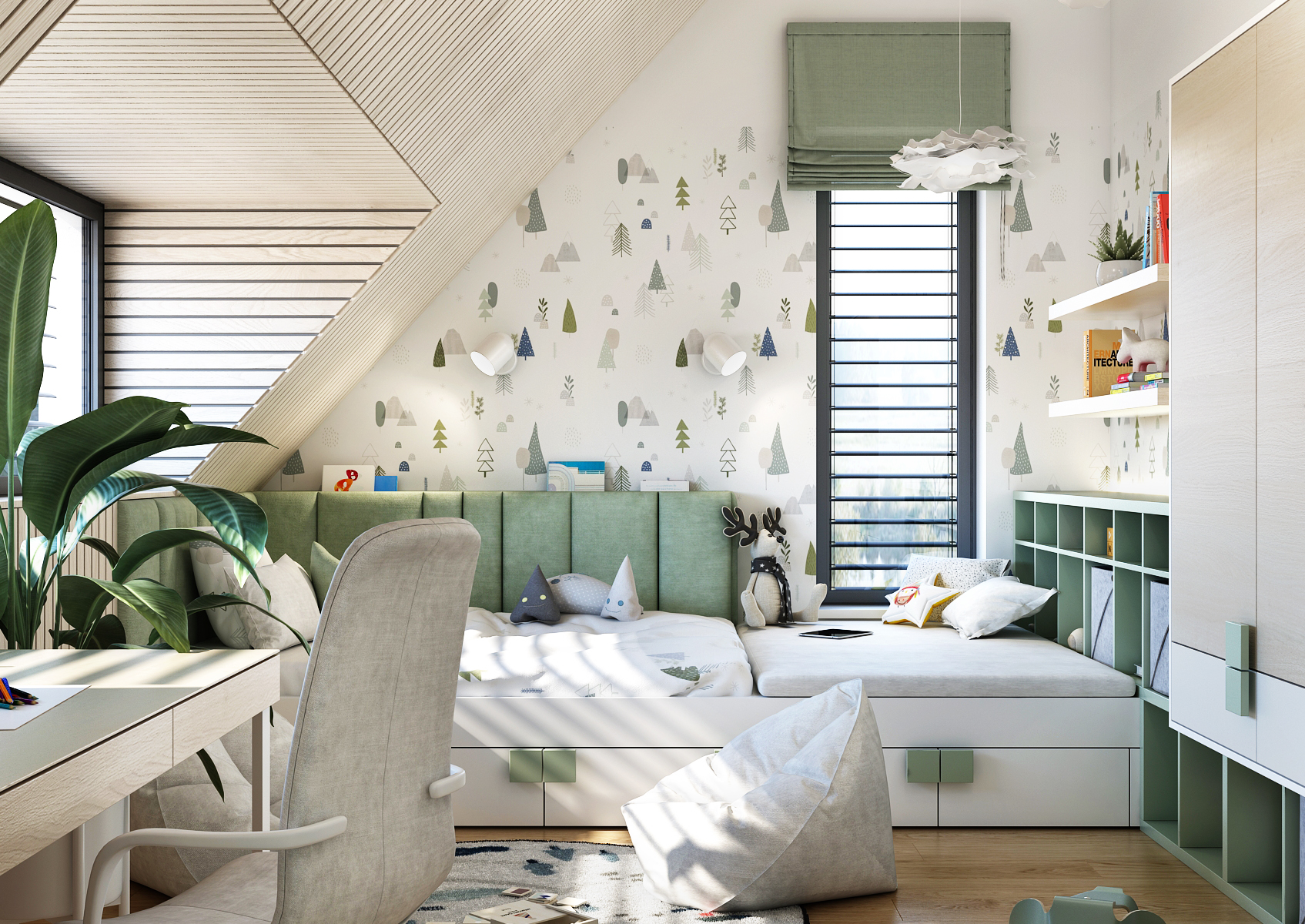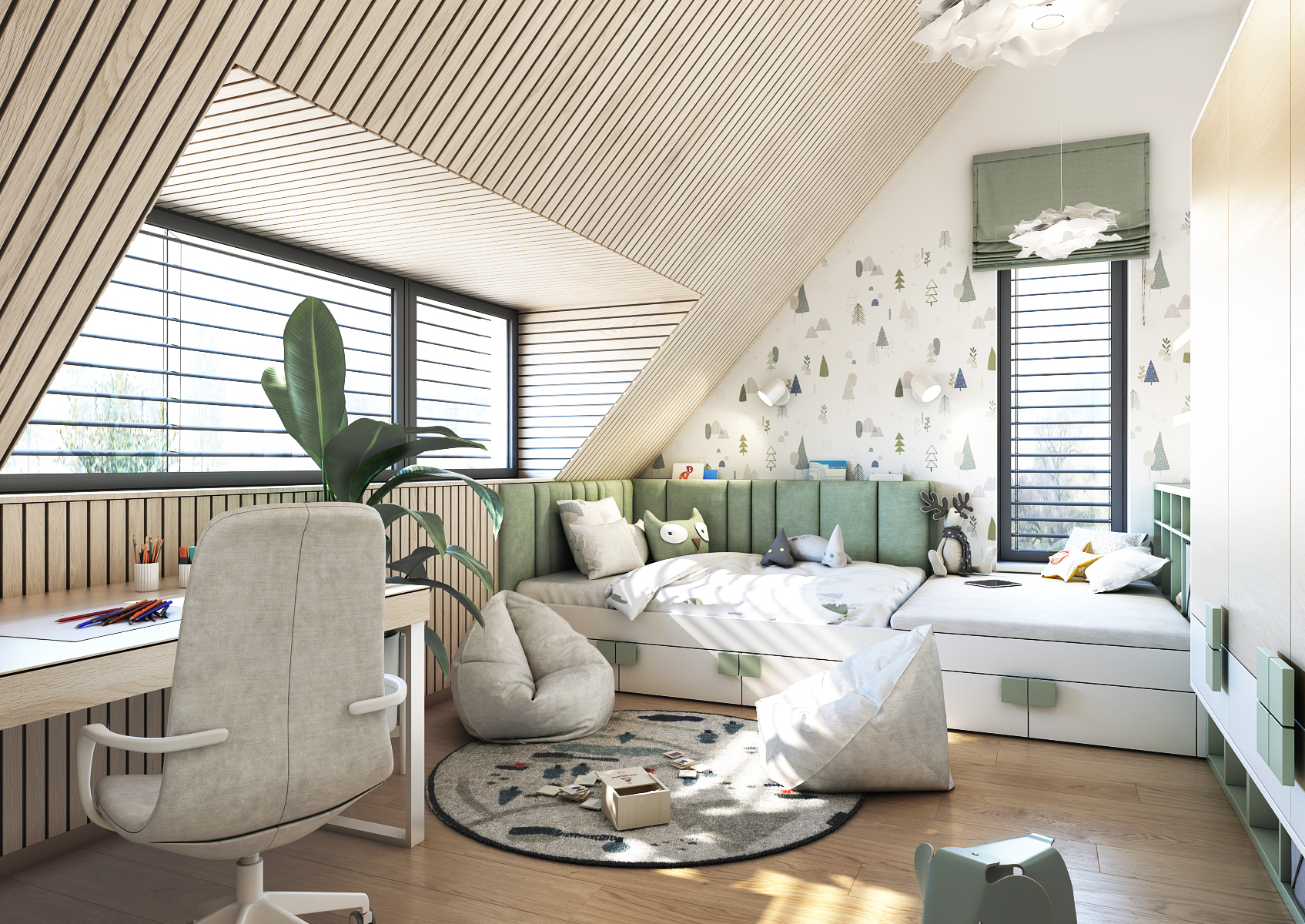 A cozy children's room with green accessories is located in the attic of the family wooden building.