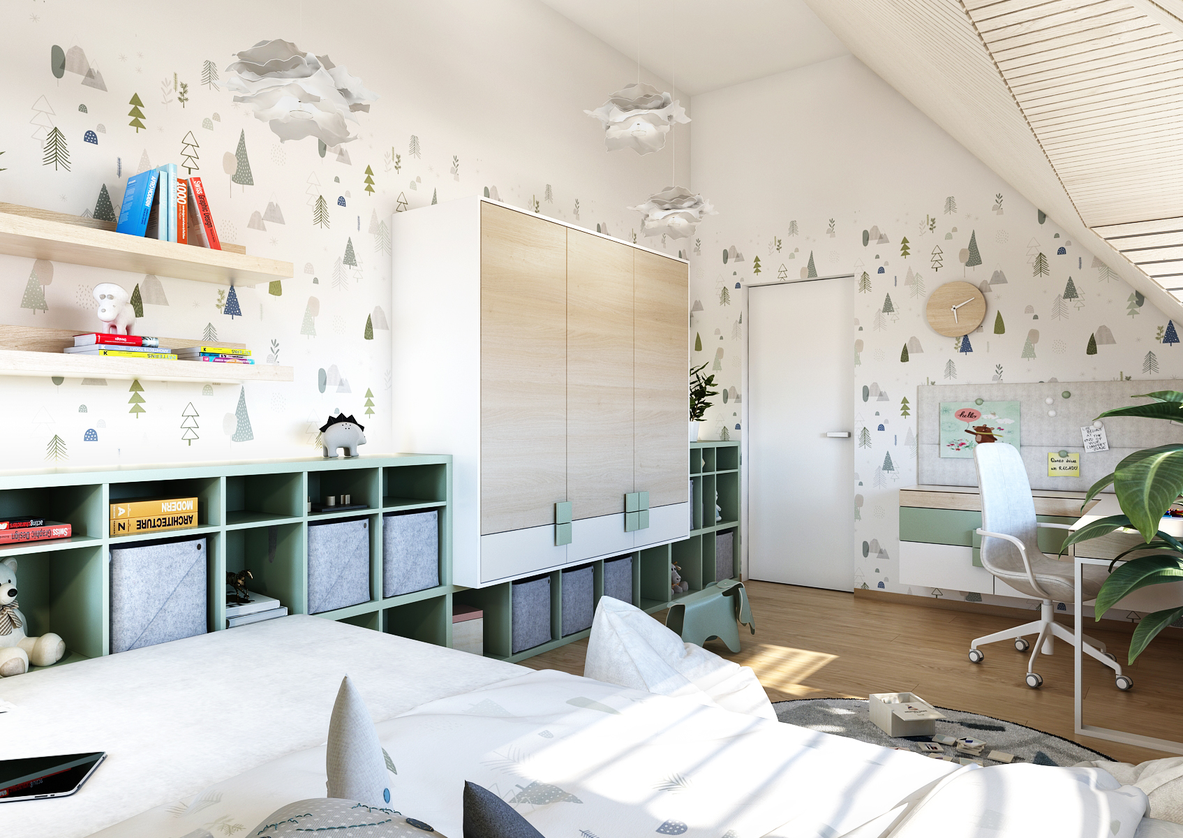 A bed with a corner desk is placed under a sloping ceiling with acoustic lining. A bed with an upholstered headboard that continues along the side wall to the window. A chaise longue is connected to the bed, which is connected to a wardrobe system with the option of both closed wardrobes and open storage space.