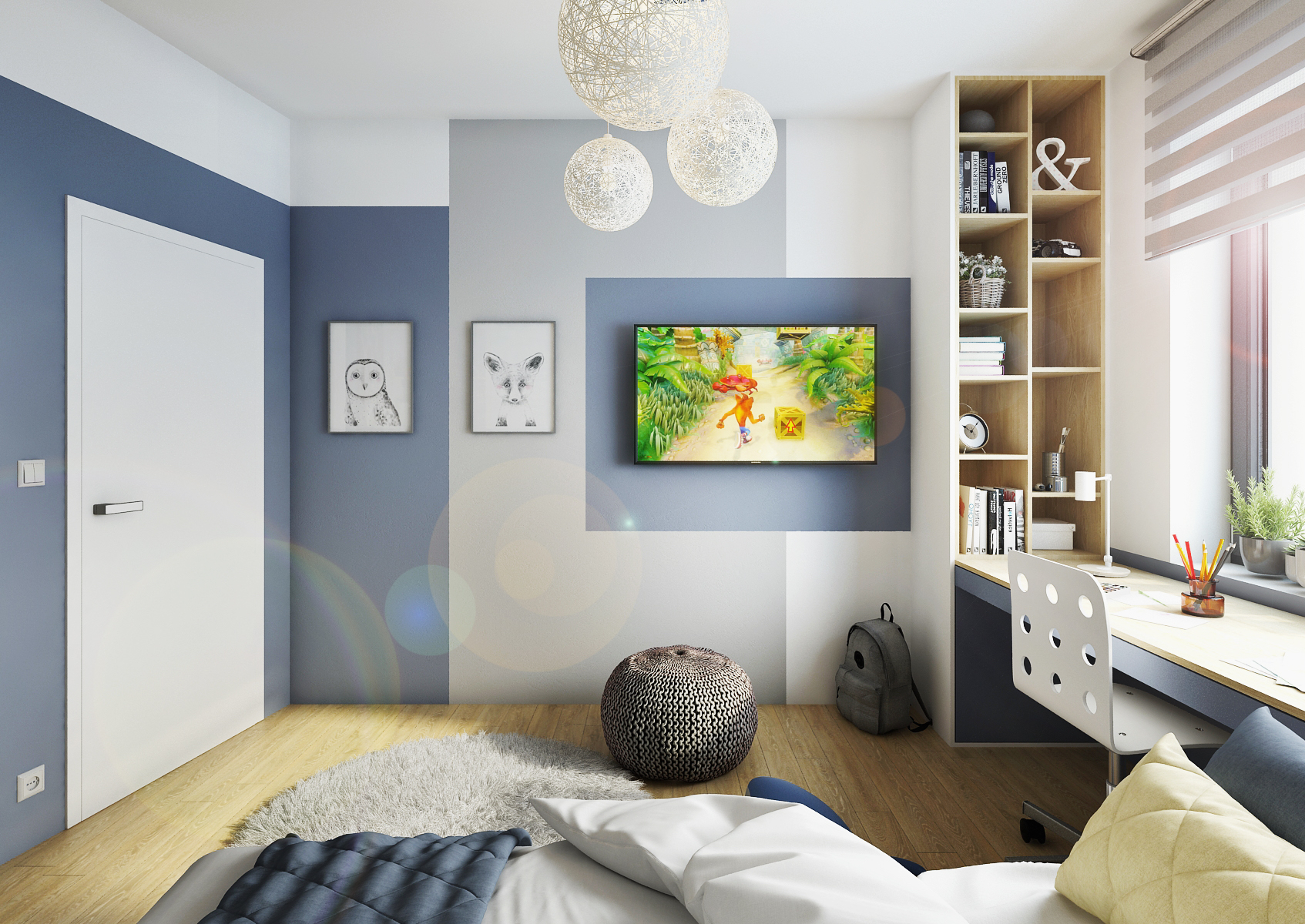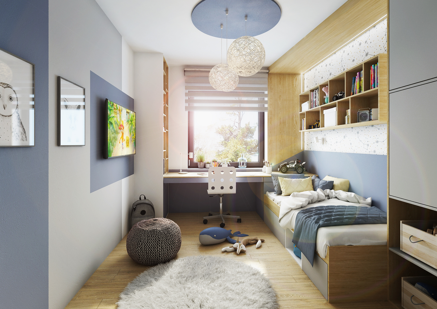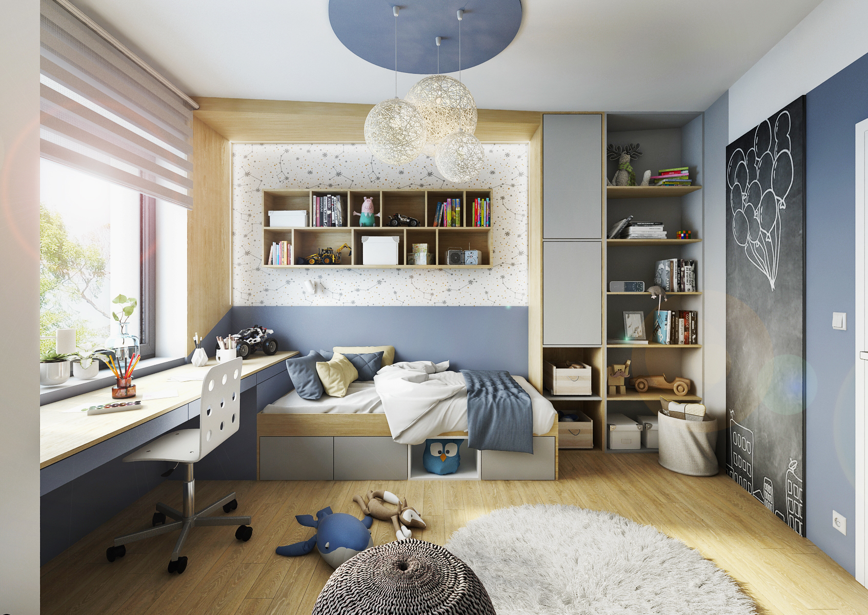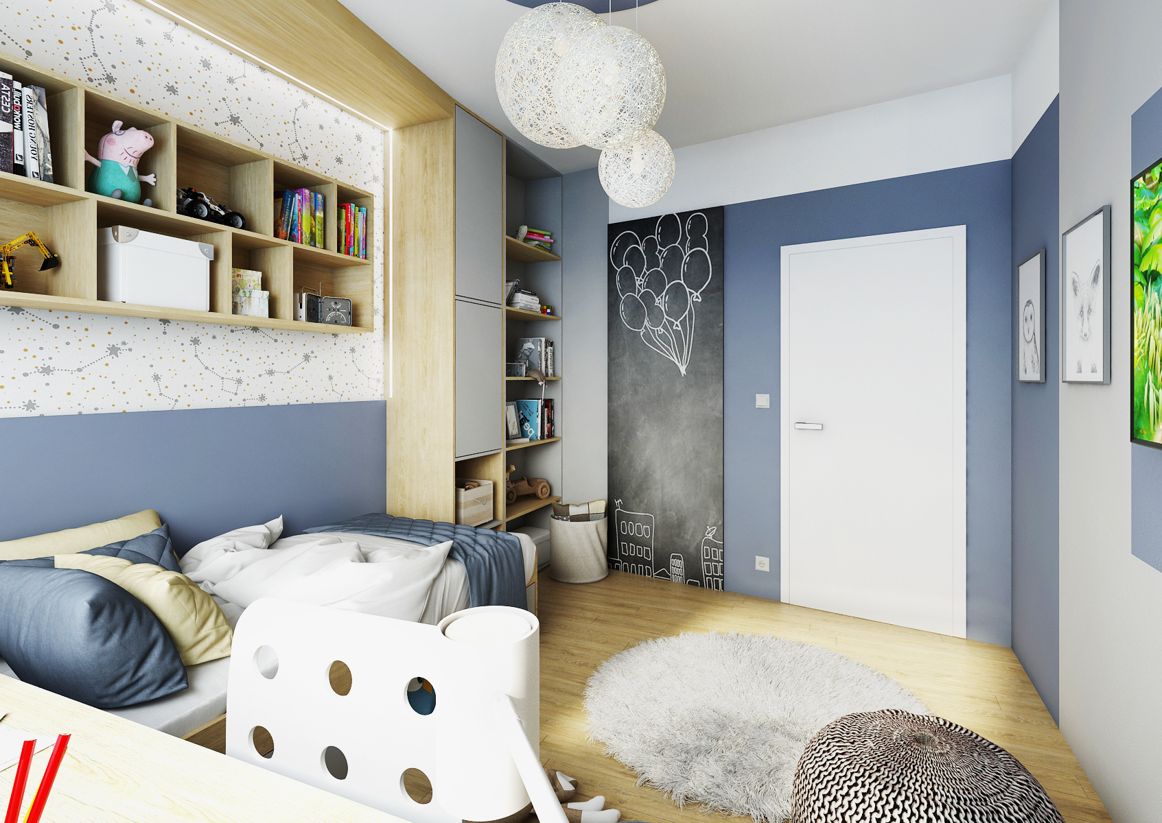 The boy's room is blue in combination with white wallpaper with a constellation pattern. The bed by the window is placed next to the desk in the alcove with wooden paneling and ambient lighting. A built-in cabinet with open and closed storage space is connected to the cladding.
