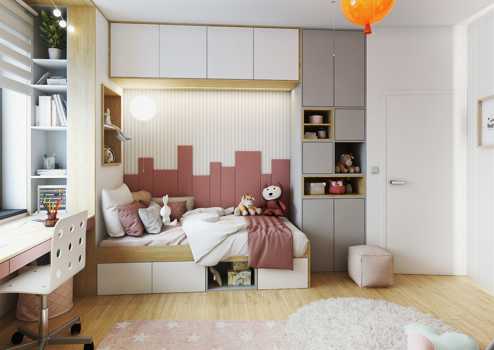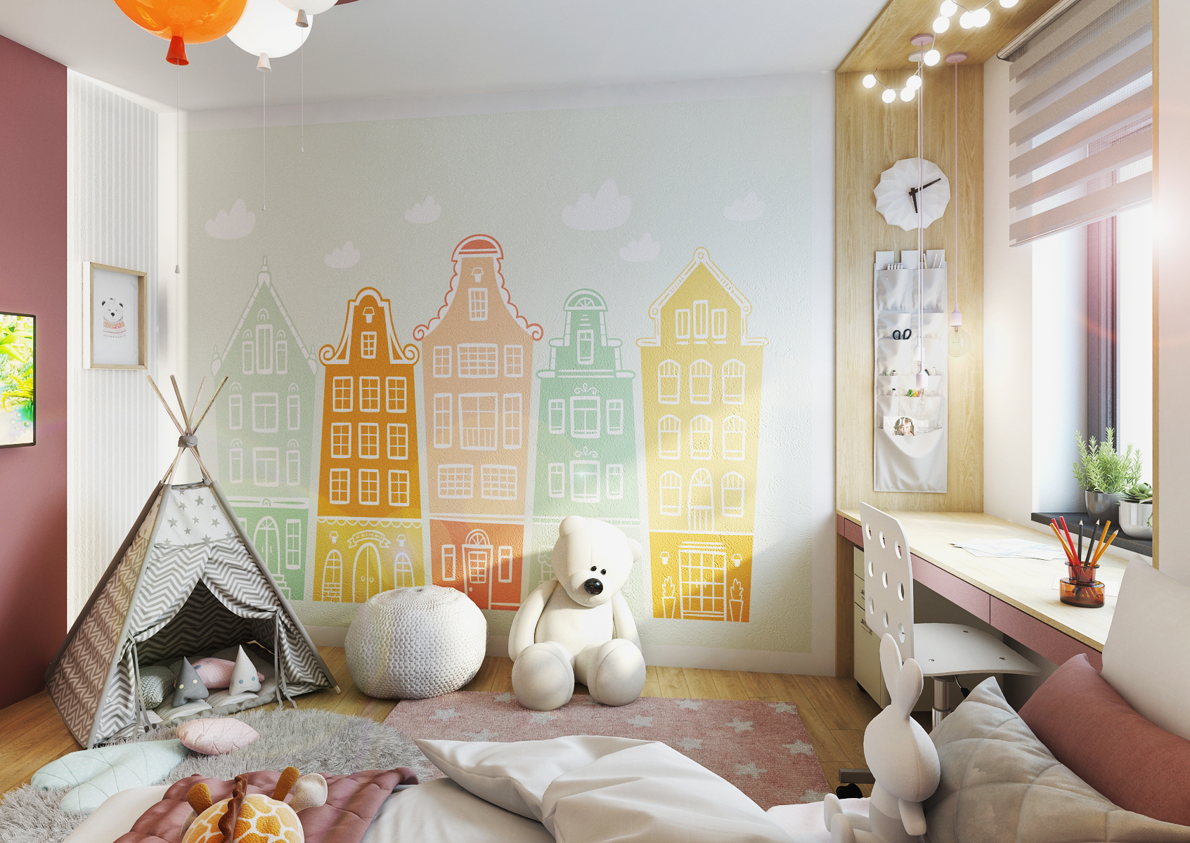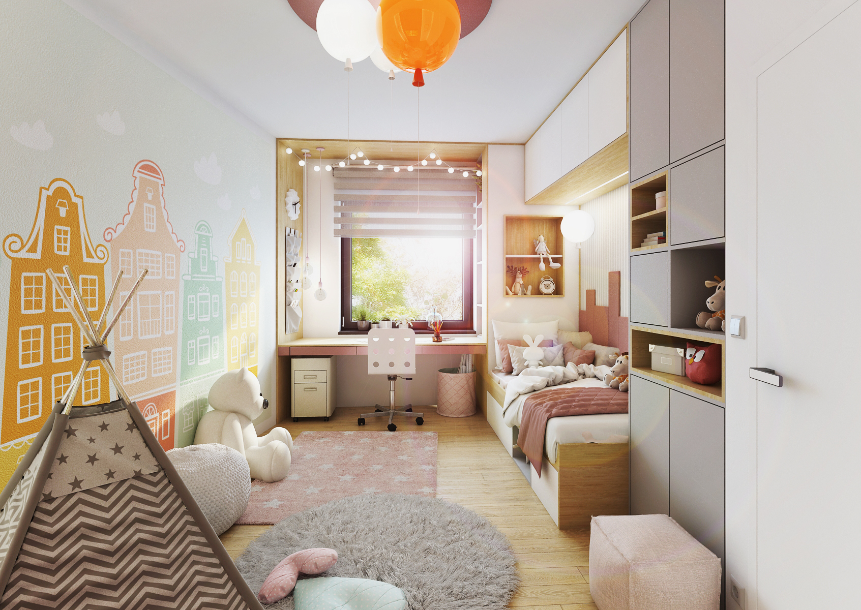 The girl's room is furnished in a similar style to the boy's room, but shades of pink dominate here together with the wallpaper of colorful houses. An interesting element is also the lighting, which is in the form of inflatable balloons.