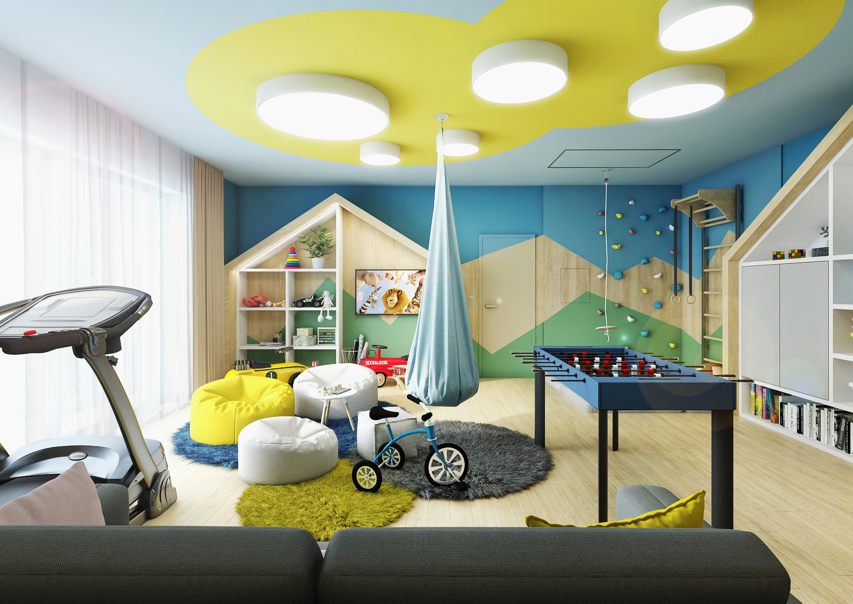 At first glance, the game room already plays with all colors, there are shades of blue, green and yellow. The space is dominated by a house structure with built-in wardrobes, shelves and a seating area with LED lighting. There is also a sofa, bean bags, table football or a climbing wall.