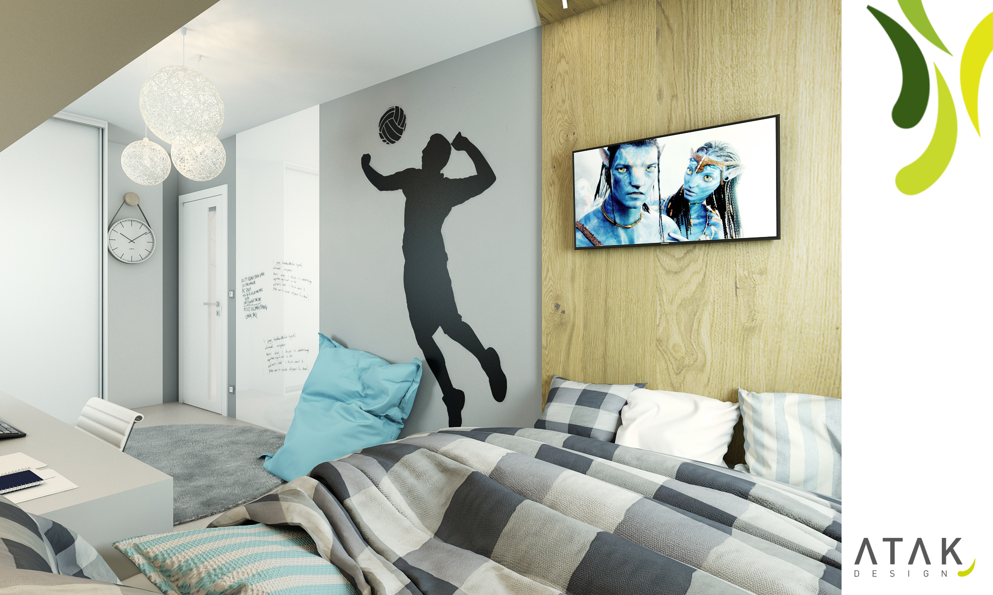 The older son’s bedroom is a combination of gray and white with wood decor in the formo f paneling around the bed with backlight. The wall is variegated with a black wall sticker of a football player and a white washable painting. The child has the opportunity to intervene in the design and improve the room at their discretion.