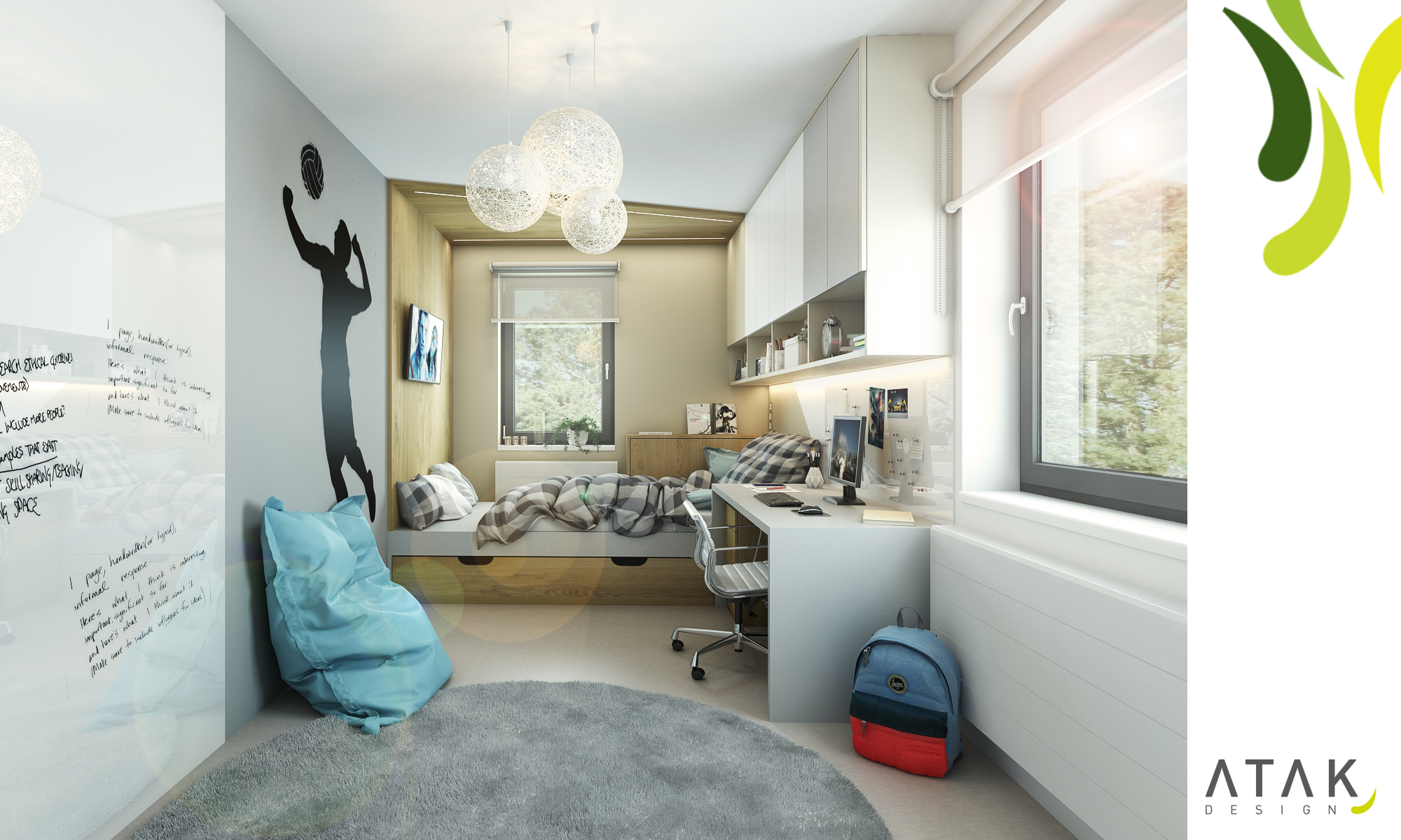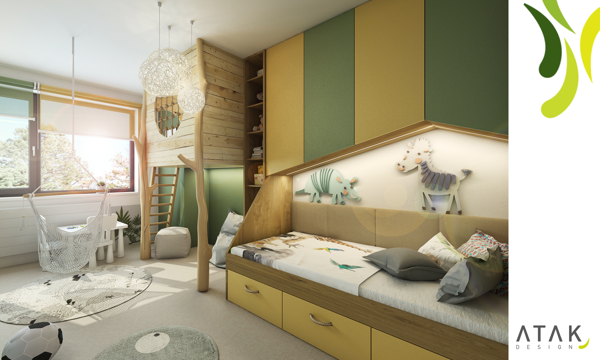 The room for smaller boy is designed in a more playful style with a jungle motif. In the middle of the room is a hammock, the walls and furniture are decorated in shades of green or white the addition of yellow, and no good adventurer can miss his own tree house and storage space with padding for seating. There are 3D animal stickers on the walls to enliven the space.