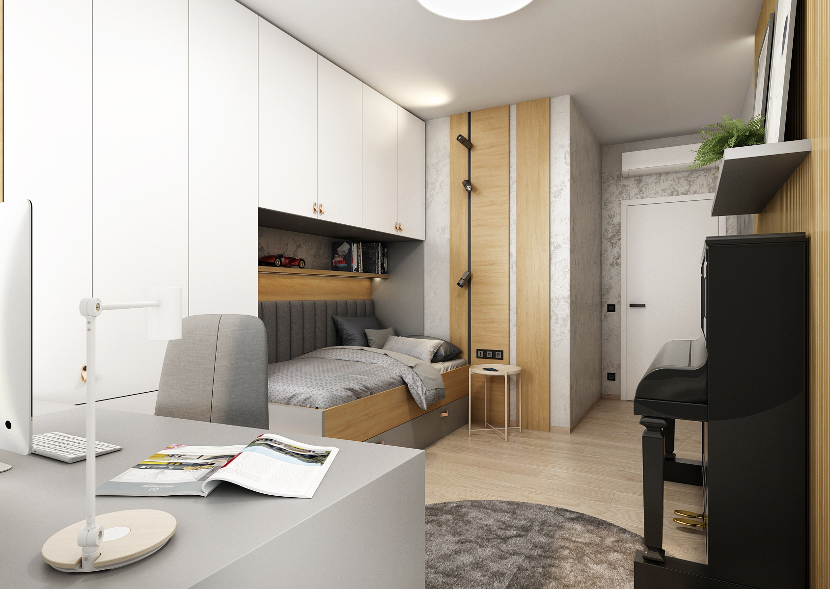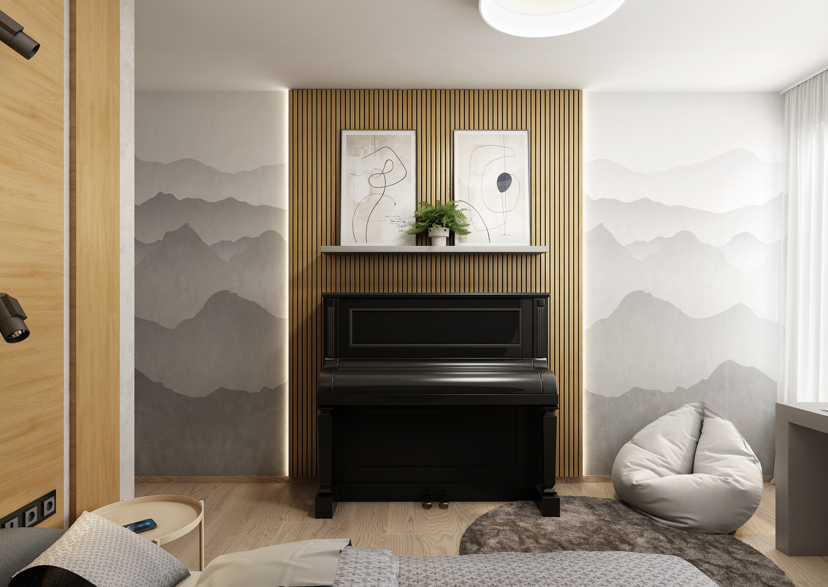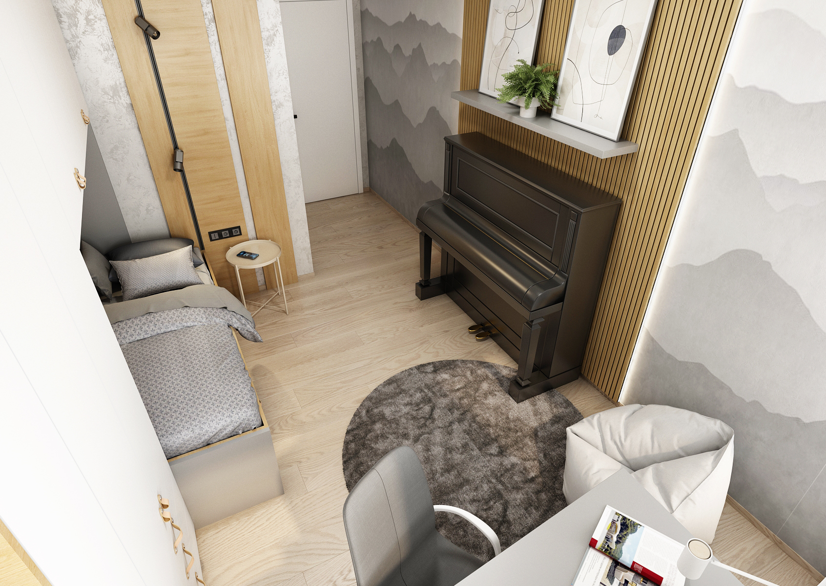 The first variant offers a built-in wardrobe with a cut-out for the bed, which also offers storage space in the lower part of the structure. A gray desk is connected to the wardrobe under the window. An interesting element is not only the oak wall panels with reflectors by the bed, but also the piano placed against the free wall with acoustic lamella cladding and backlighting. Another variation is wallpaper with a motif reminiscent of mountains and a concrete trowel.