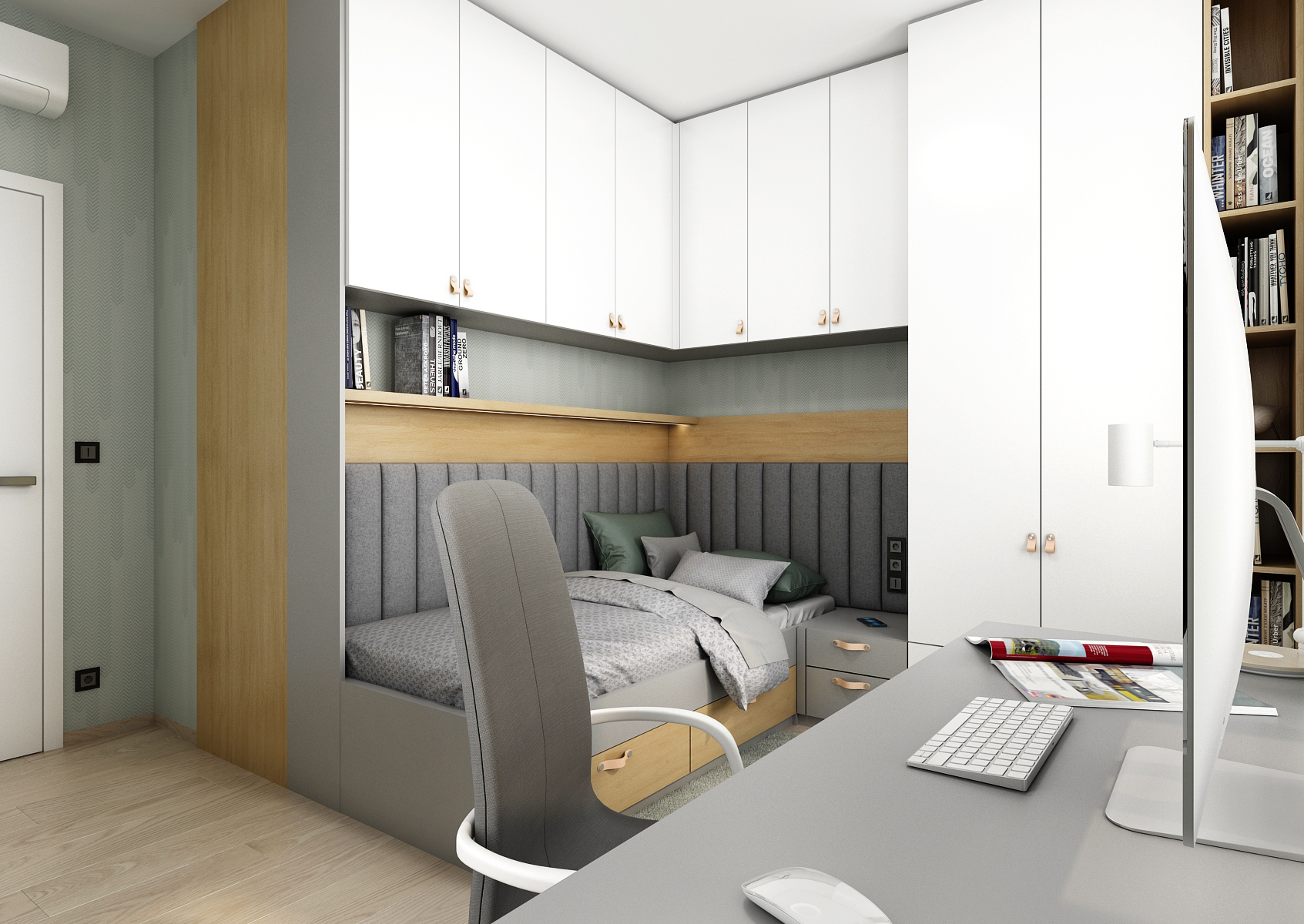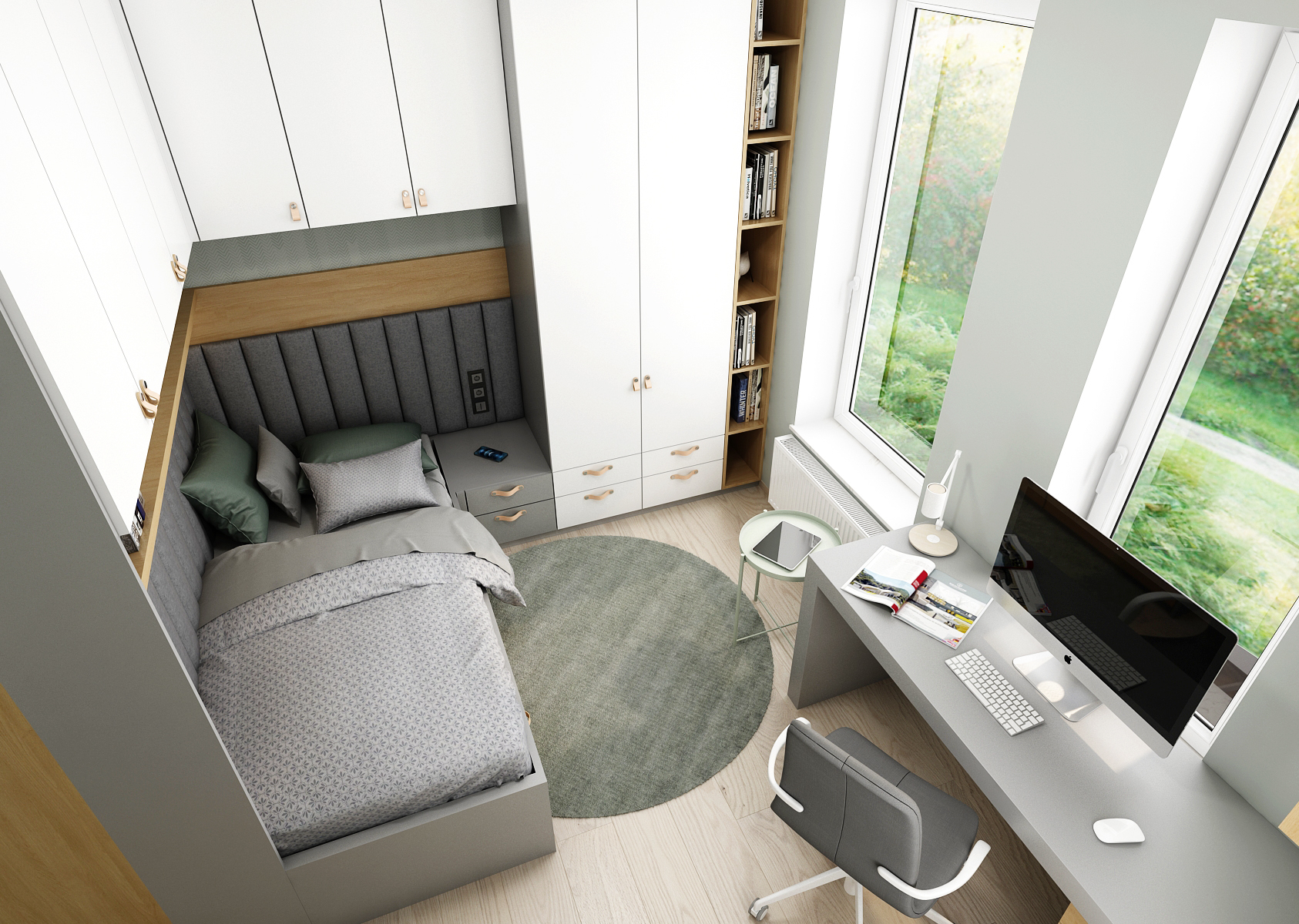The second room is designed very similarly to the previous option. In this case, the built-in wardrobe surrounds the room from two sides, when the bed is placed in the corner niche. There is also ambient lighting and a desk located in the other corner of the room near the windows, thanks to which the workplace receives enough natural light.