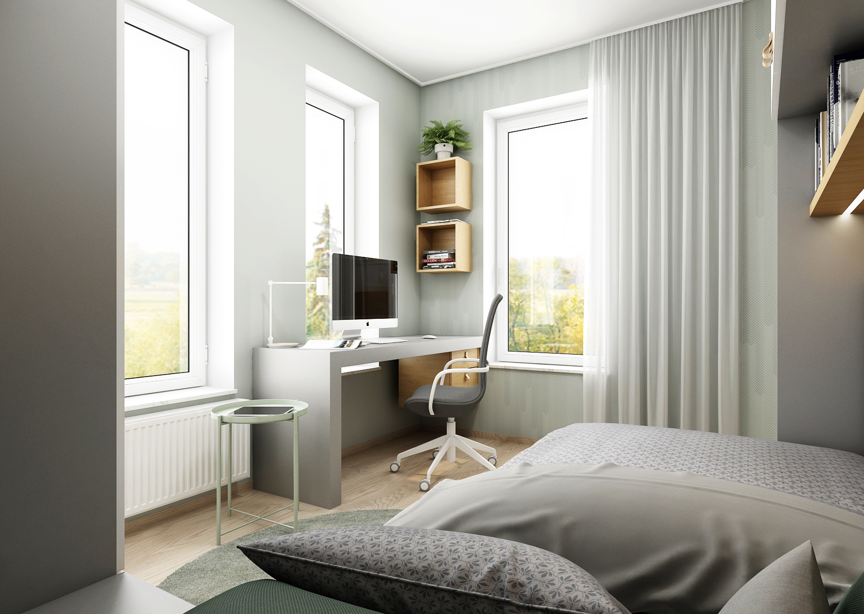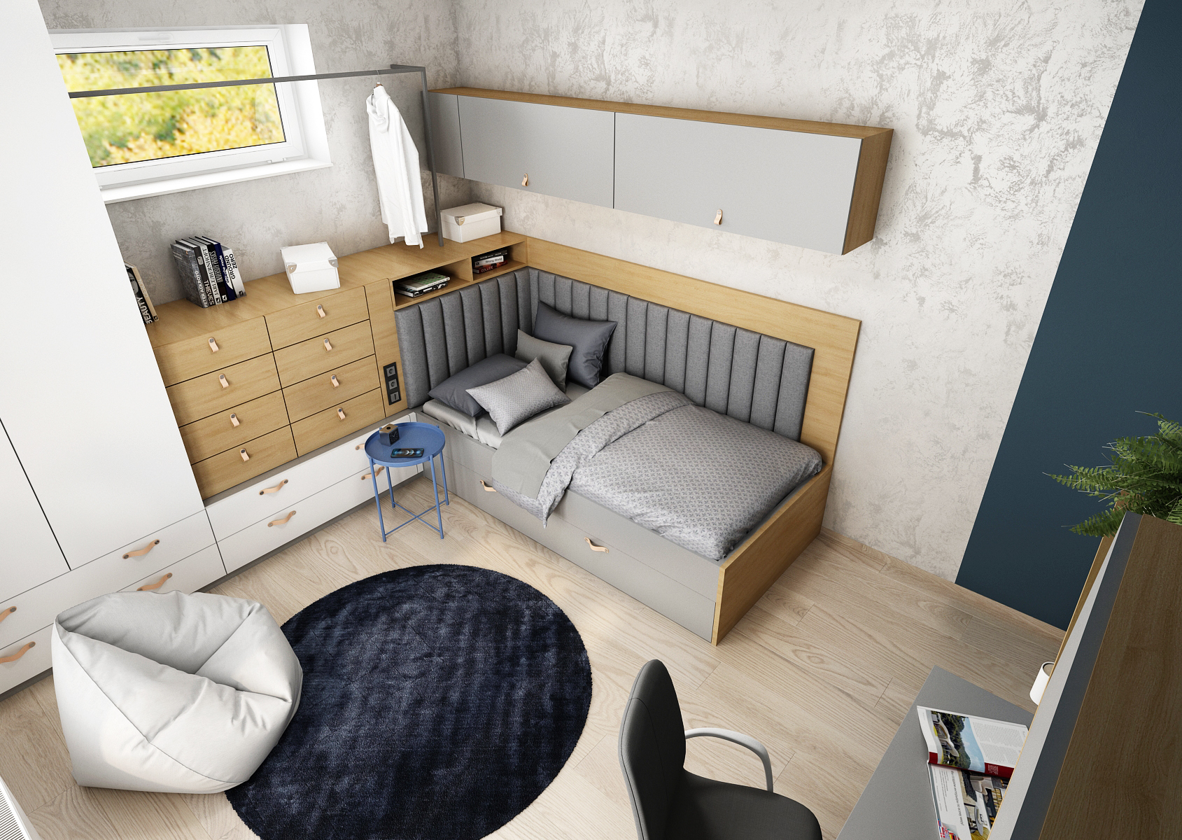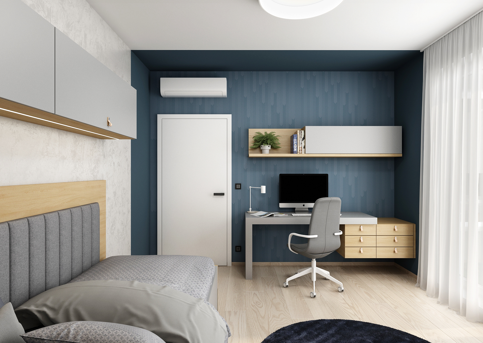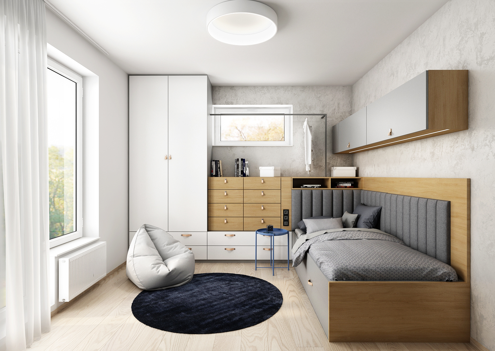 In addition to a built-in wardrobe with a bed, the last student room also offers a clothes rail for hanging clothes above the head of the bed. The desk is located in a part of the room painted in navy blue, which is here combined with a light squeegee.
