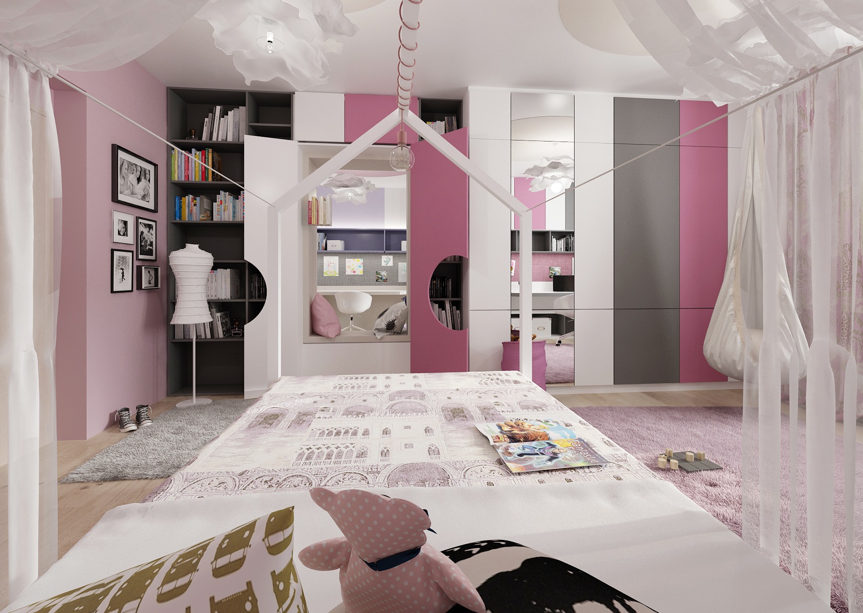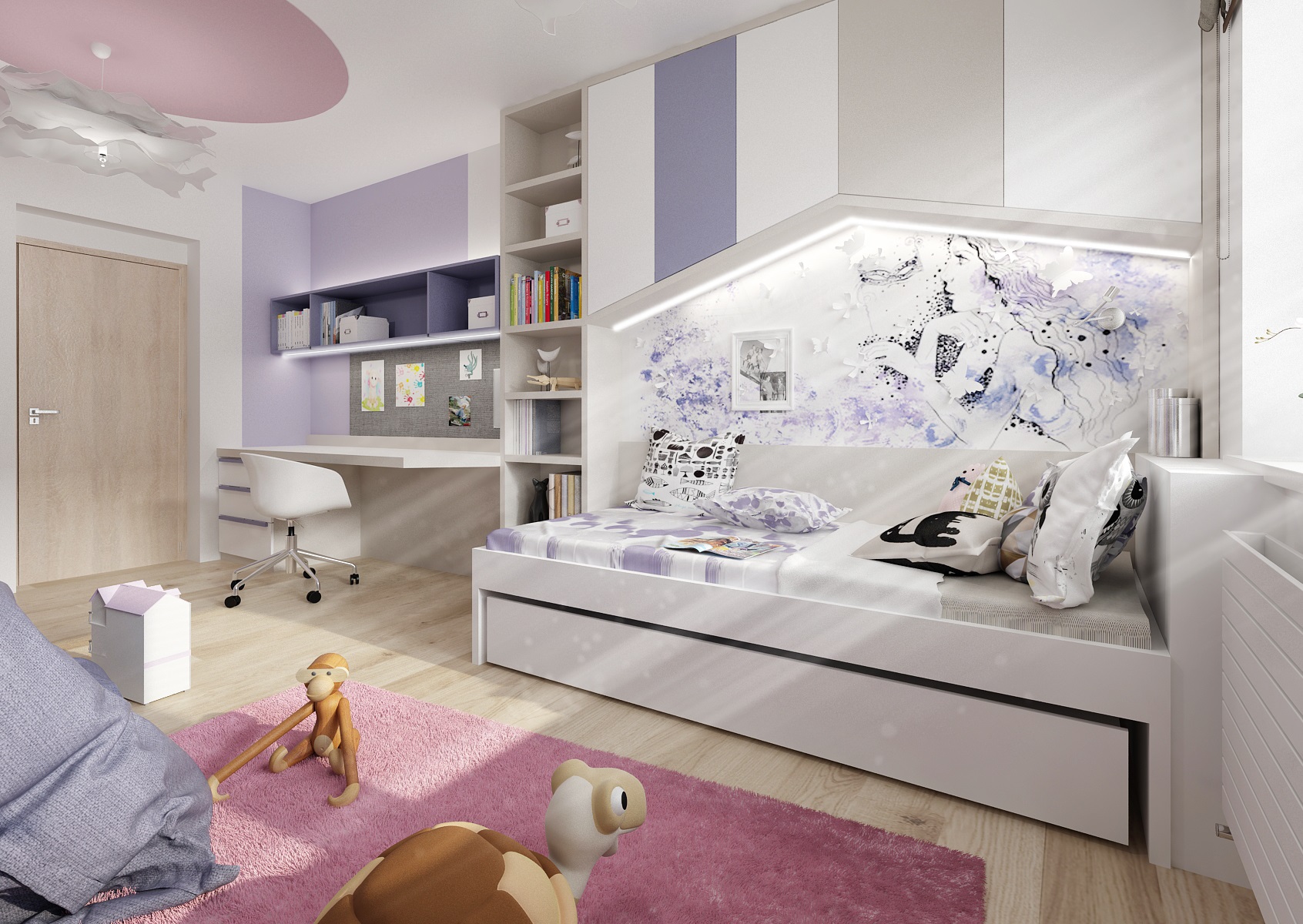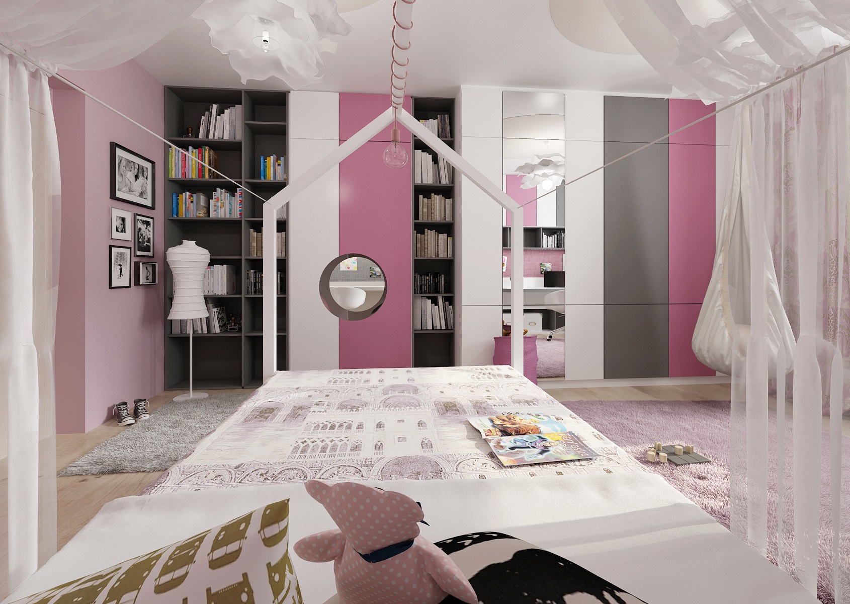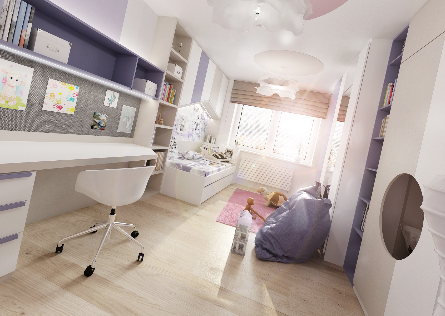 Two rooms for two sisters are interconnected with a „secret“ passage through the closets. The older girl’s larger room allowed the bed to be placed perpendicular to the space. Above the bed is a frame construction made of solid in the shape of roof with a fine canopy. The basic color of the room is white, finished in pink and gray. For a younger girl is the roof above the bed made of a wardrobe set The color of the room is slightly different, the accent of purple and beige was added to the white , with a drop of pink. The wallpapers are styled according to the girl’s wishes and printed to measure. The furniture i salso made to measure from laminated boards with an ABS edge, with a matt surface.
