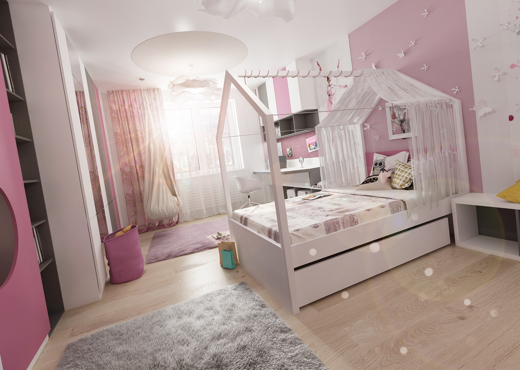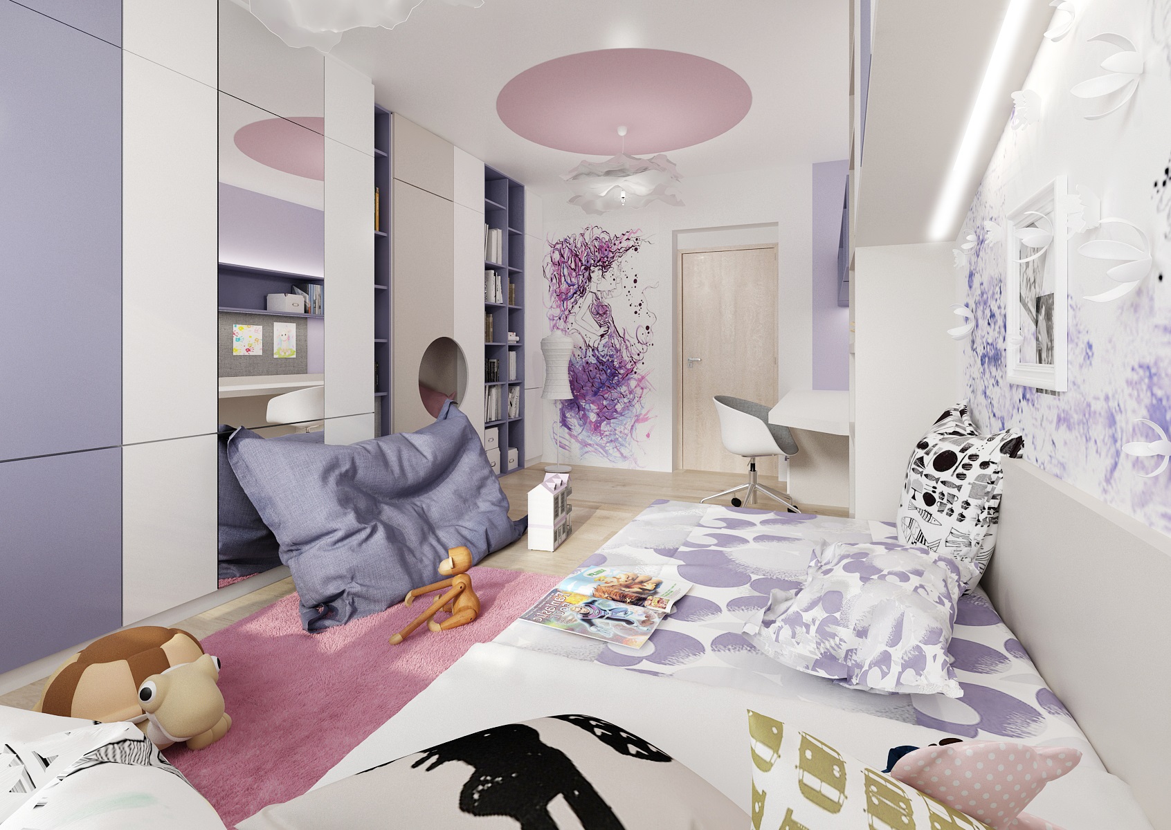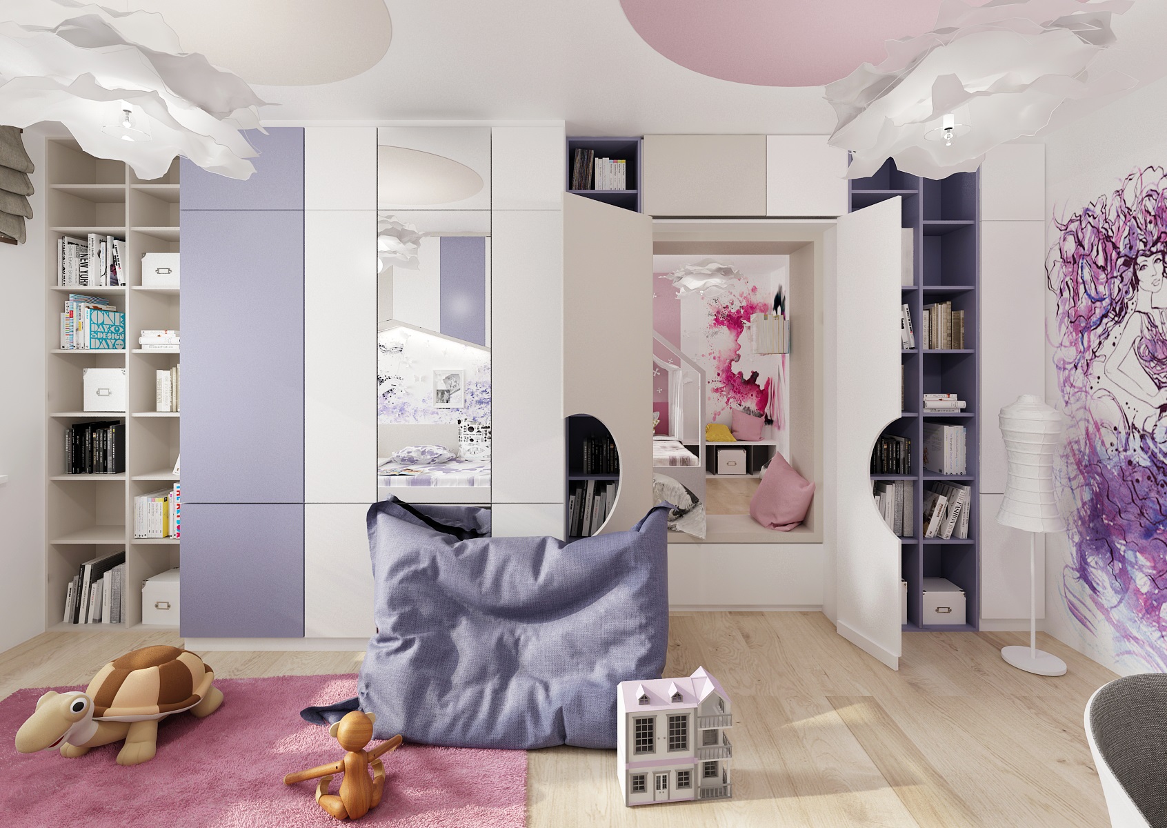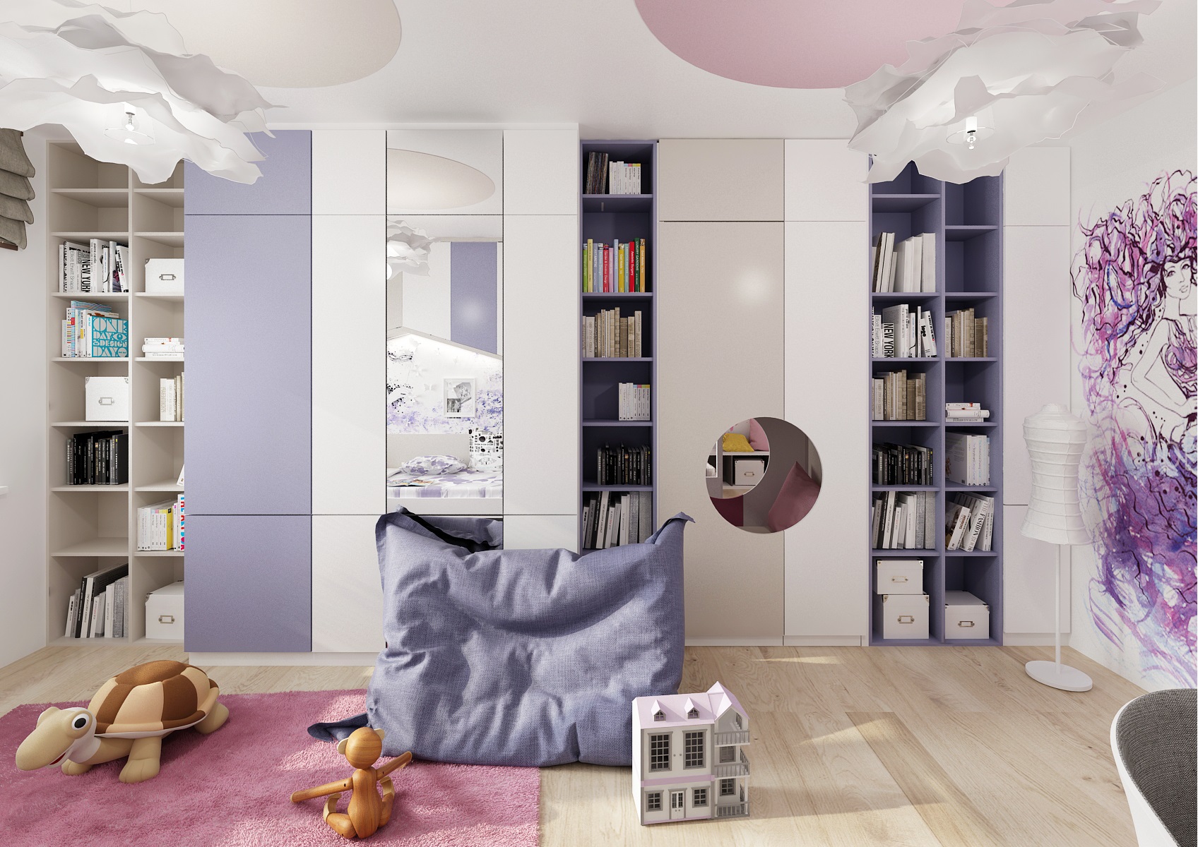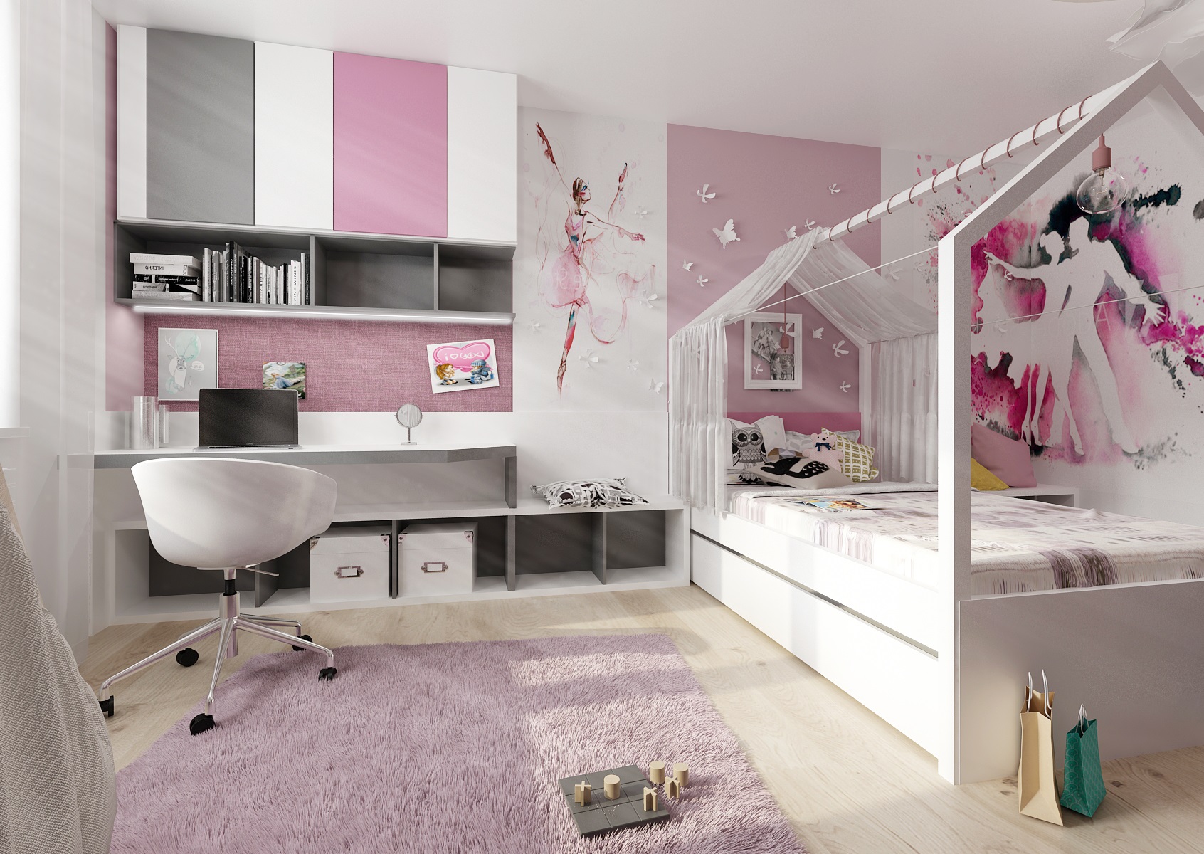 Two rooms for two sisters are interconnected with a „secret“ passage through the closets. The older girl’s larger room allowed the bed to be placed perpendicular to the space. Above the bed is a frame construction made of solid in the shape of roof with a fine canopy. The basic color of the room is white, finished in pink and gray. For a younger girl is the roof above the bed made of a wardrobe set The color of the room is slightly different, the accent of purple and beige was added to the white , with a drop of pink. The wallpapers are styled according to the girl’s wishes and printed to measure. The furniture i salso made to measure from laminated boards with an ABS edge, with a matt surface.