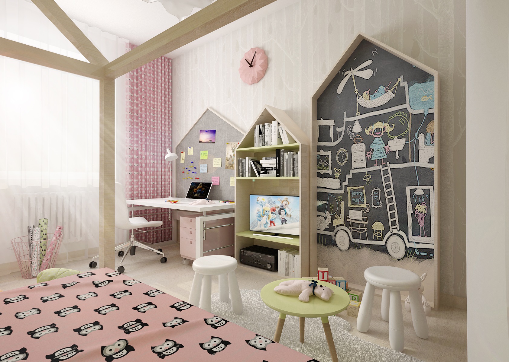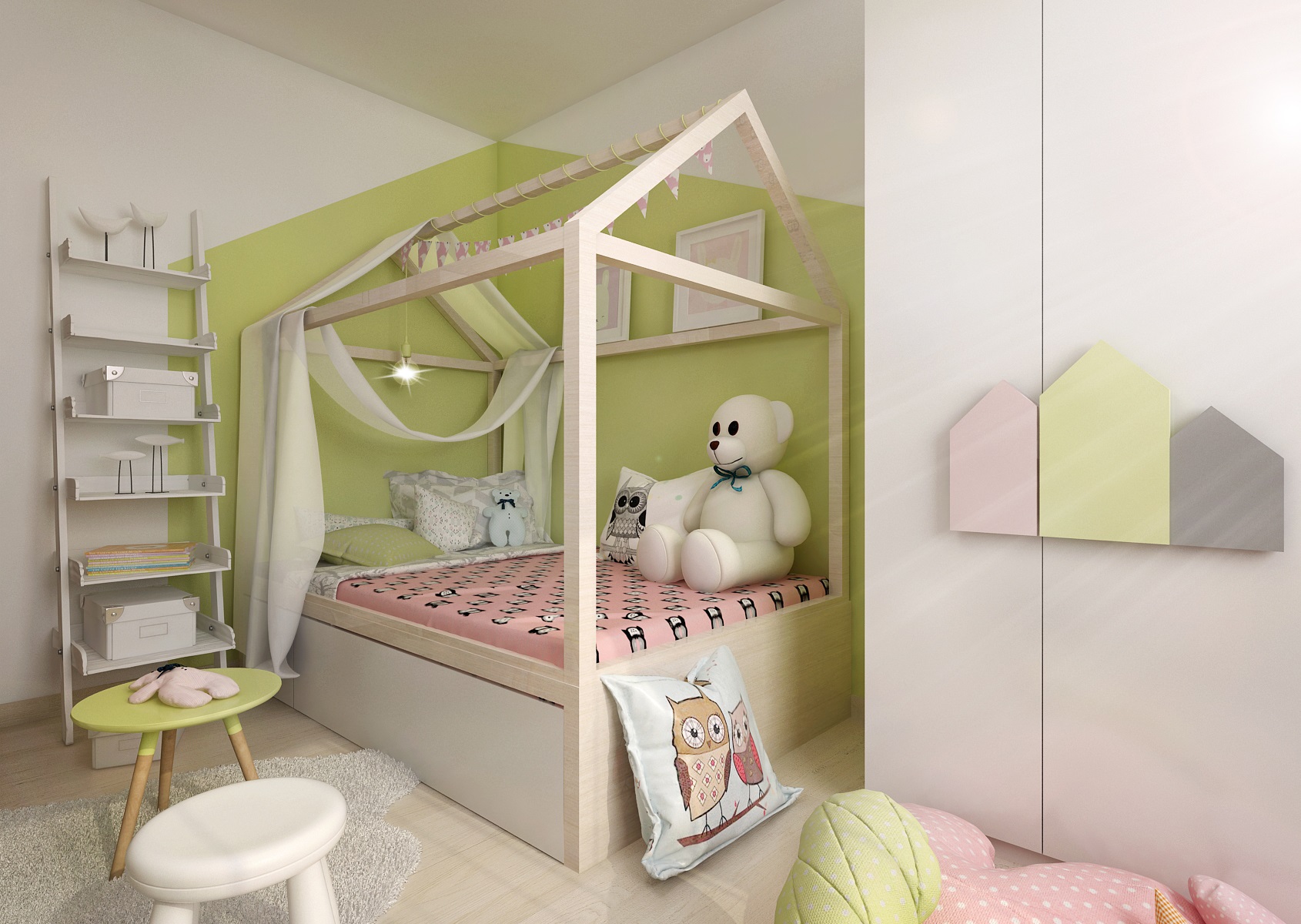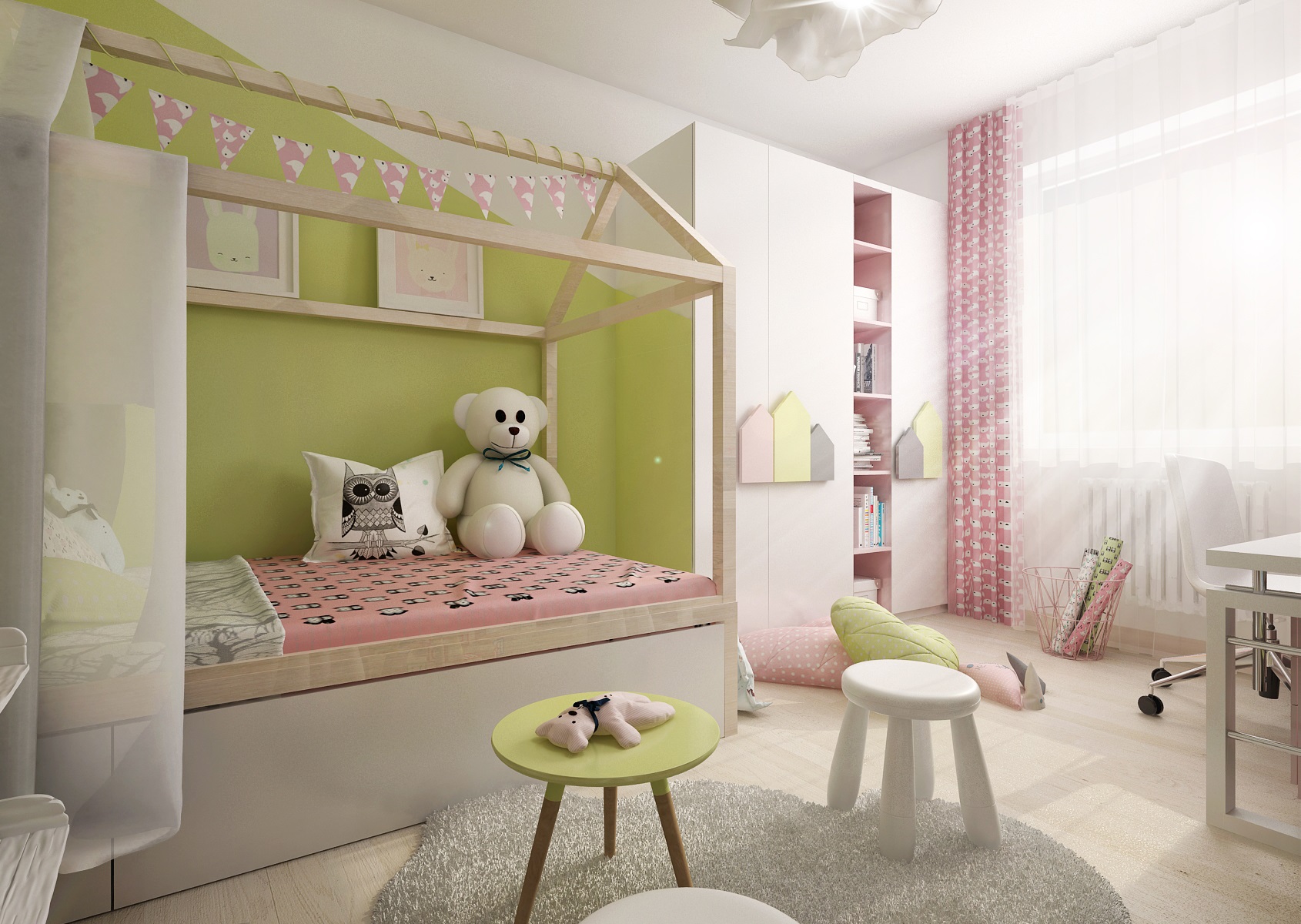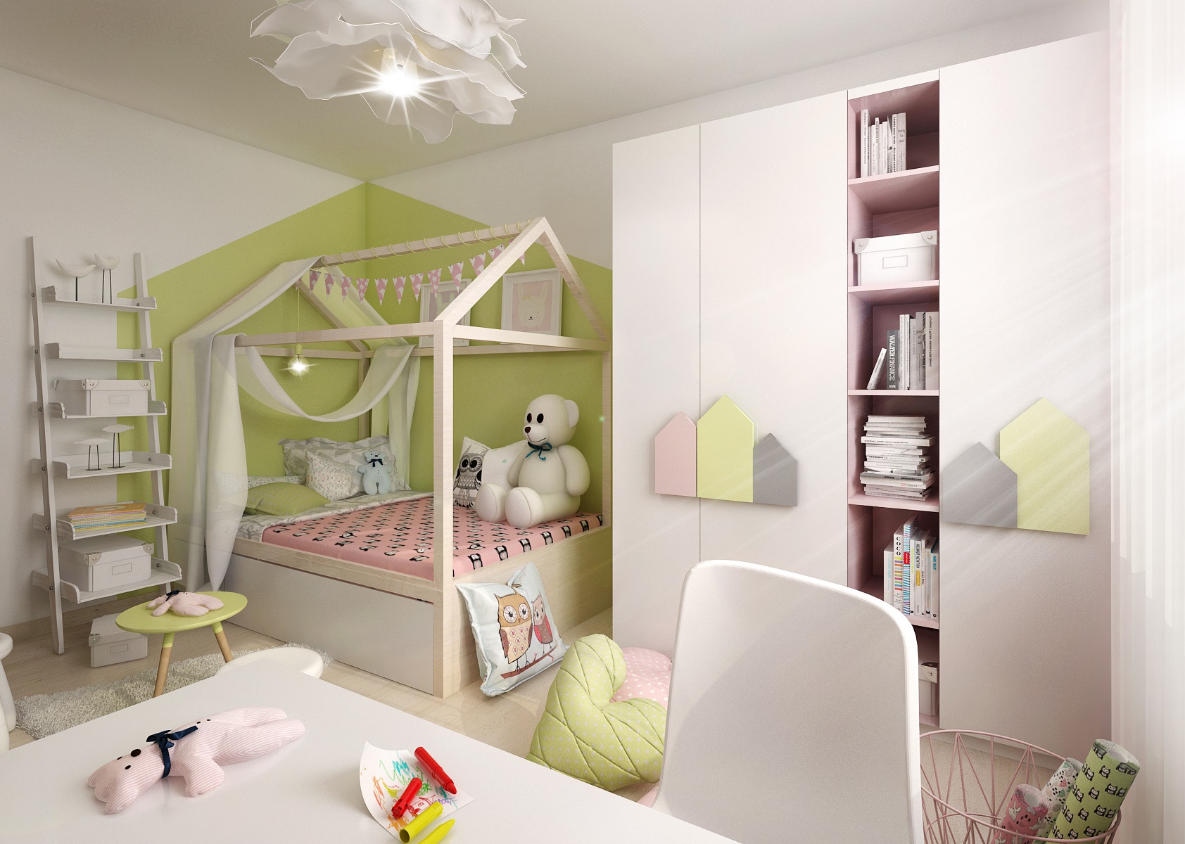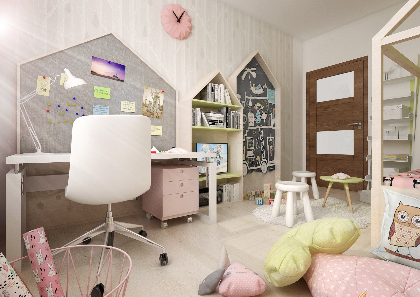 Children's room with houses that appear in various forms on most elements of the room. Furniture handles at the wardrobe, perimeter construction - canopies above the bed, or frames of notice boards and shelves. The furniture is decorated in light tones of pink, beige and olive green, combined with basic white.