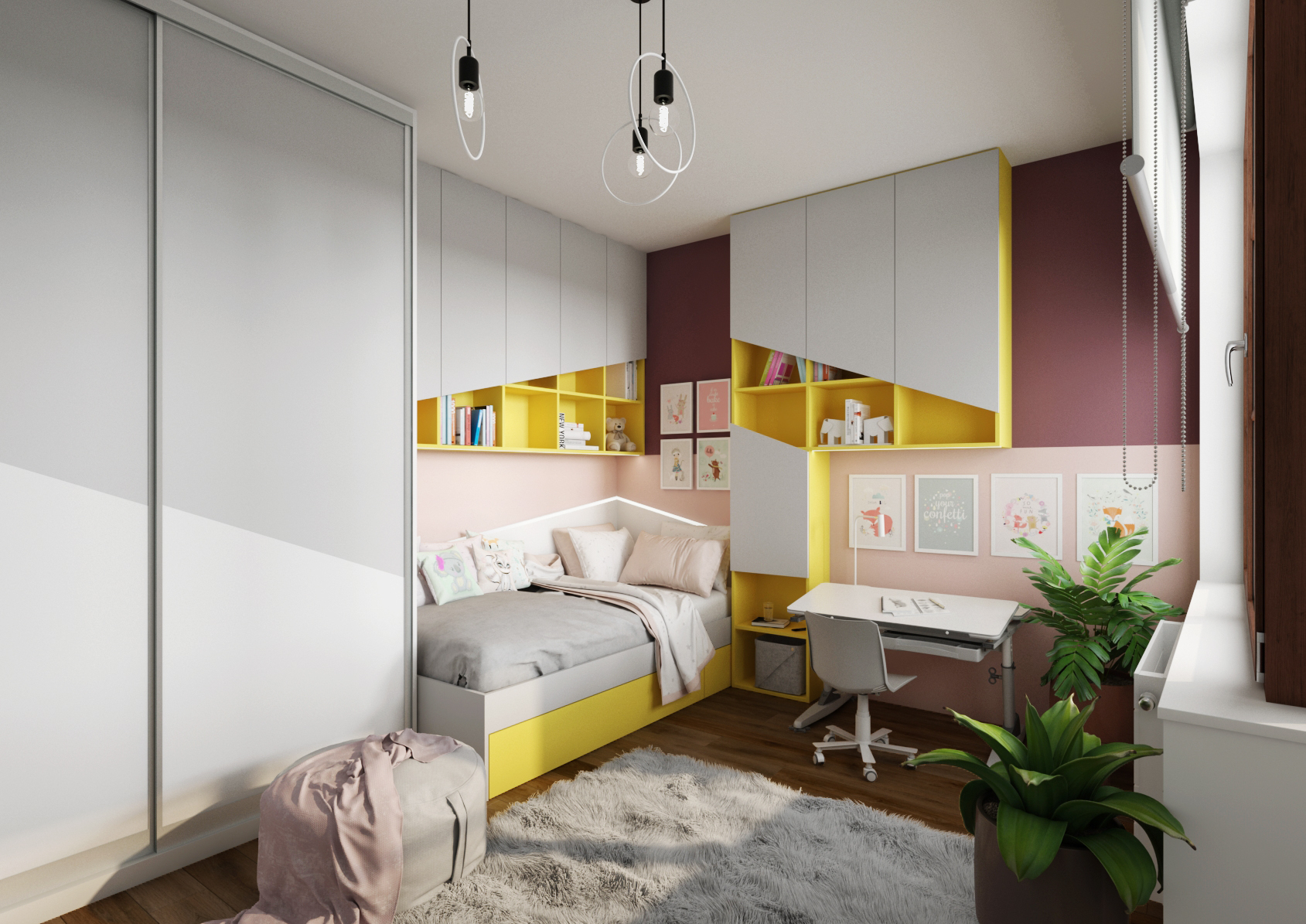 The corner window gives the space plenty of natural light, especially for the part with the desk, where light is really needed. There is a wardrobe along the wall, which stretches from the door to the girl's bed. It is also an imaginary corner divider for a girl.