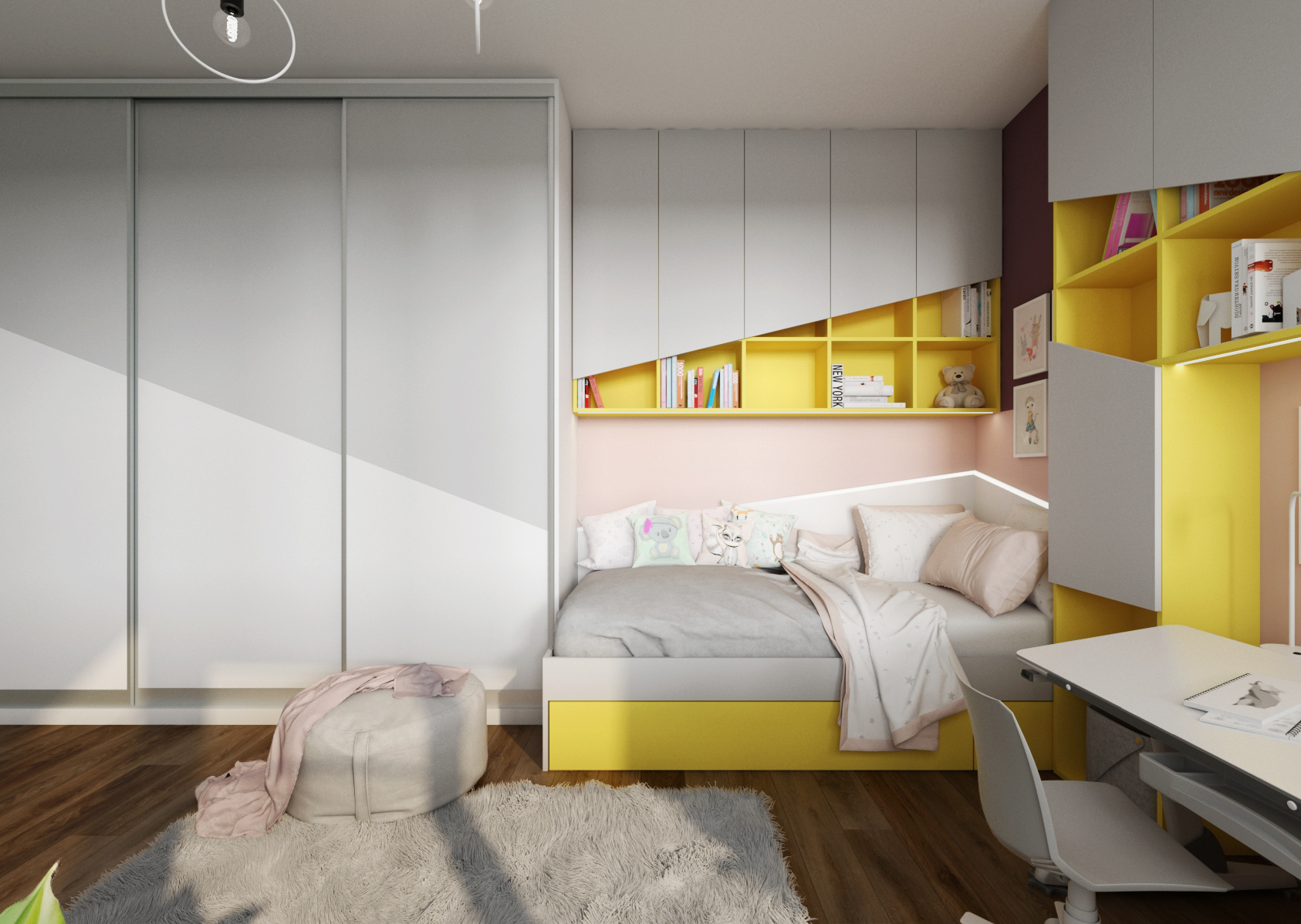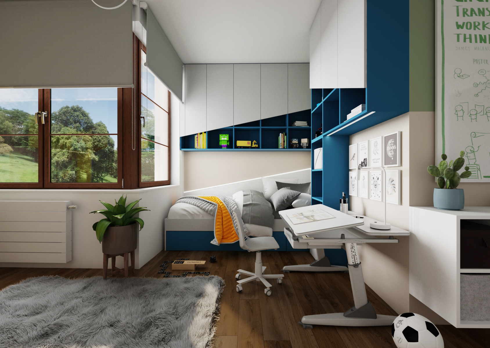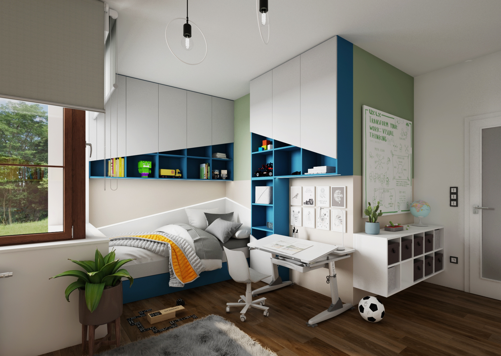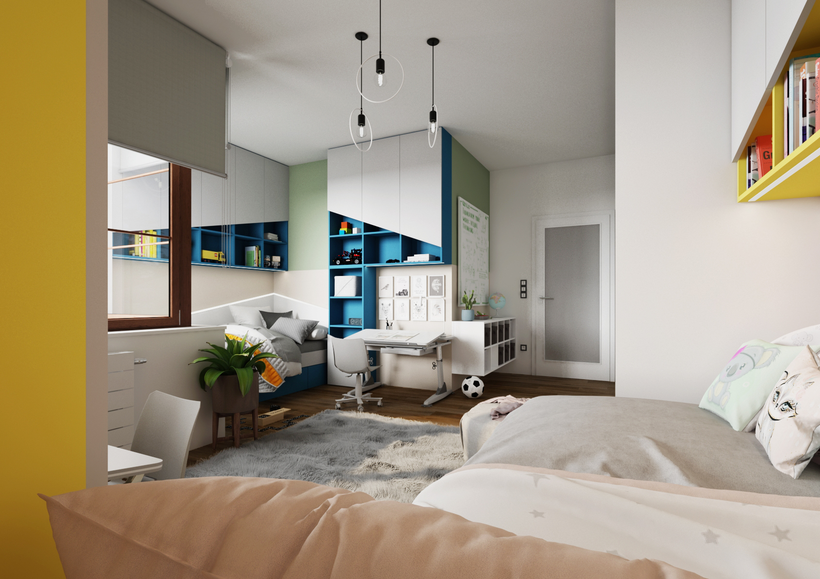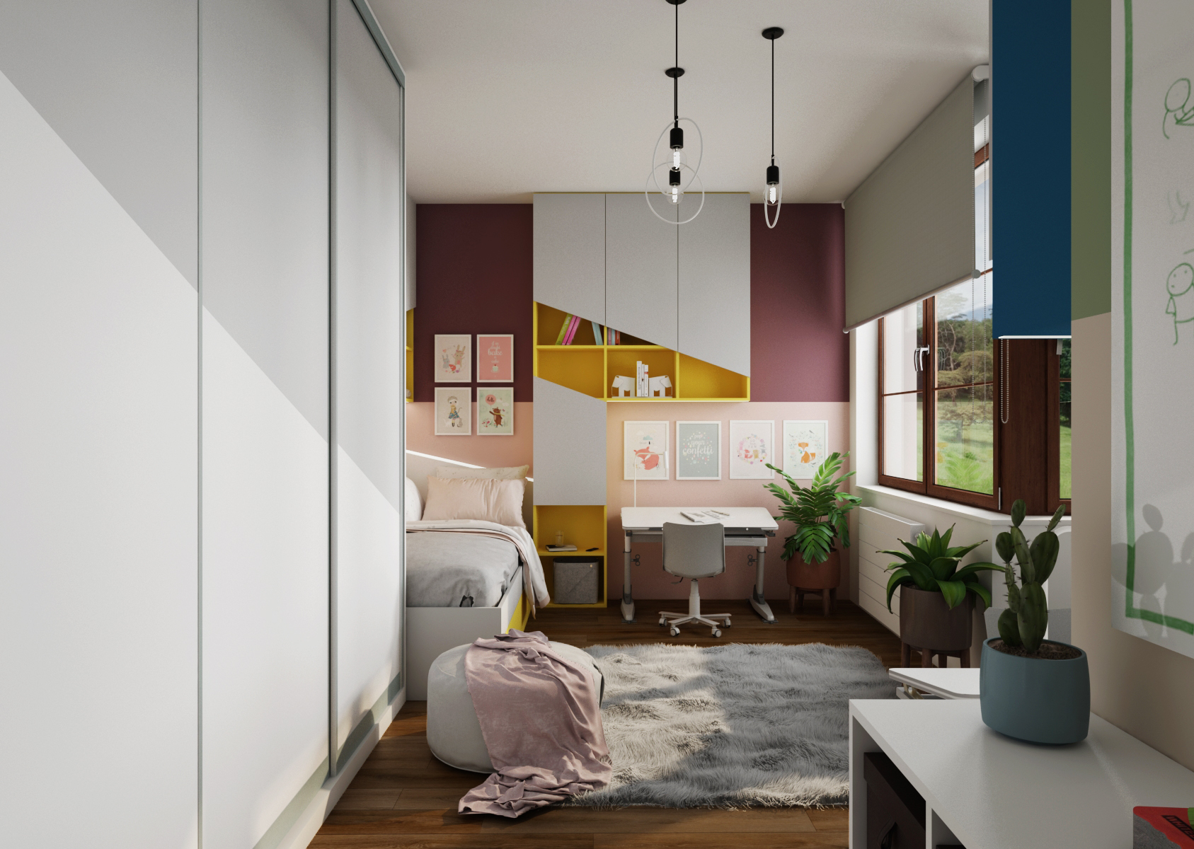 The children's room, which is located in the corner of the house, is designed for two children. Specifically in this case for girls and boys.