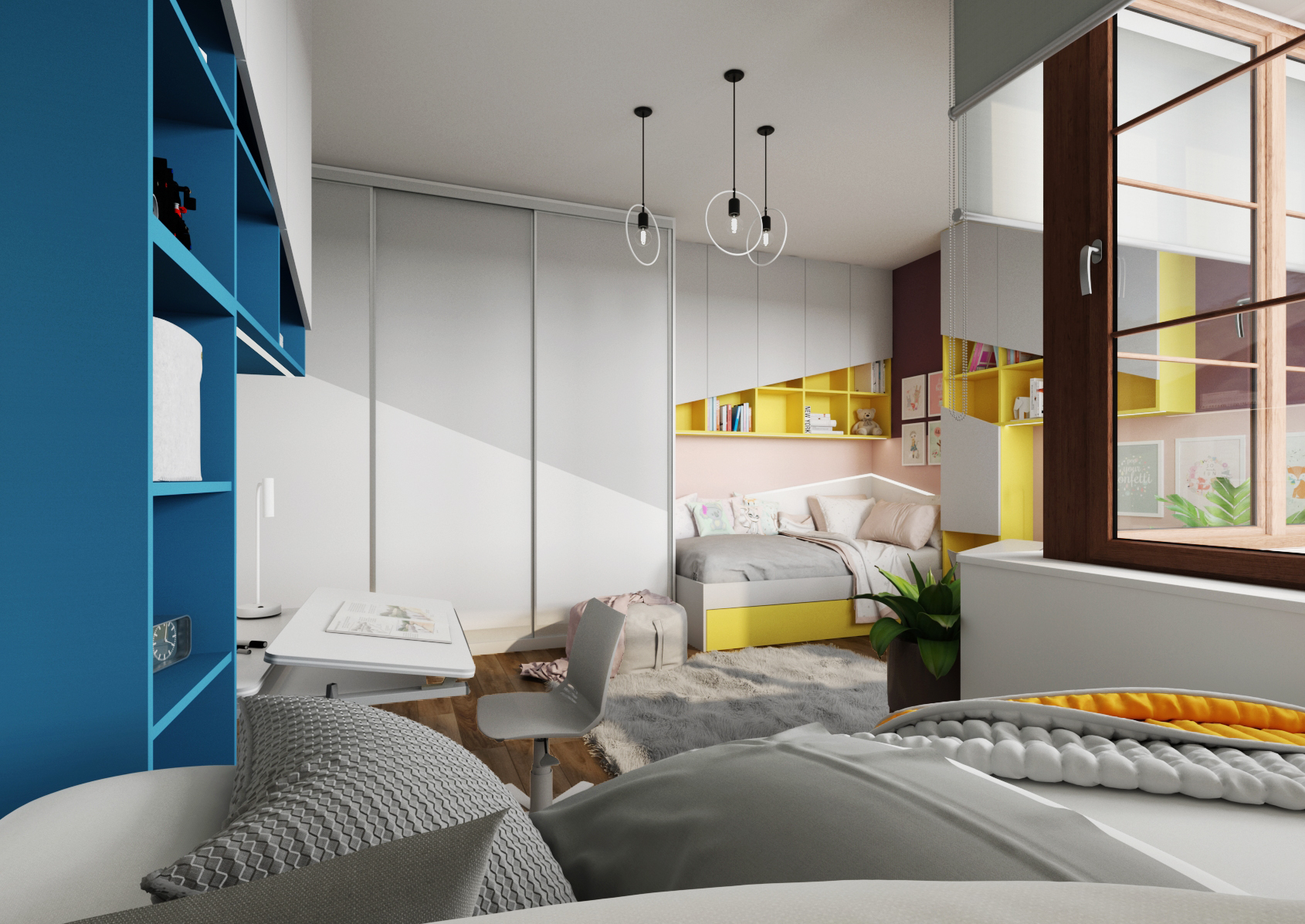Each of the children has their own desk, which has an adjustable work surface and foot height. It is located on the side of the bed. Parts of the room and the zone are distinguished by strong colors - in the case of the young lady it is a combination of purple and yellow, on the contrary, the boy was chosen shades of green and blue.