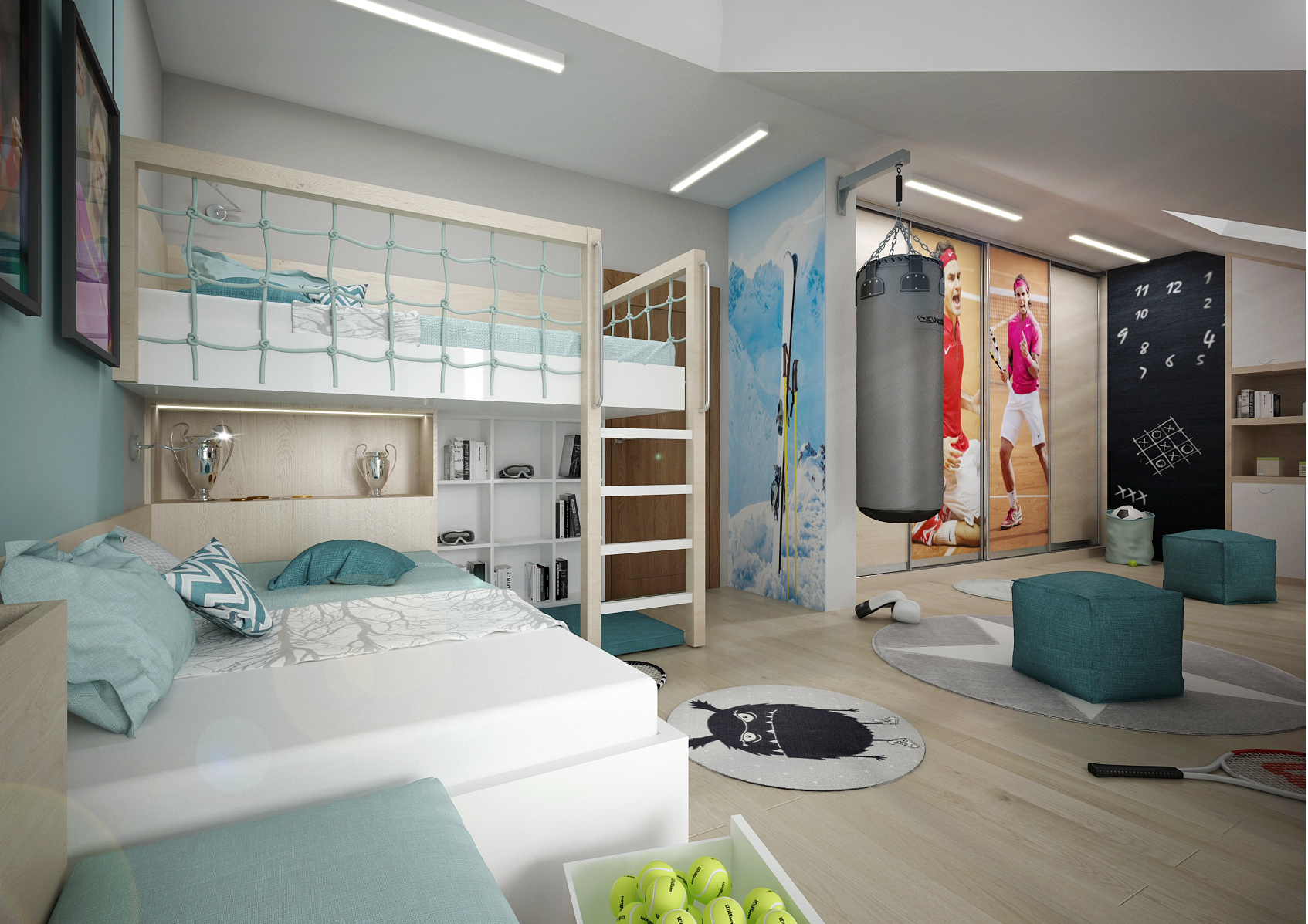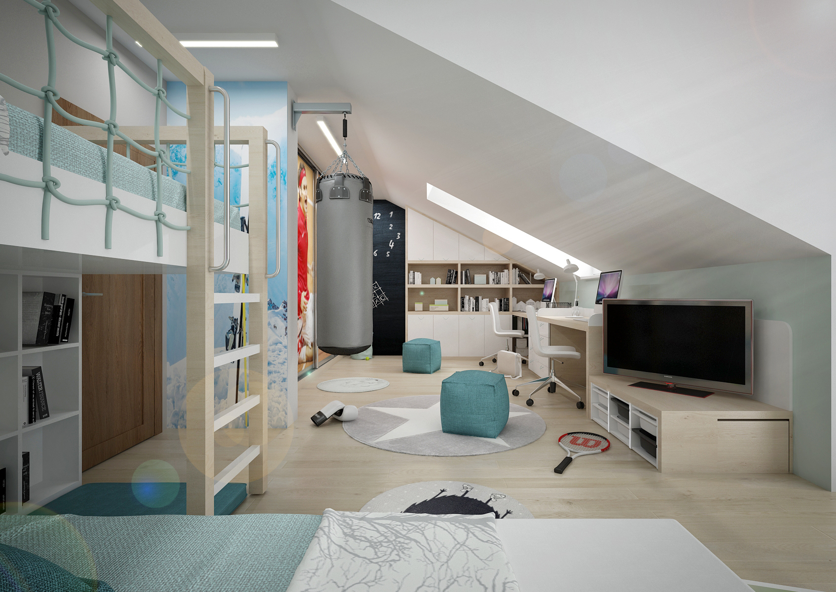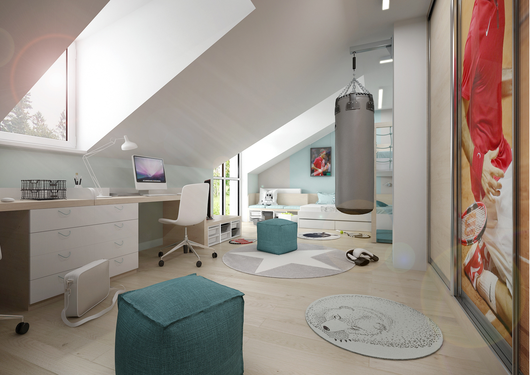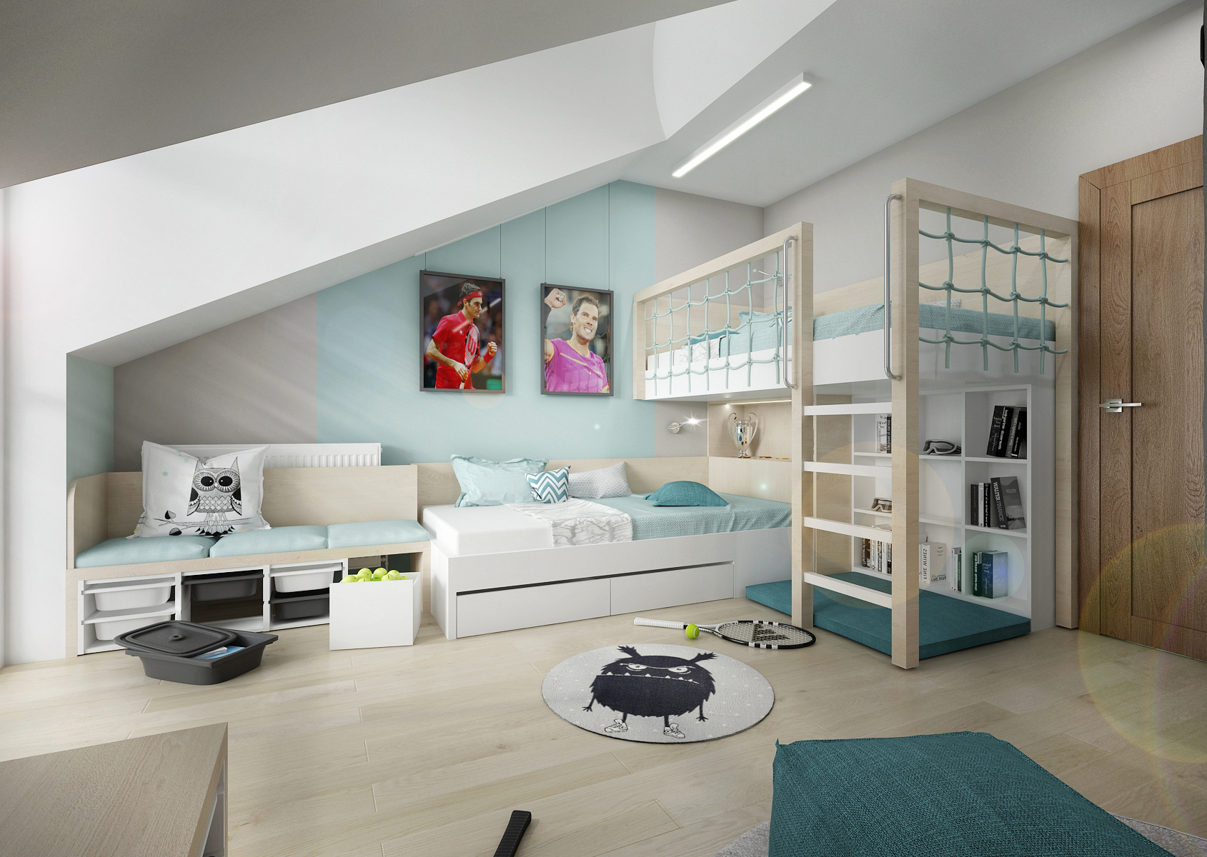 Two brothers and both big sports enthusiasts, mainly tennis. The attic room with an entrance in the middle made it possible to divide the space into two functional zones: sleeping and working (or gaming if you want). The co-located beds were welcomed by the siblings, they didn't want to be in a different corner of the room, at least not yet. The built-in wardrobes were decorated with posters of tennis celebrities, designs of small athletes. Fine birch, white laminate, light painting and fabrics left the room airy.