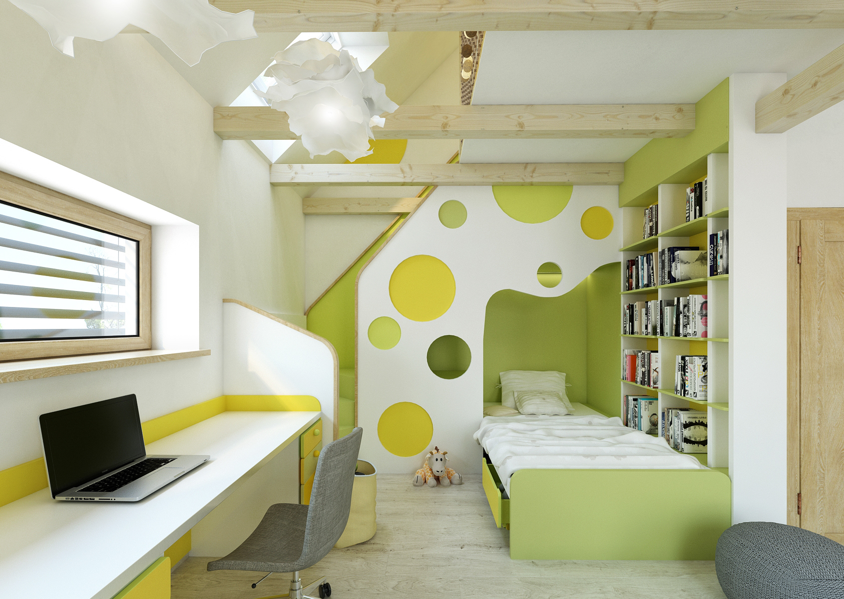 During the construction of the new family house, a lot was discussed about the space of the children's room. It has two parts, a ground floor with beds and a desk and a maisonette under a sloping roof, which is entirely dedicated to the children's playroom. In the "lair" under the stairs to the floor is located one of the beds. The color of the room was designed according to the preferences of its inhabitants.
