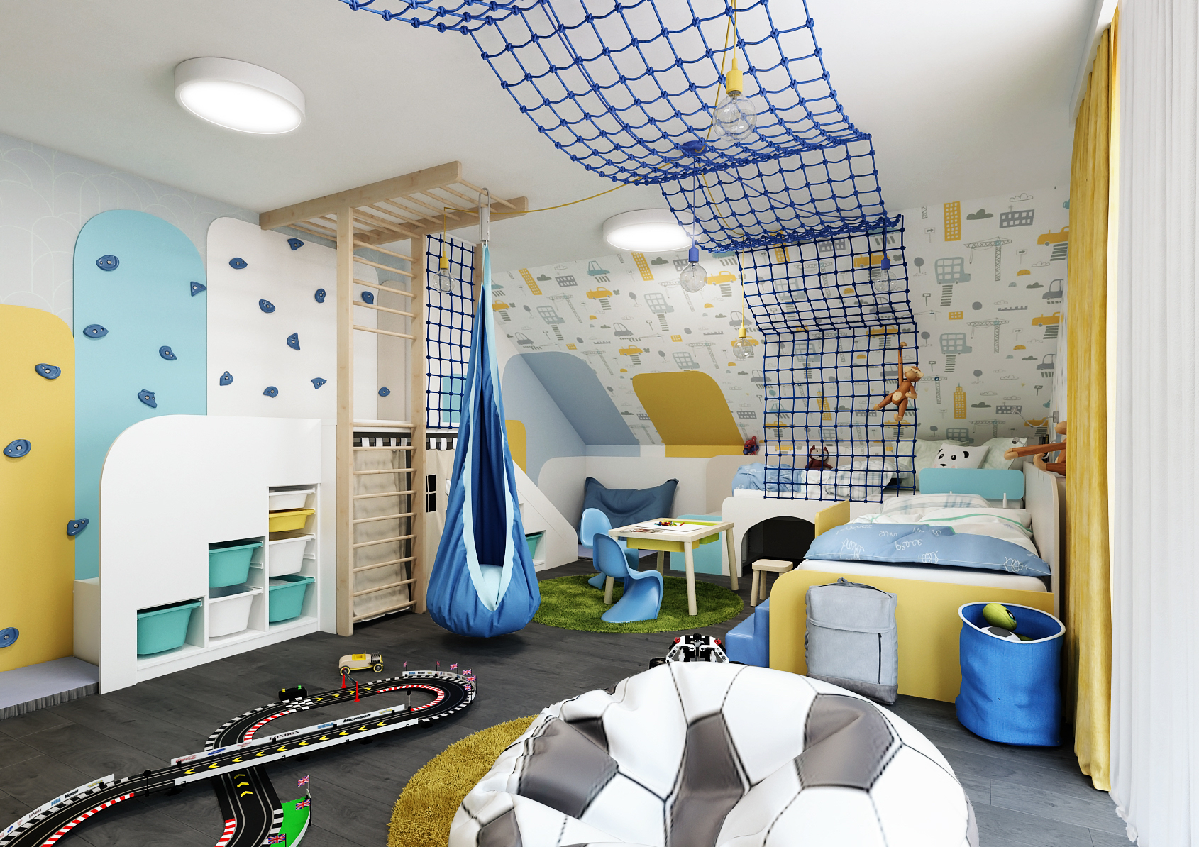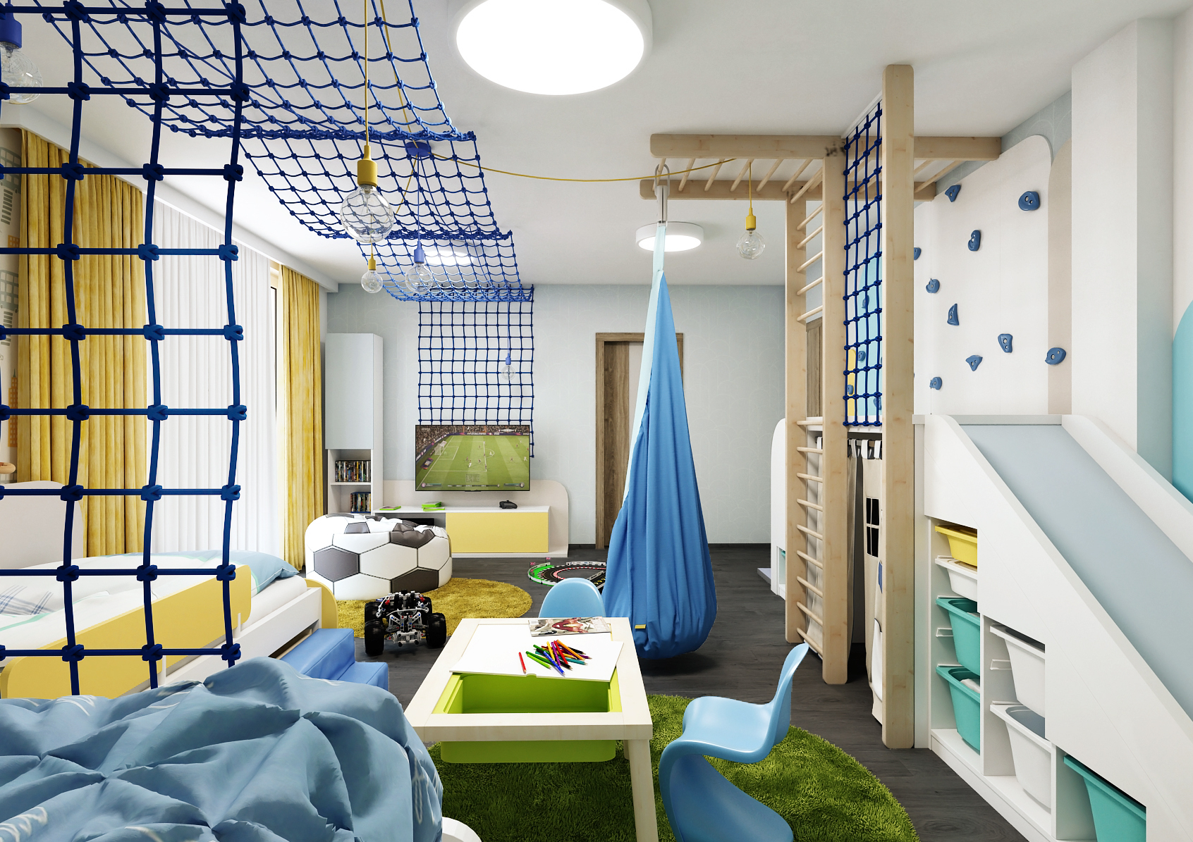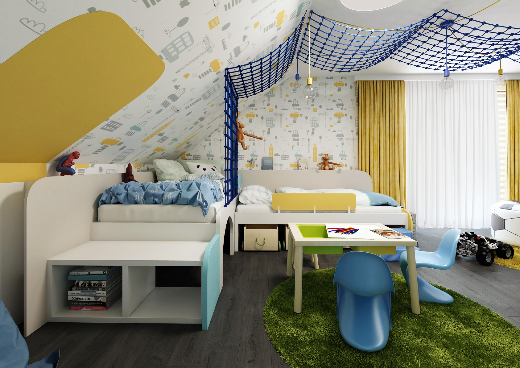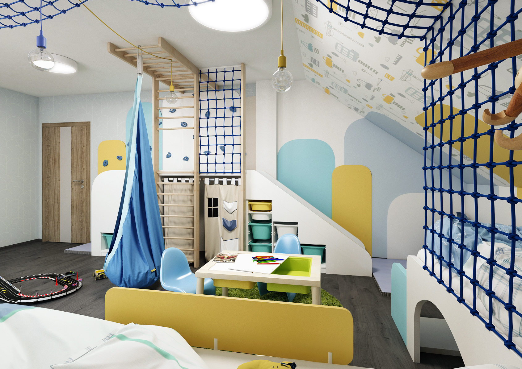 The beds under the ceiling slope offer both storage space and the possibility of a locker in the form of a tunnel cutout in the structure. There is a net attached to the slope, which extends through the ceiling to the opposite side of the room. The wall opposite the windows serves as a climbing frame, there are not only ladders, but also a climbing wall or slide. The space under the slide is used for storage boxes and as a house.