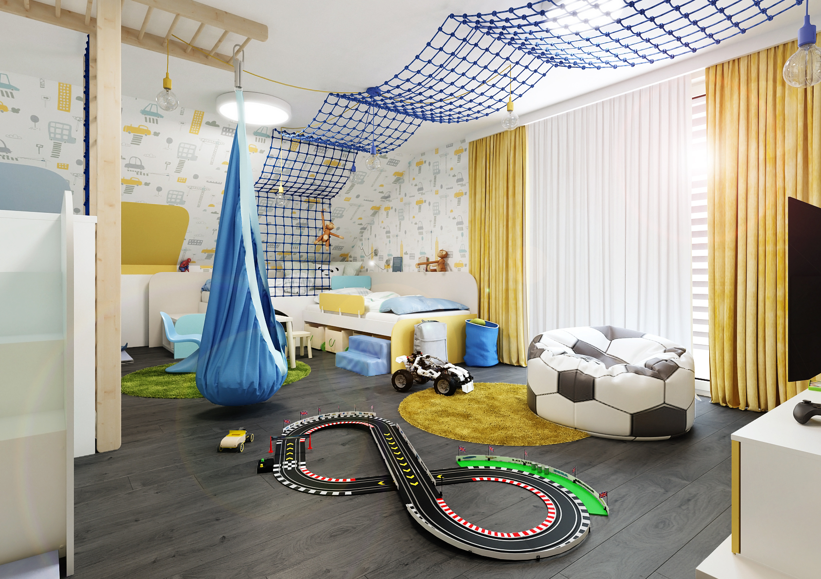 The center of the room serves as a relaxation / play area. A rocking bag is hung next to the ladders and there is also a bean bag by the wall with the TV.