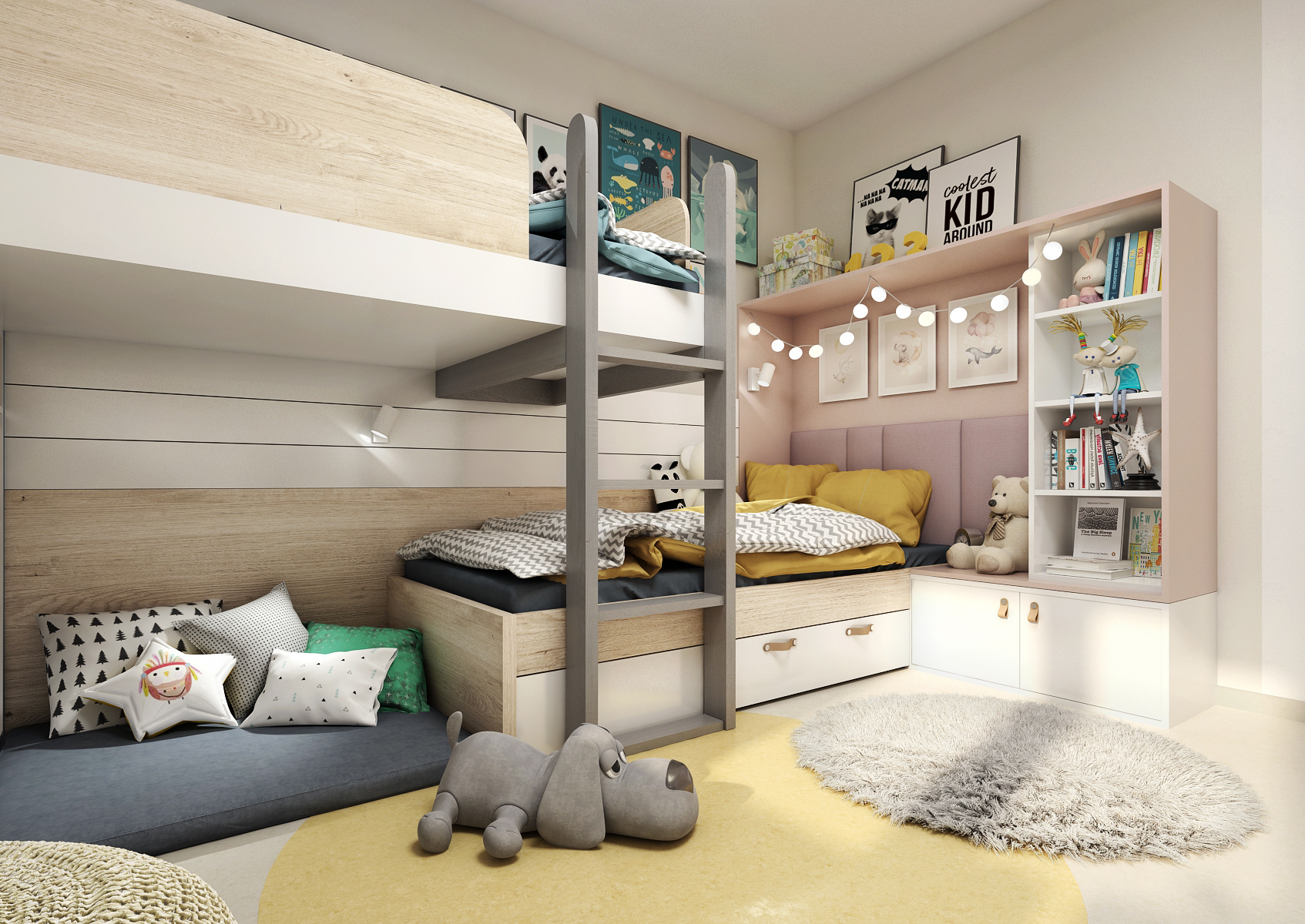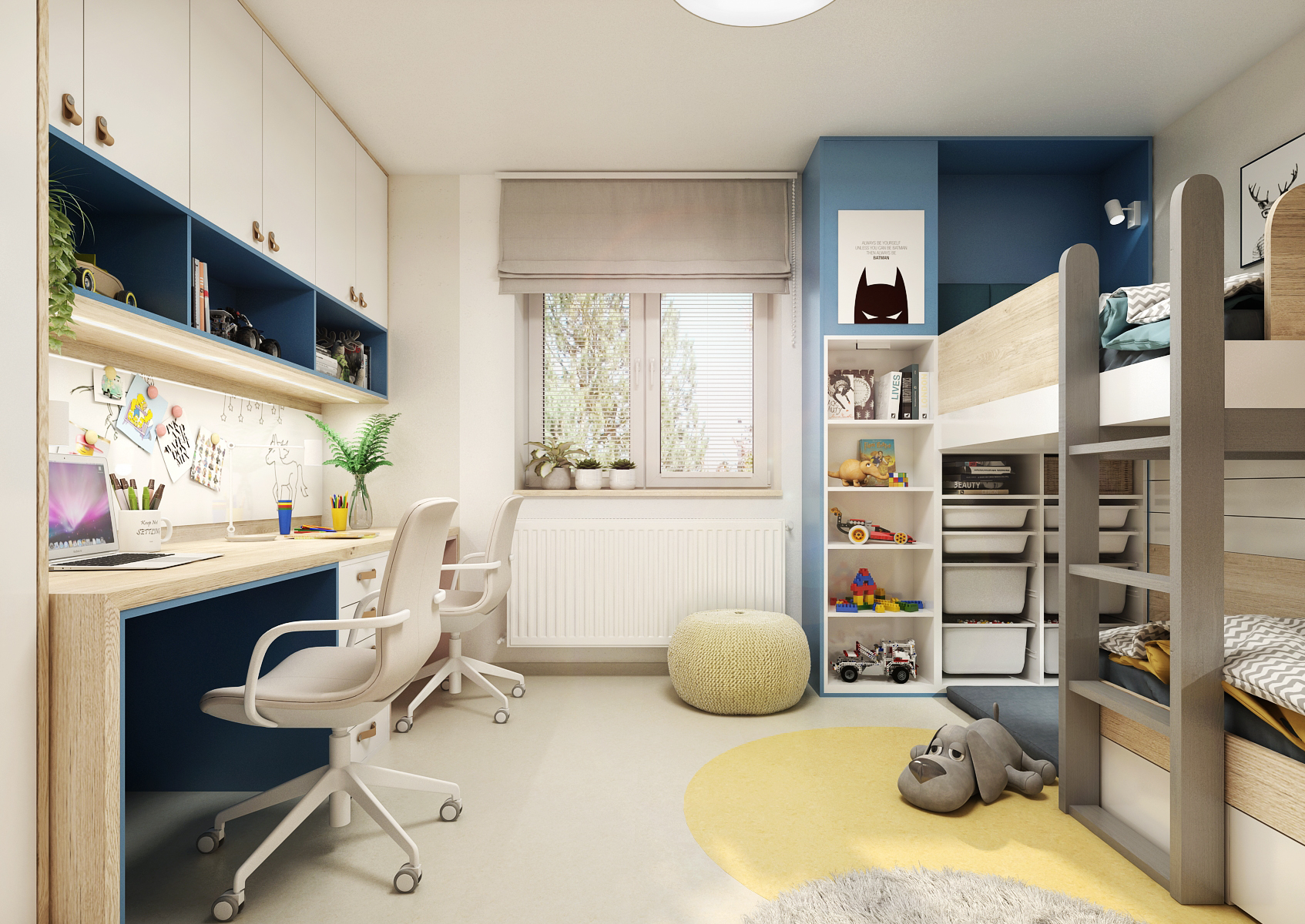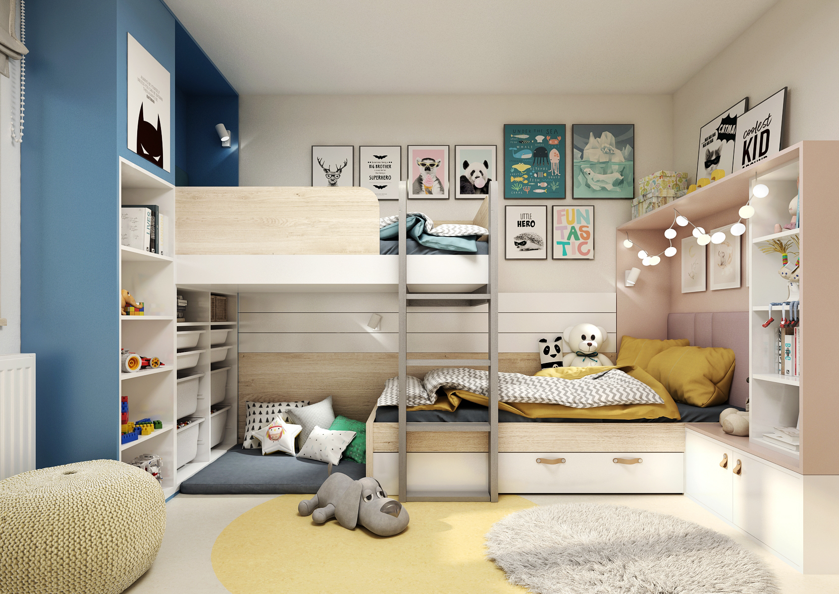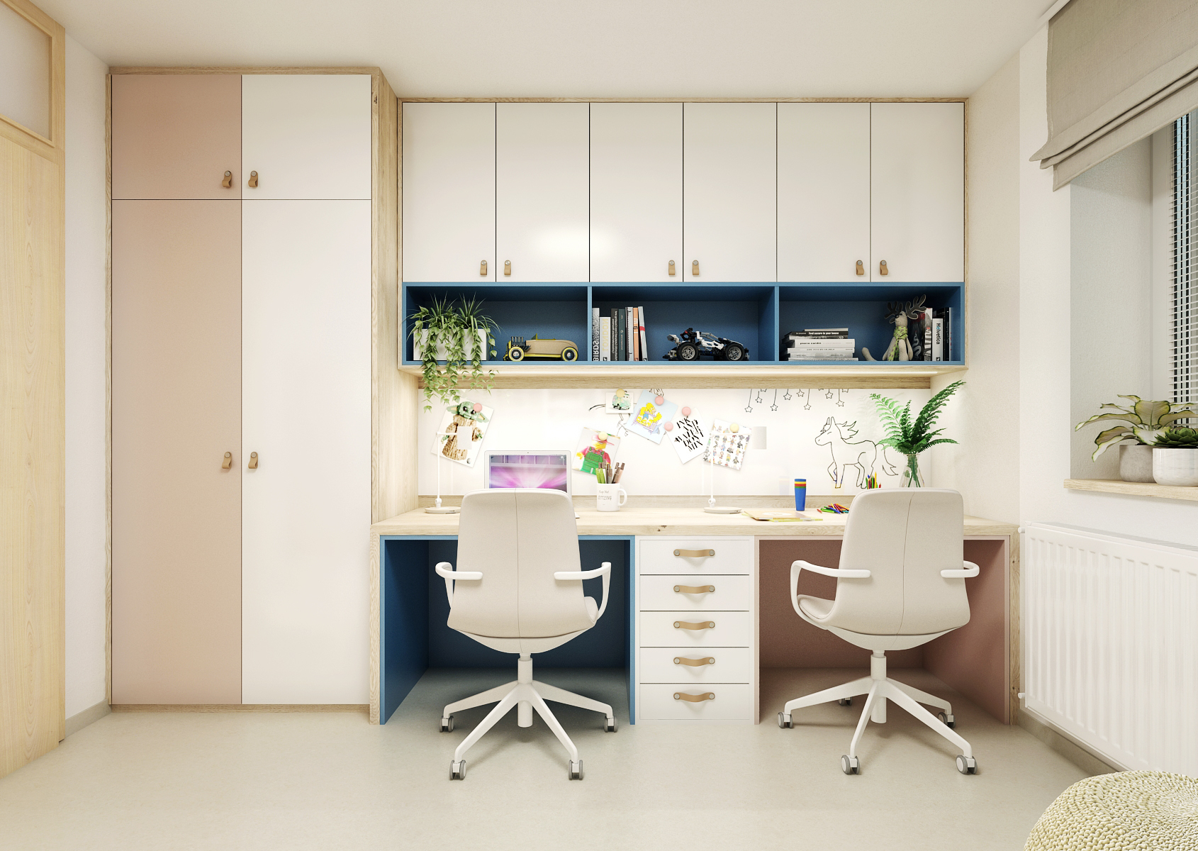 The first version of the children's room plays with many colors. Not only is the part around the boy's crib painted blue and the girl's part pink, you can also find shades of yellow or green on accessories and home textiles. Under the upper bed there is a storage area with a place that can be used for relaxation. The desks are set in the niche between the wardrobe and upper cabinets. Behind the desk is a magnetic notice board that can be written on with a marker.