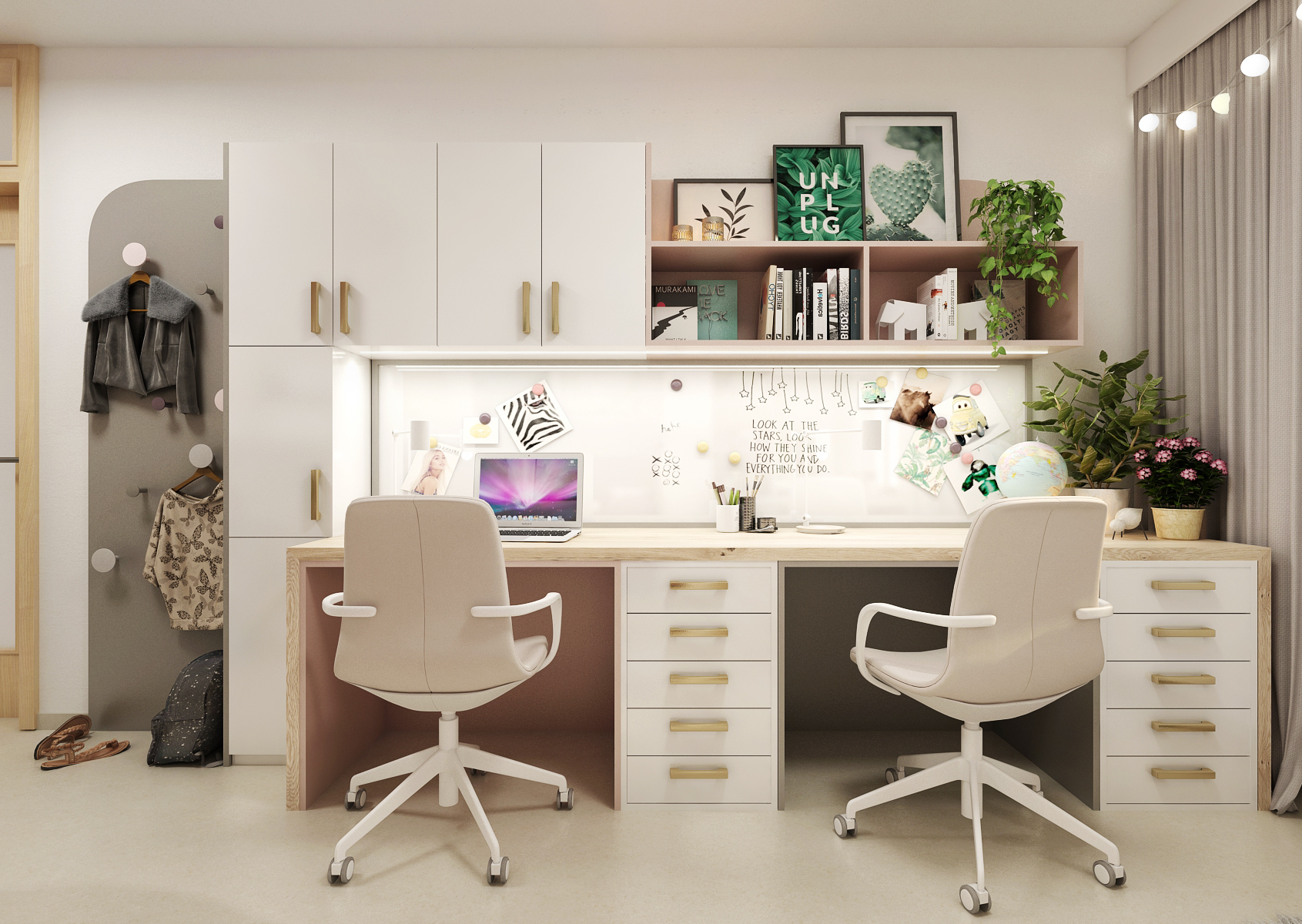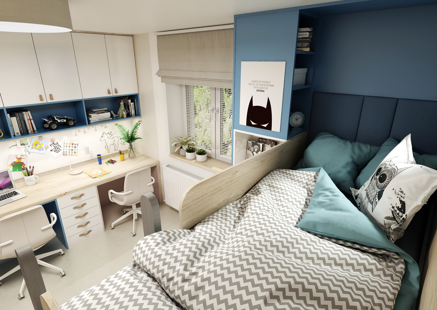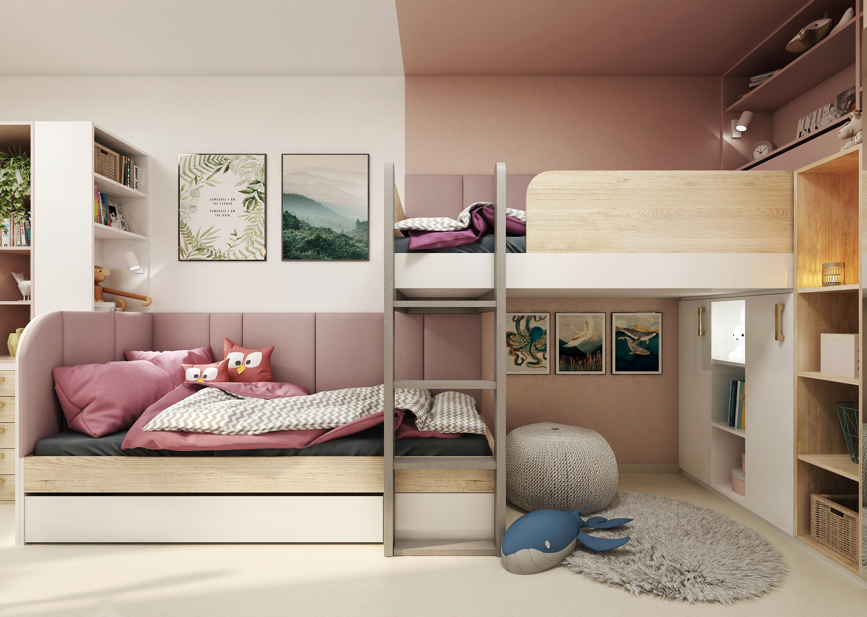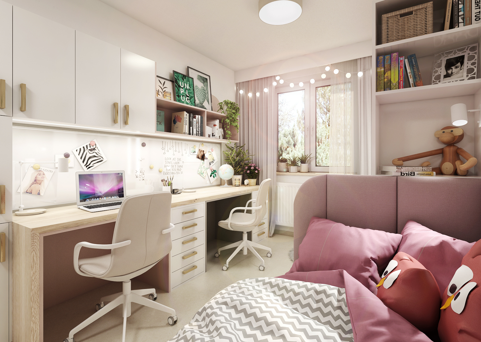 The first version of the children's room plays with many colors. Not only is the part around the boy's crib painted blue and the girl's part pink, you can also find shades of yellow or green on accessories and home textiles. Under the upper bed there is a storage area with a place that can be used for relaxation. The desks are set in the niche between the wardrobe and upper cabinets. Behind the desk is a magnetic notice board that can be written on with a marker.