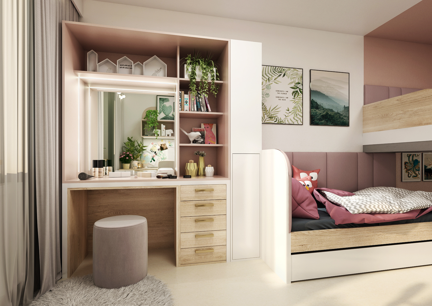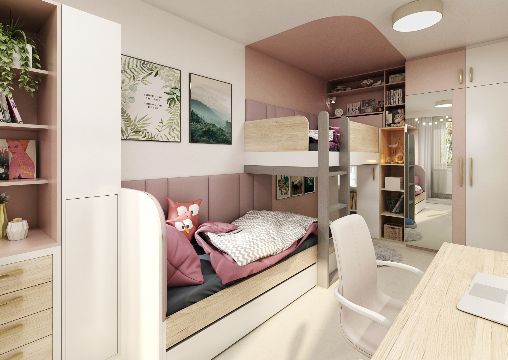 The second, purely girl's room is decorated in pink-purple shades, whether it is the painting or the upholstery around the beds. A subtle shade of pink is also noticeable on the cabinets and home textiles. A cosmetic table with a stool and LED backlighting by the mirror is attached to the cots. Both open shelves and drawers under the table serve as storage space here. Here, too, there is a space under the upper bed with an open library and a sitting area.