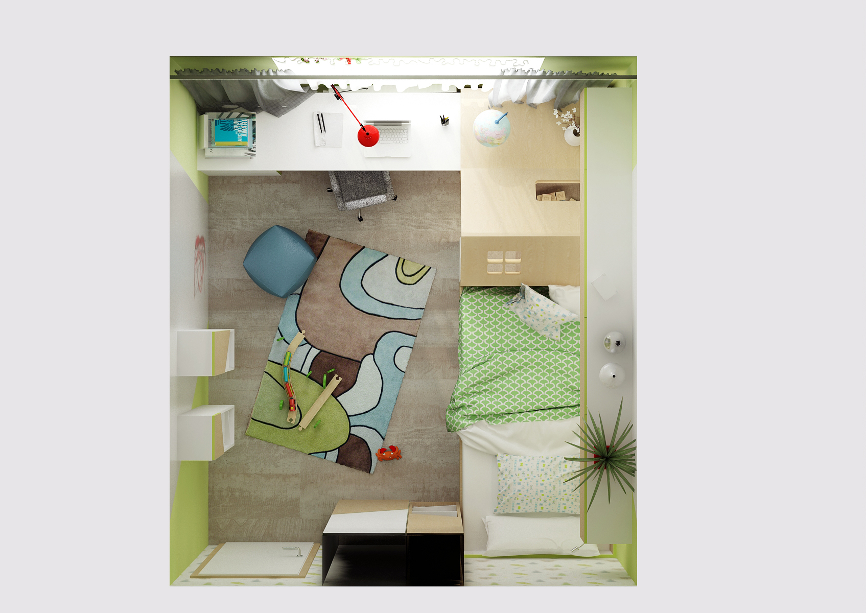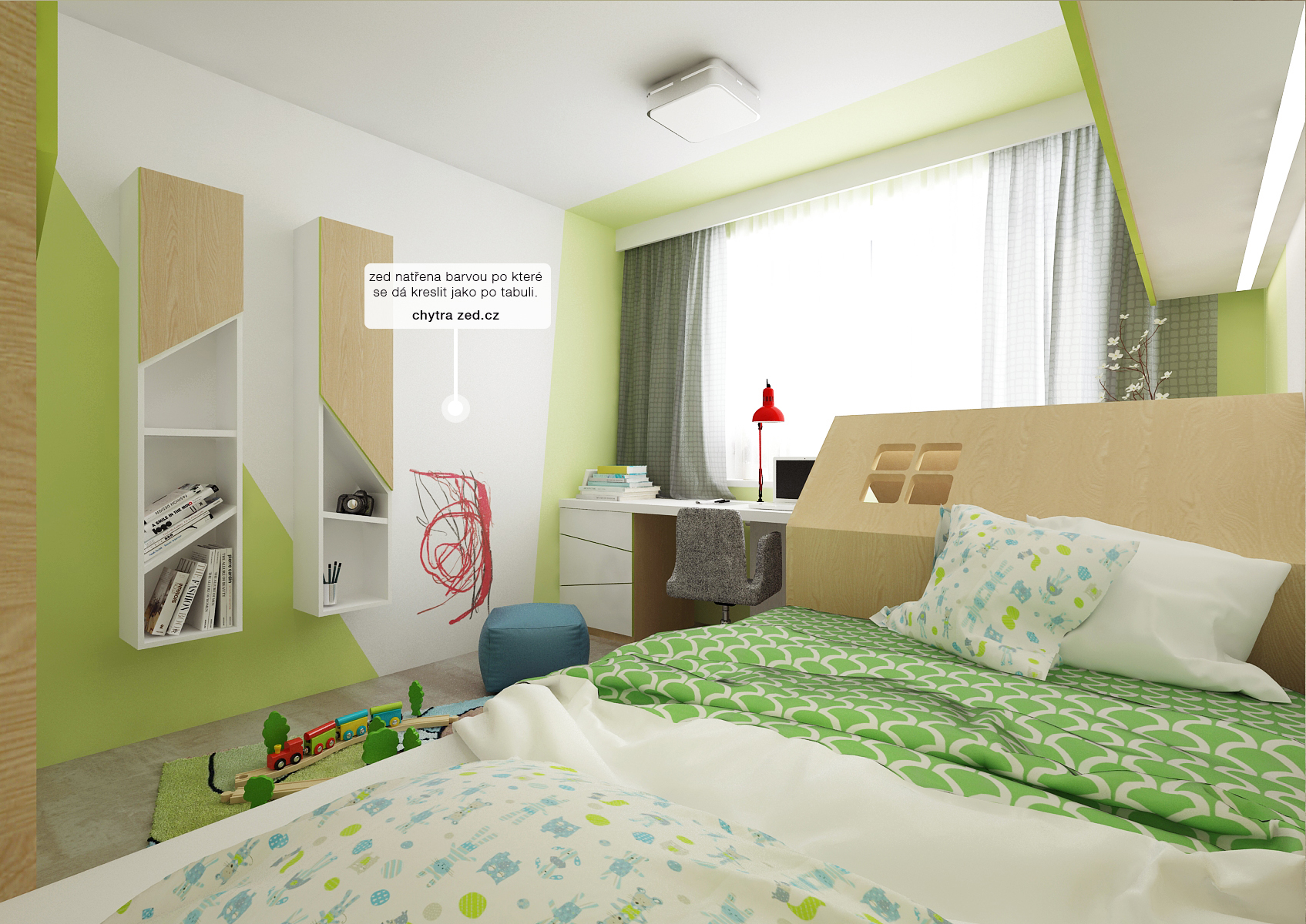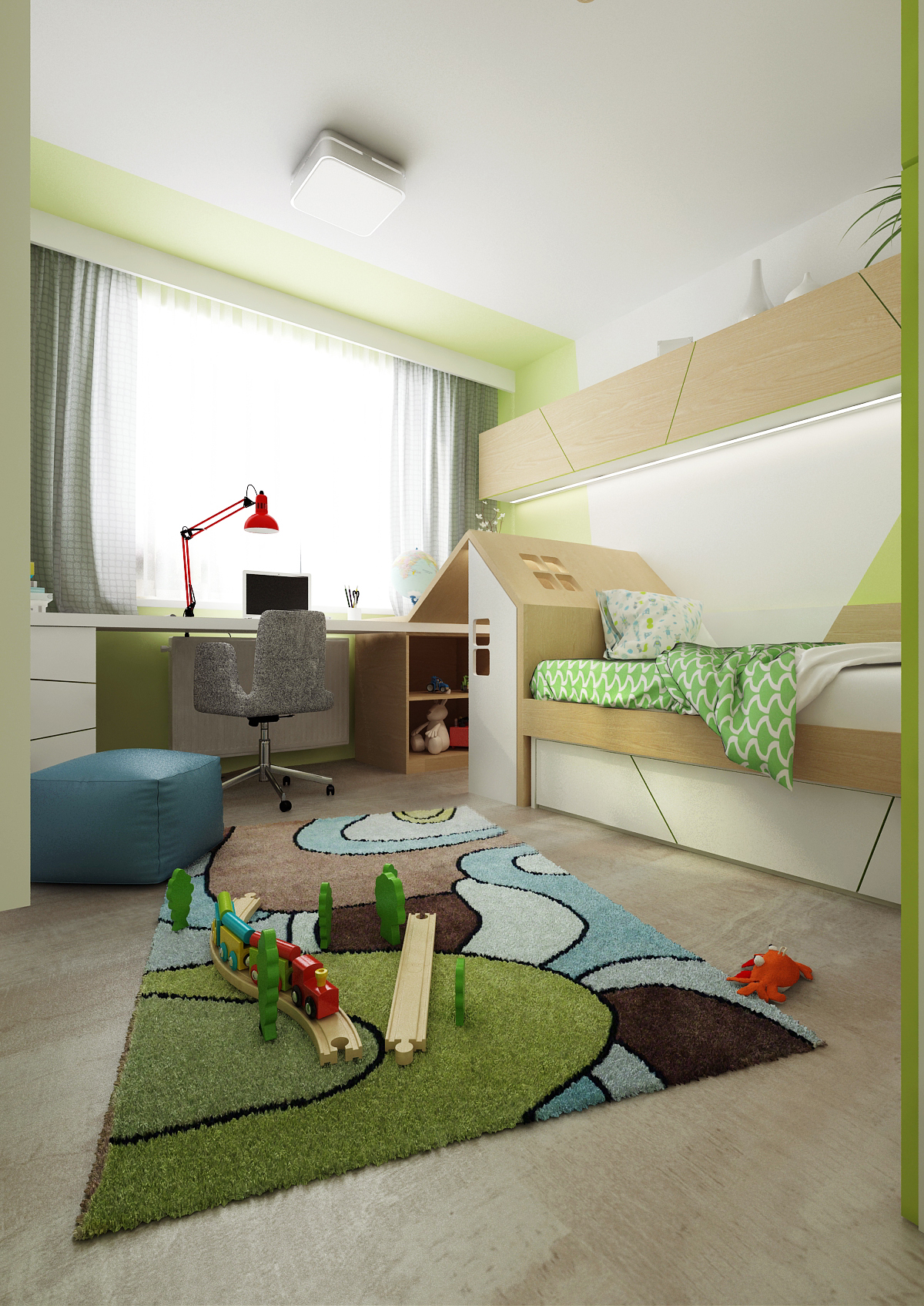 A room for a preschooler with a children's house, which can be removed in the future and a short cot replaced with a full-size bed. The notice-board and blackboard are replaced by the so-called "smart wall", on which you can write with markers and put magnets.