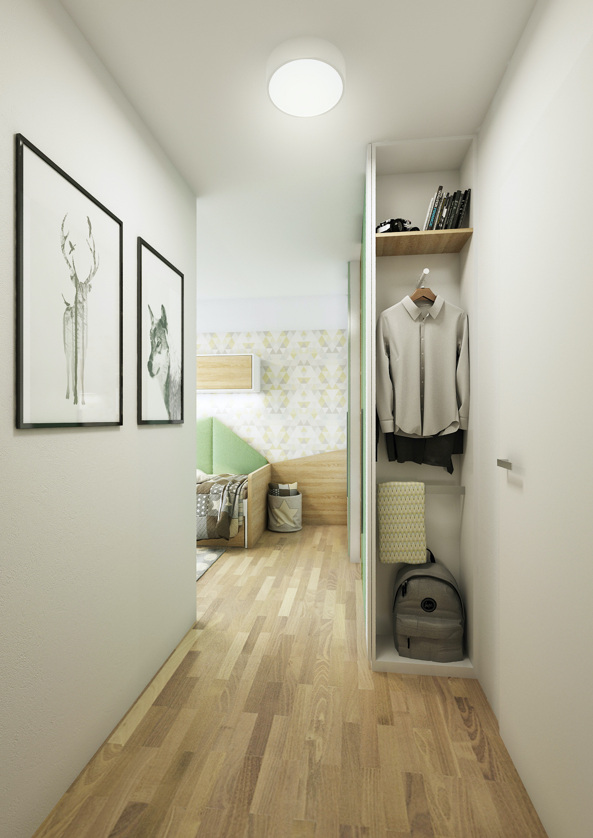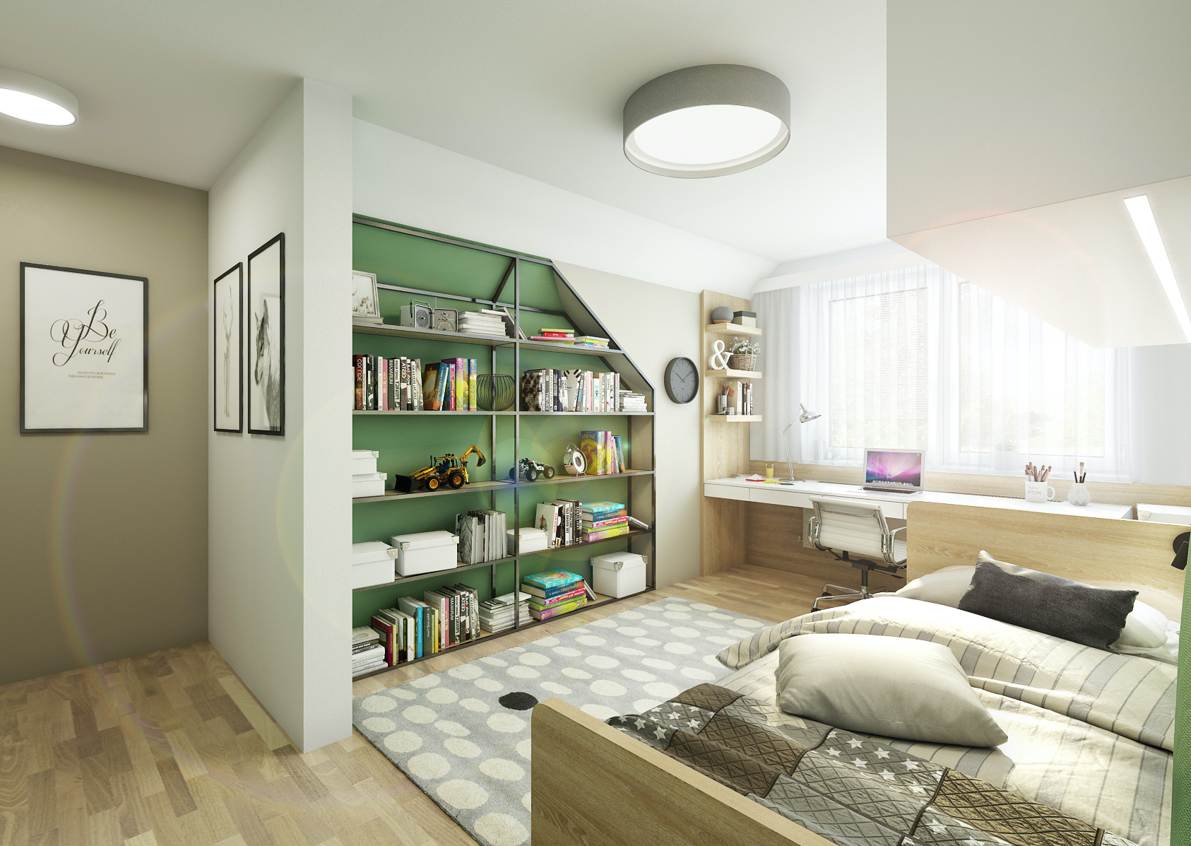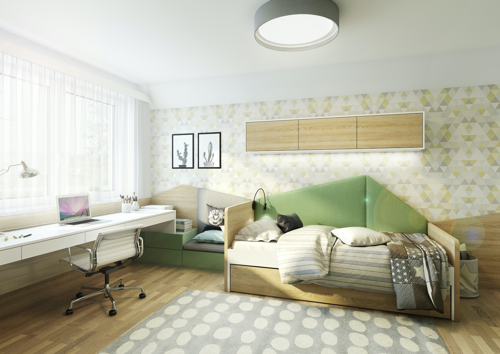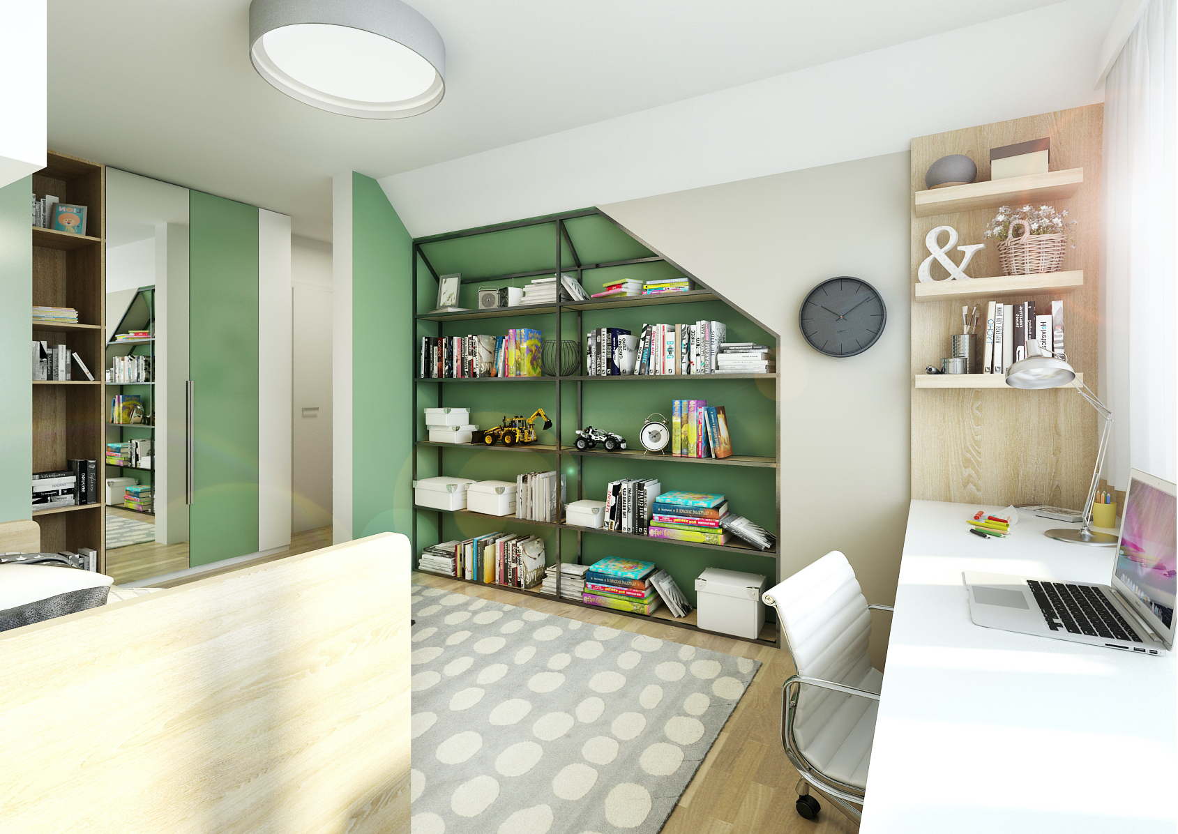 The interior of the student room is decorated in green tones in combination with light oak wood decor and white elements on the furniture.