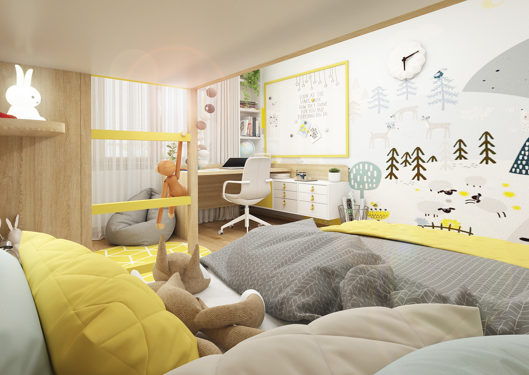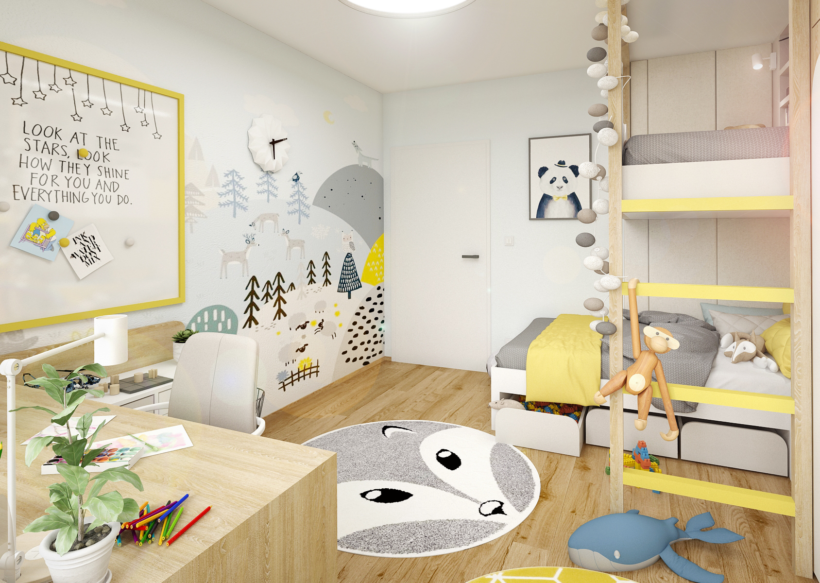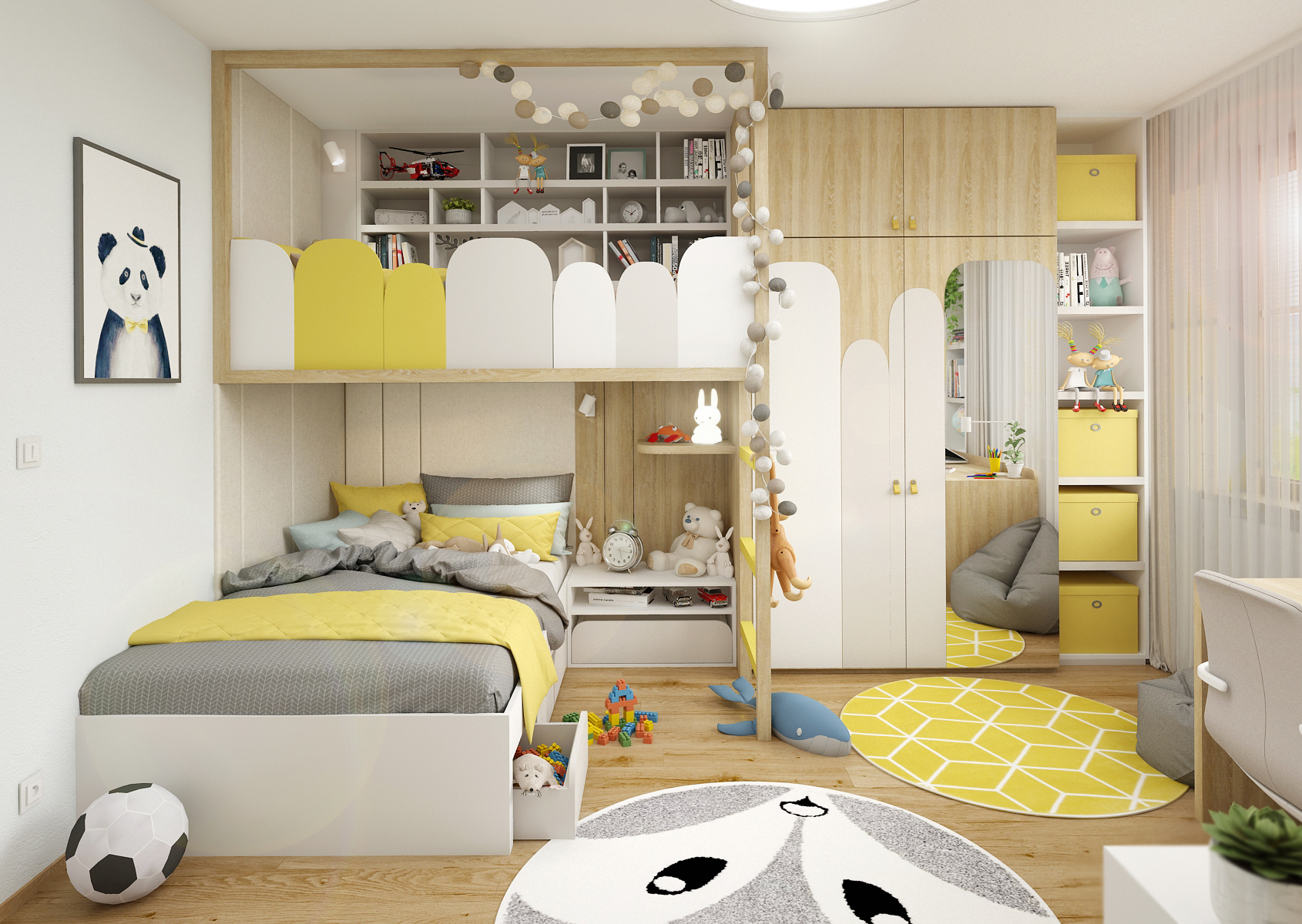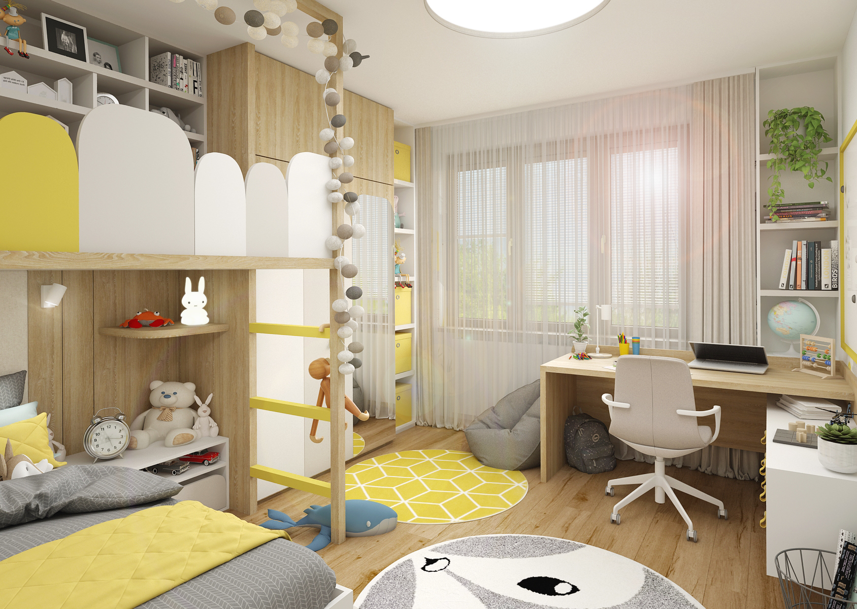 A children's room for two children with a bunk bed is tuned to yellow tones, several playful elements are also used here, which complement the whole atmosphere of the room.