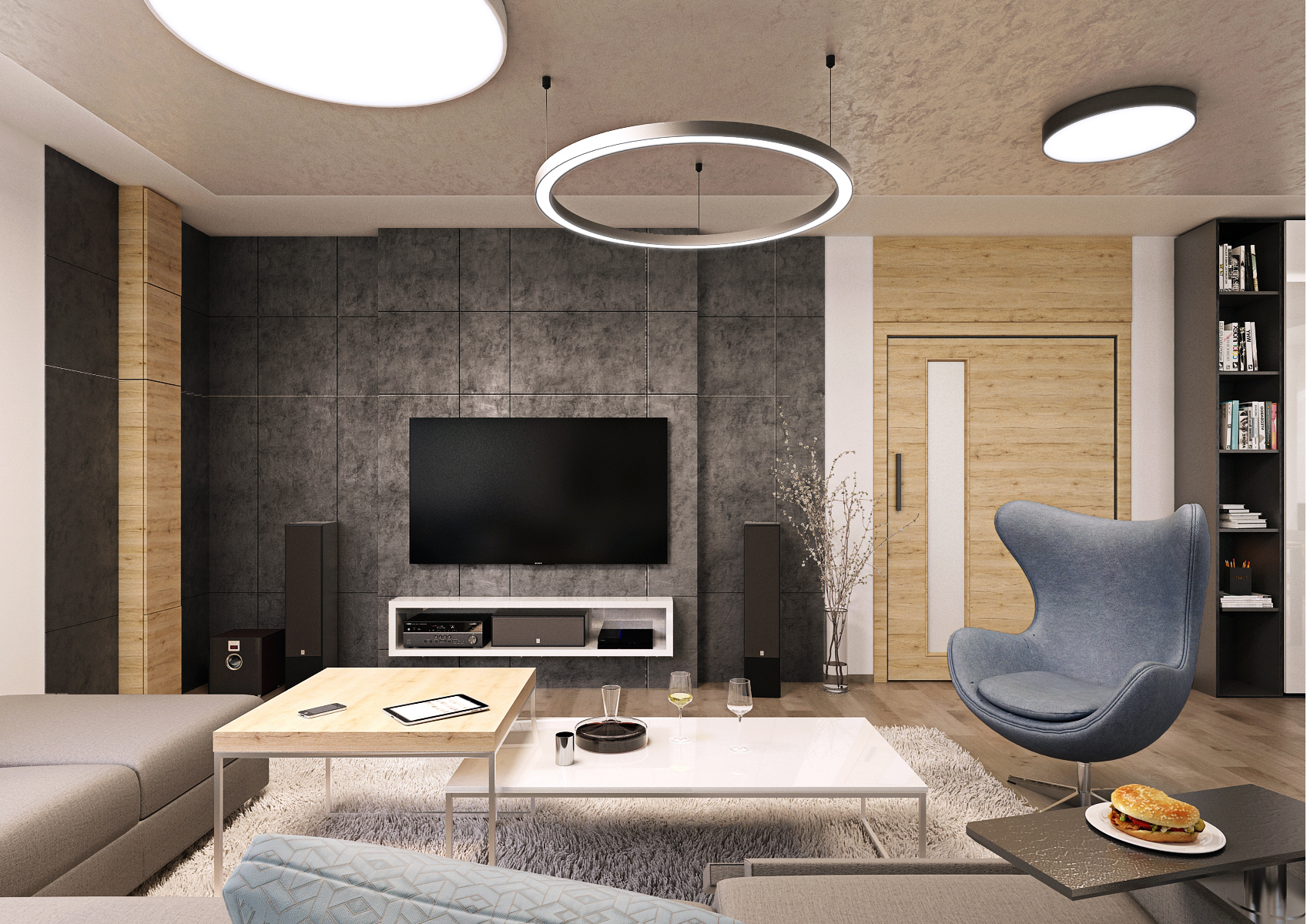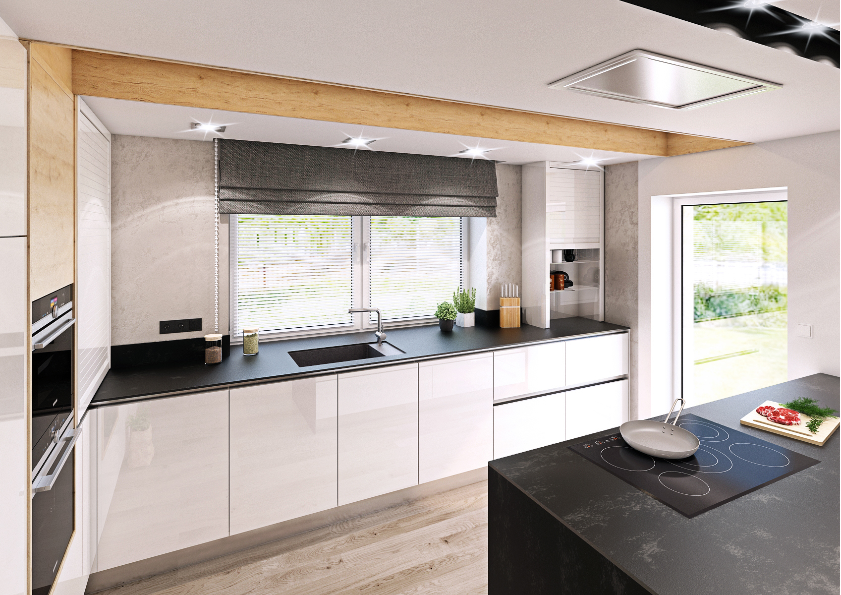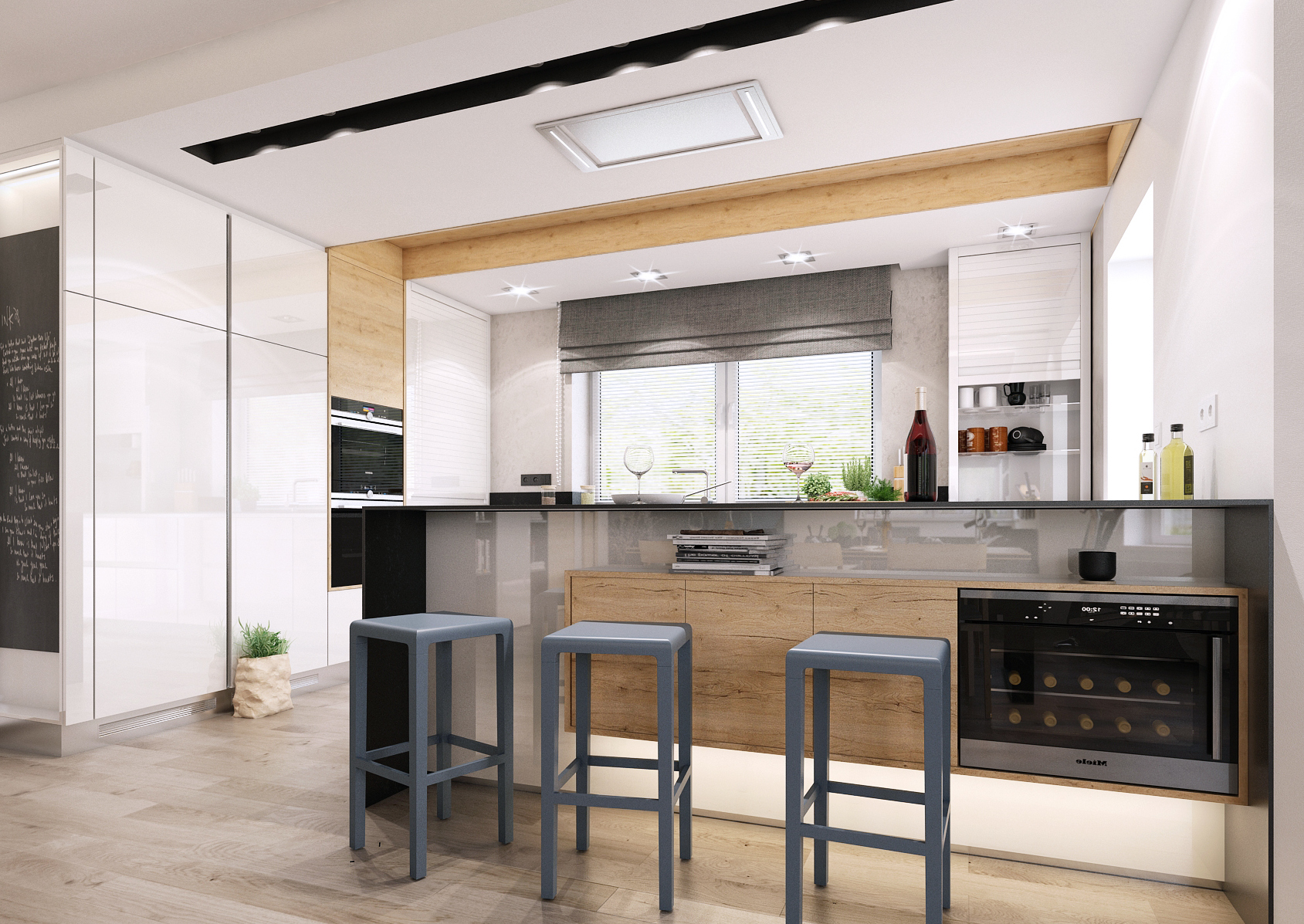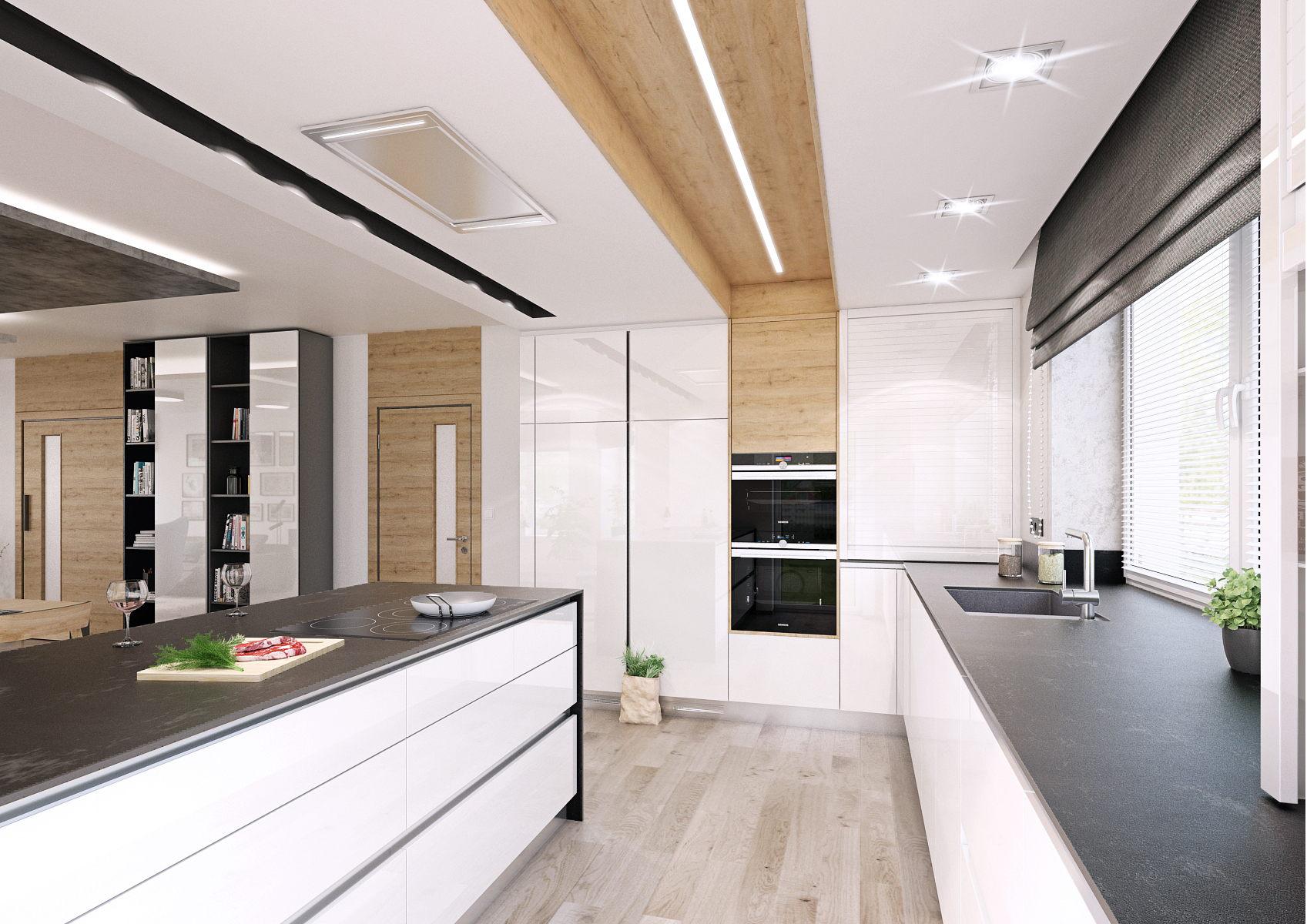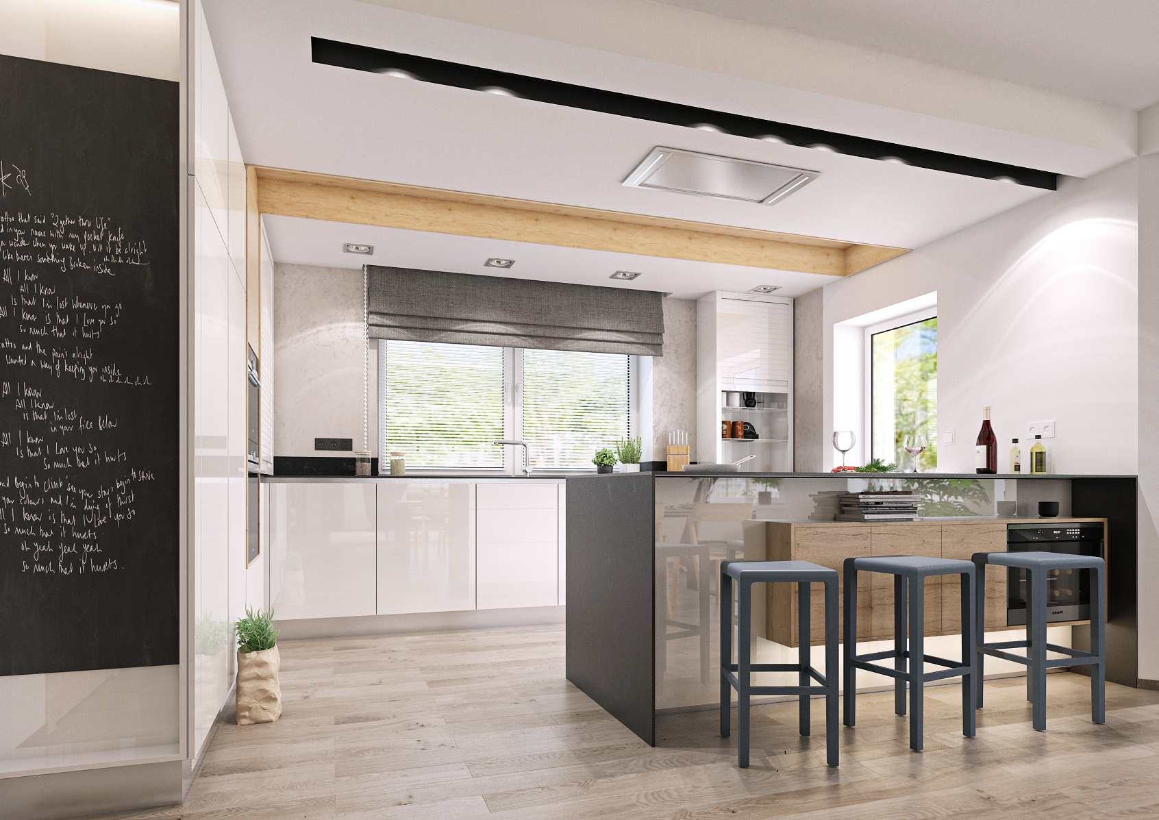 The used materials, white lacquer, the texture of light oak, the tones of black on the furniture, paneling and worktop are intertwined. The kitchen worktop is made of 12 mm Techniston. A washable wall trowel was used instead of a screen or tile. The lowered ceiling above the kitchen area hides the extractor hood and integrated lighting fixtures. The decorative wooden ceiling panel seamlessly transitions into a tall cabinet with built-in appliances. A backlit bar and writing board are a nice addition. The interior door trim extends below the ceiling so that no height differences disturb the view of the wall.