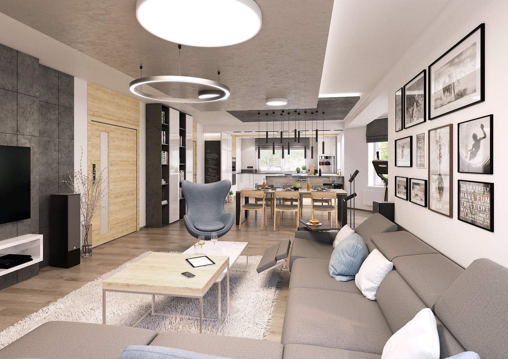 Spacious minimalist kitchen with adjoining dining and living area