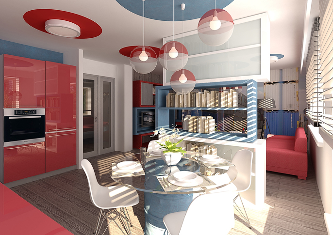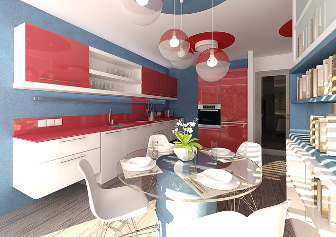 Kitchen interior design in blue, white and red combination