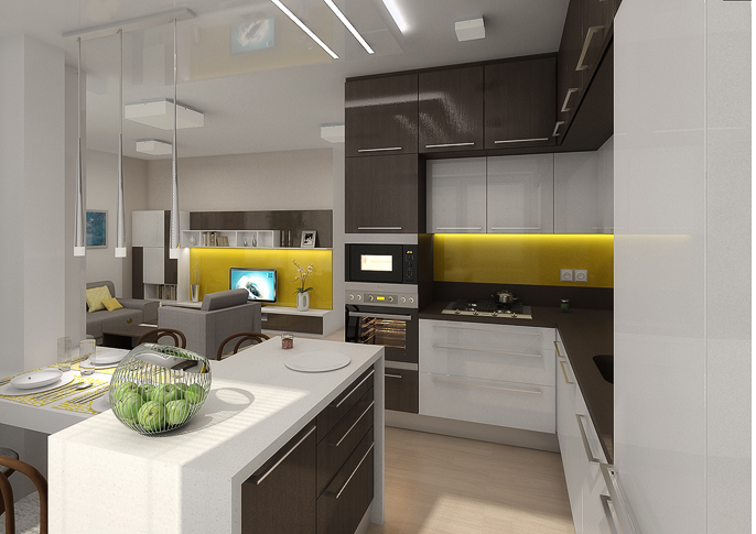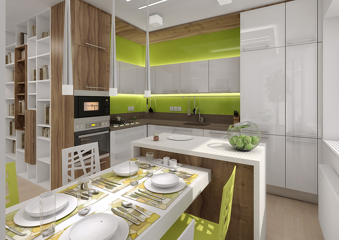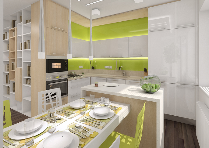 Different color variants of the corner kitchen design, connected to the library and living room in the same design, use Lacobel material in vibrant contrasting colors, illuminated by strips of LED diodes.