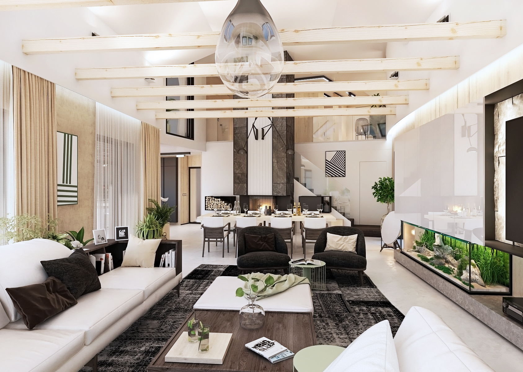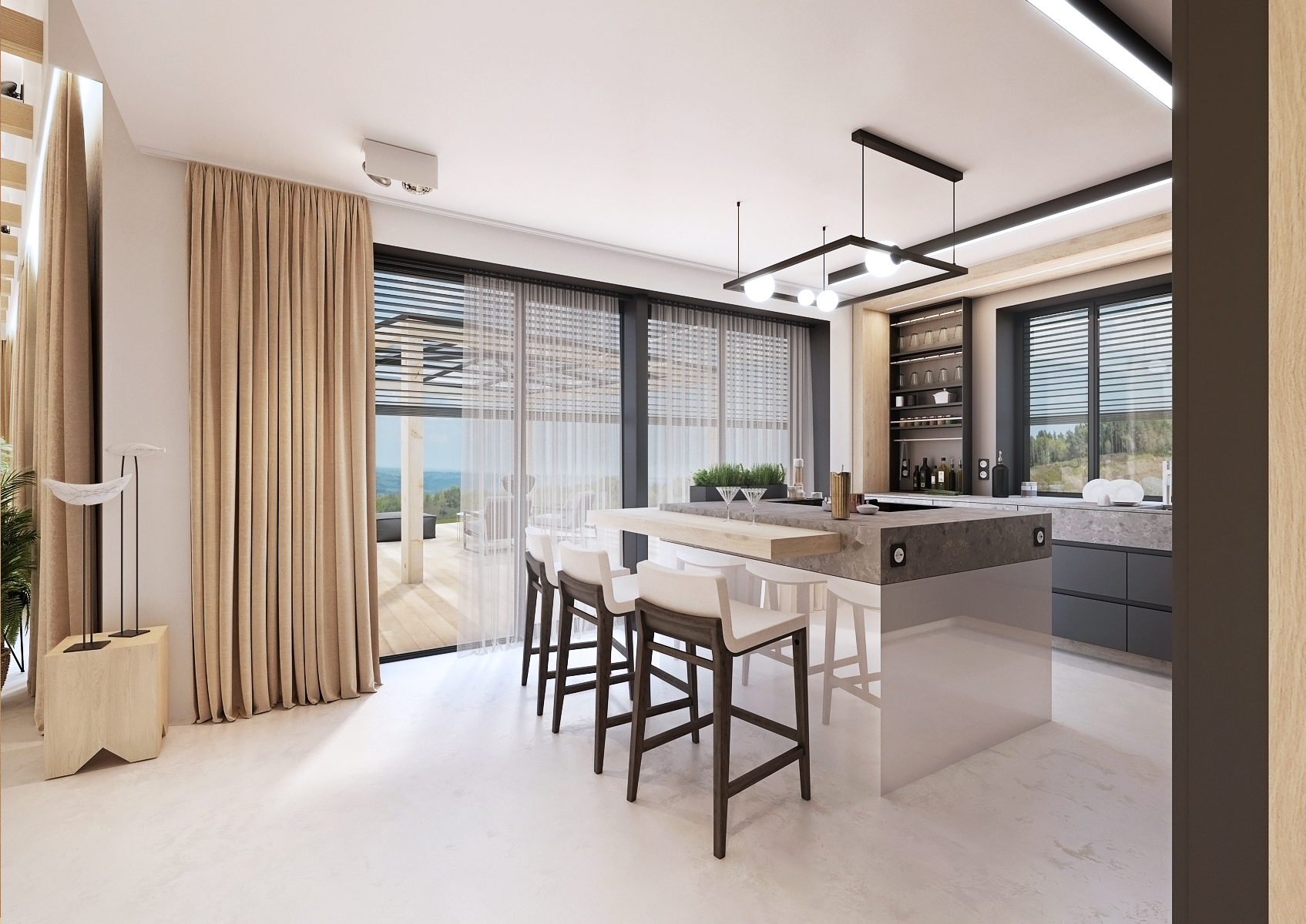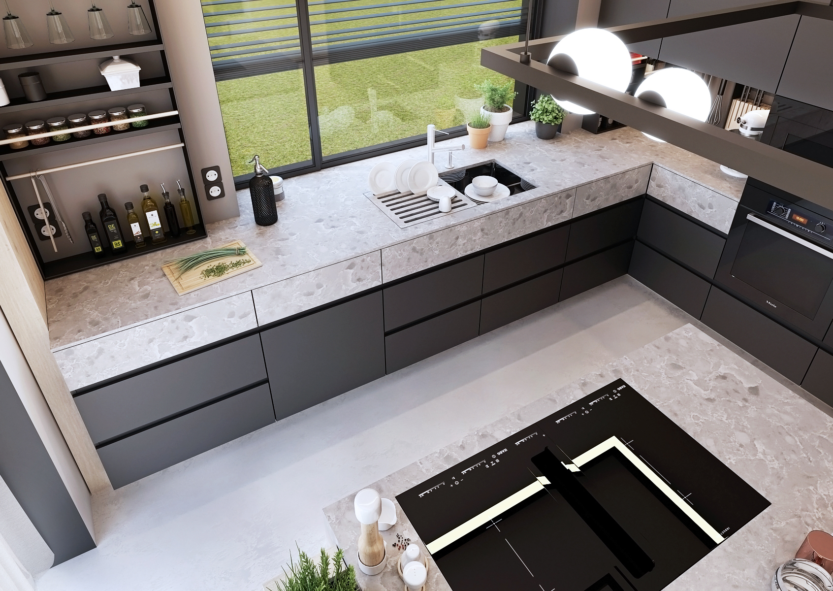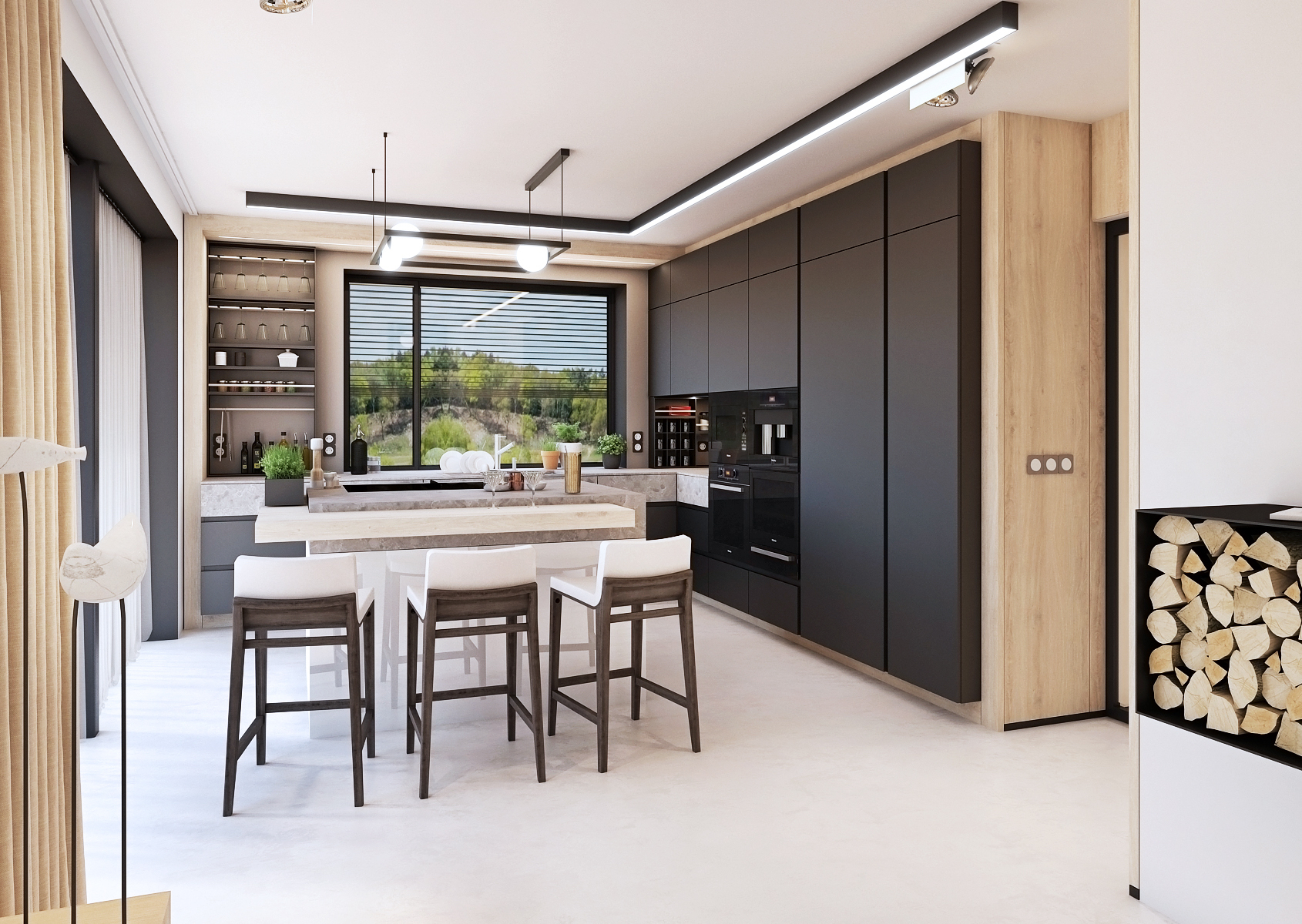 The spacious kitchen is tuned to black tones in combination with natural oak and gray stone countertops.