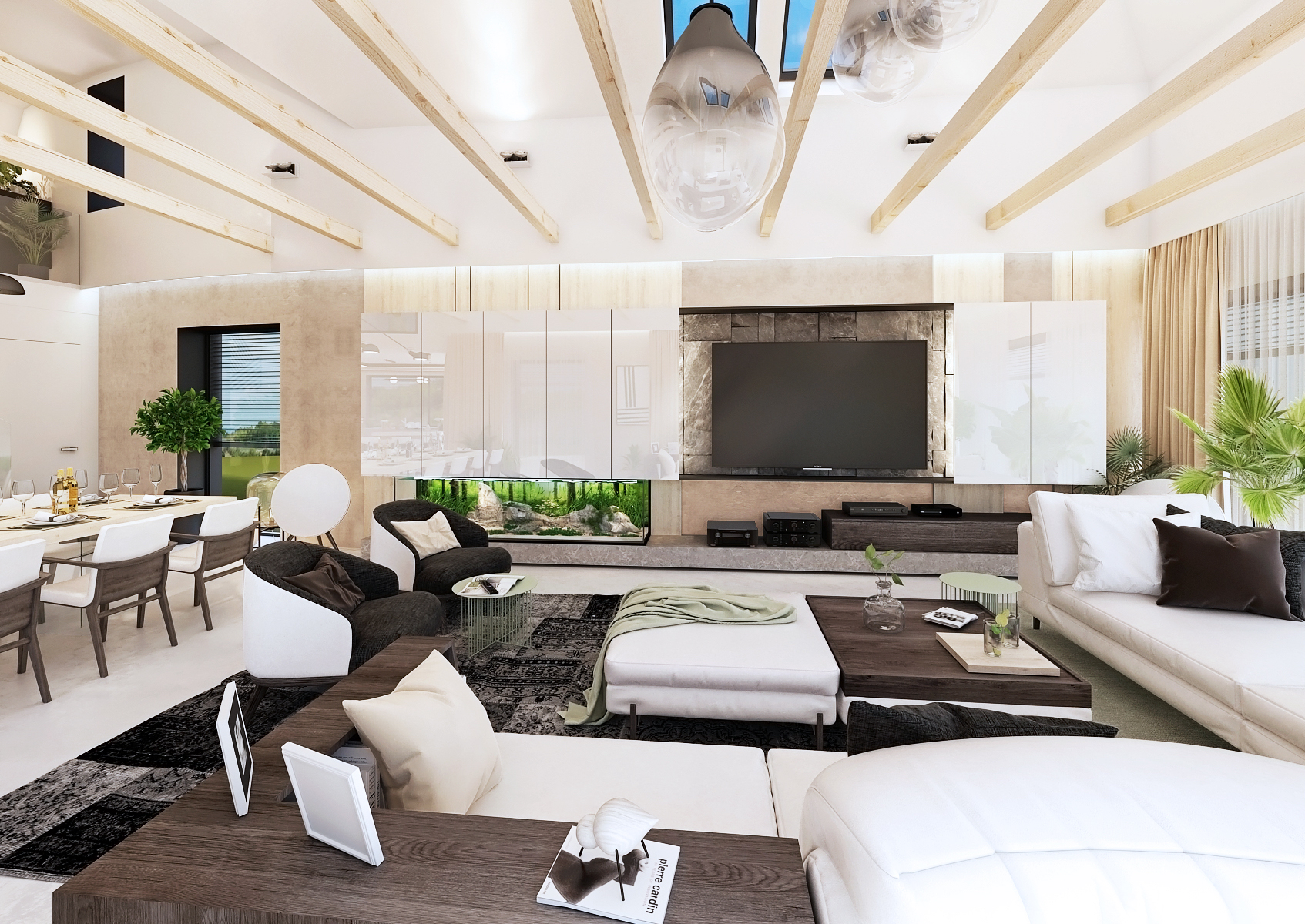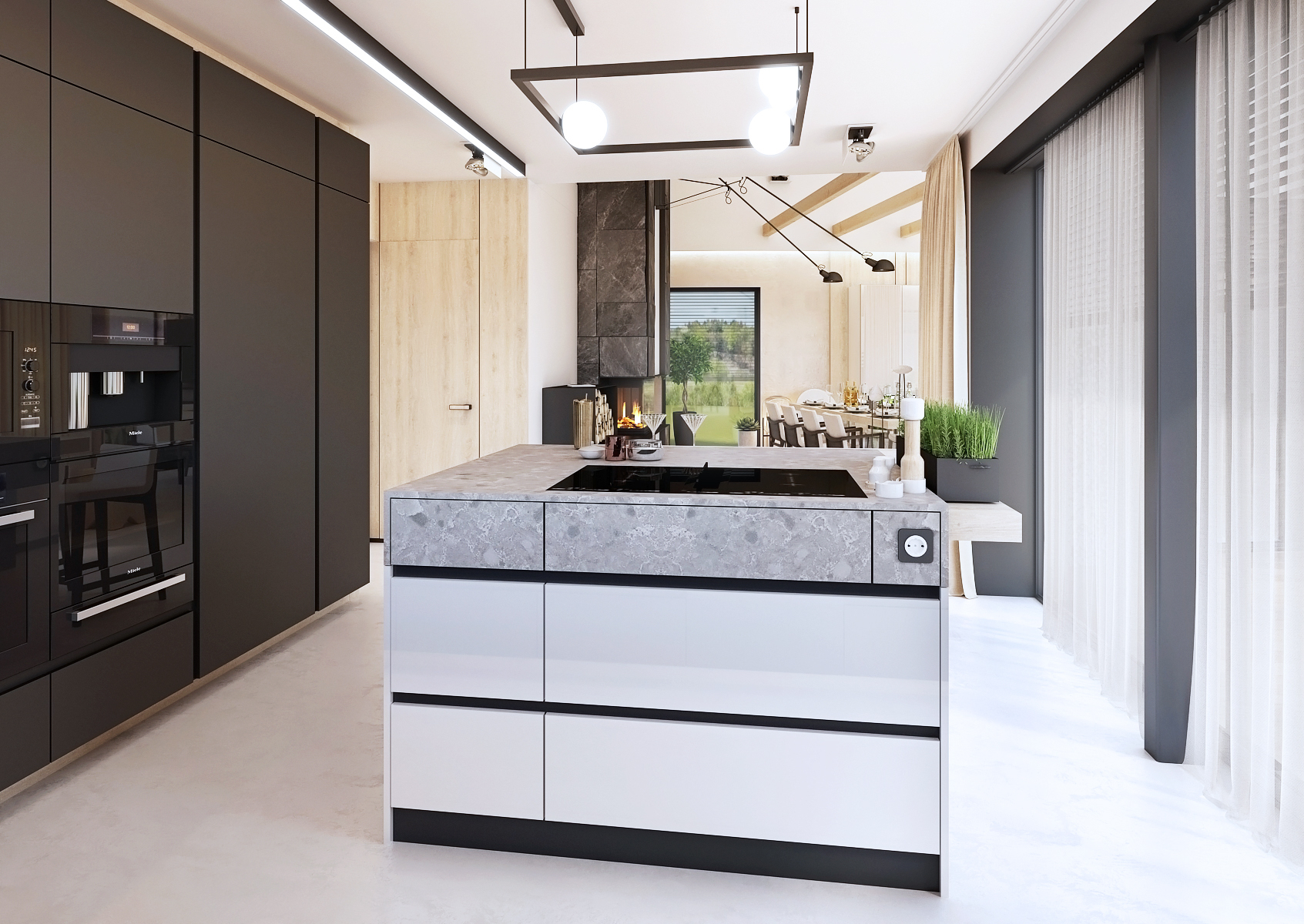 The center of the kitchen is decorated with a kitchen island with a bar area. There is also a hob with extraction in the middle. The space is illuminated using light strips and a hanging frame lamp above the island. Handleless cabinets and drawers underline the clean design.