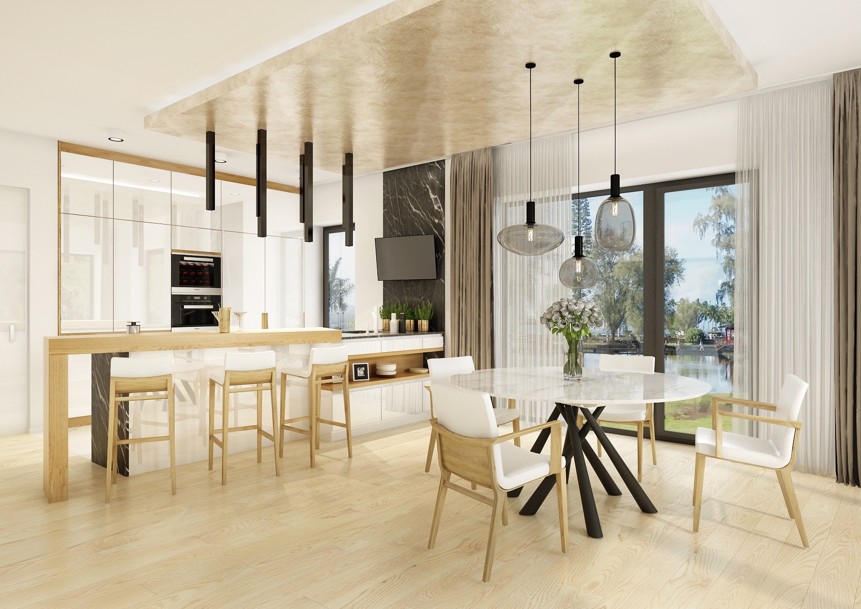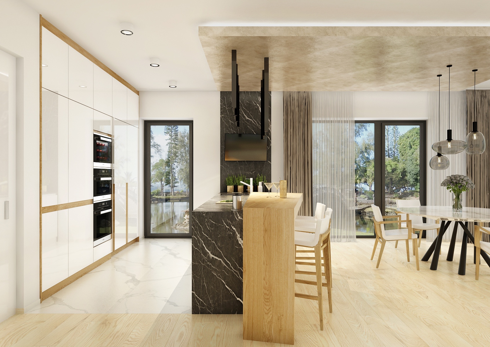 The dominant feature is the central kitchen island with stylish bar stools and black hanging lights that give the space a sophisticated look. A marble table with black legs and modern chairs in the dining area brings a touch of luxury to the room. Large windows provide plenty of natural light and views of the exterior, opening up the interior even more and connecting it with the outdoors.