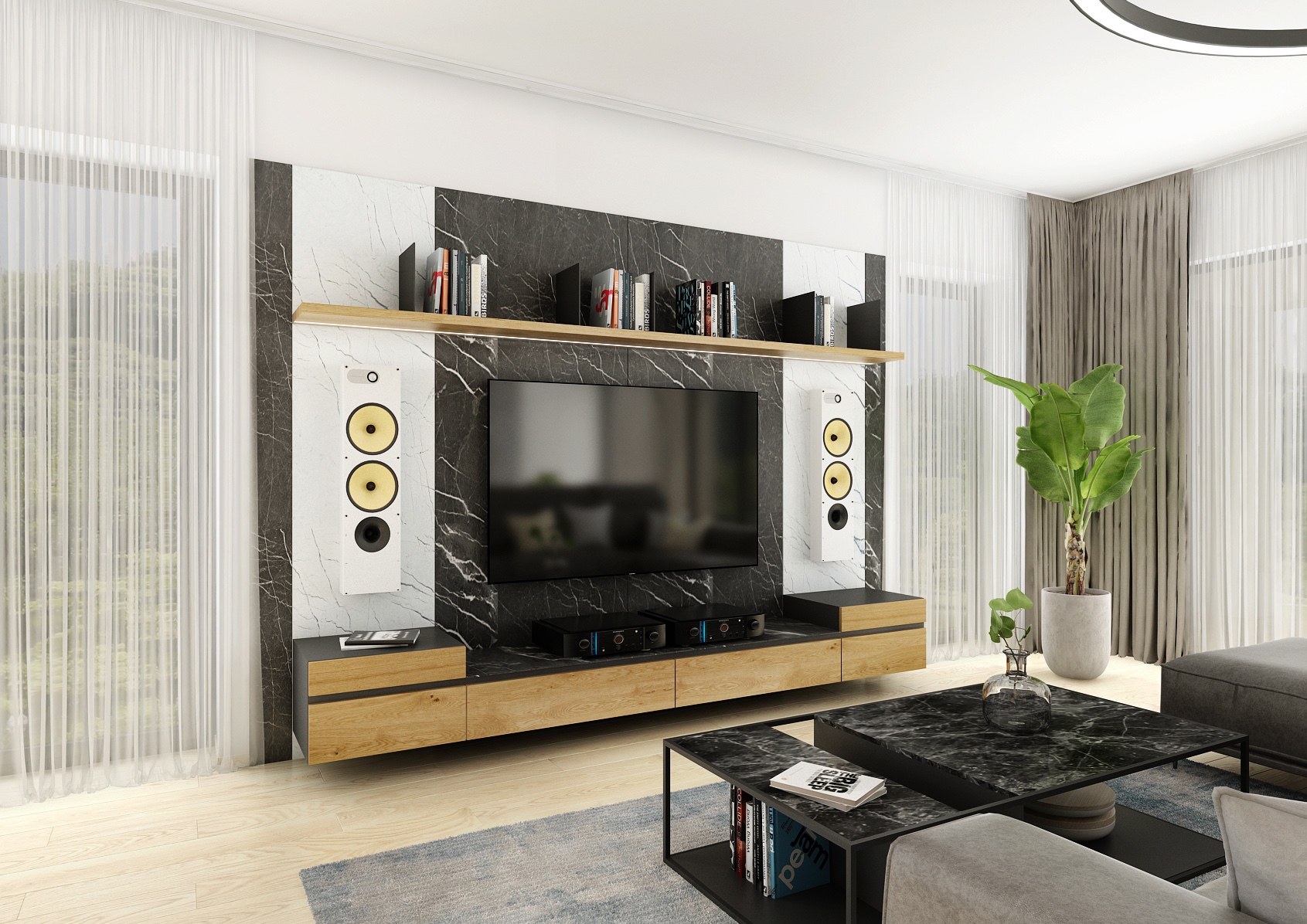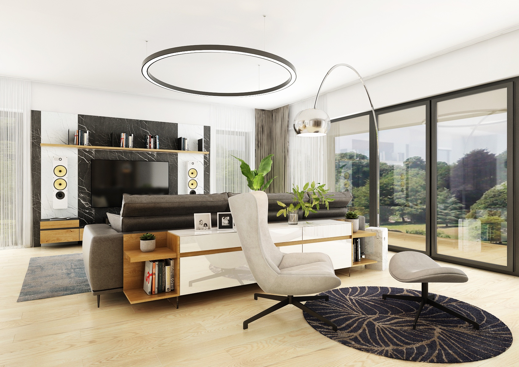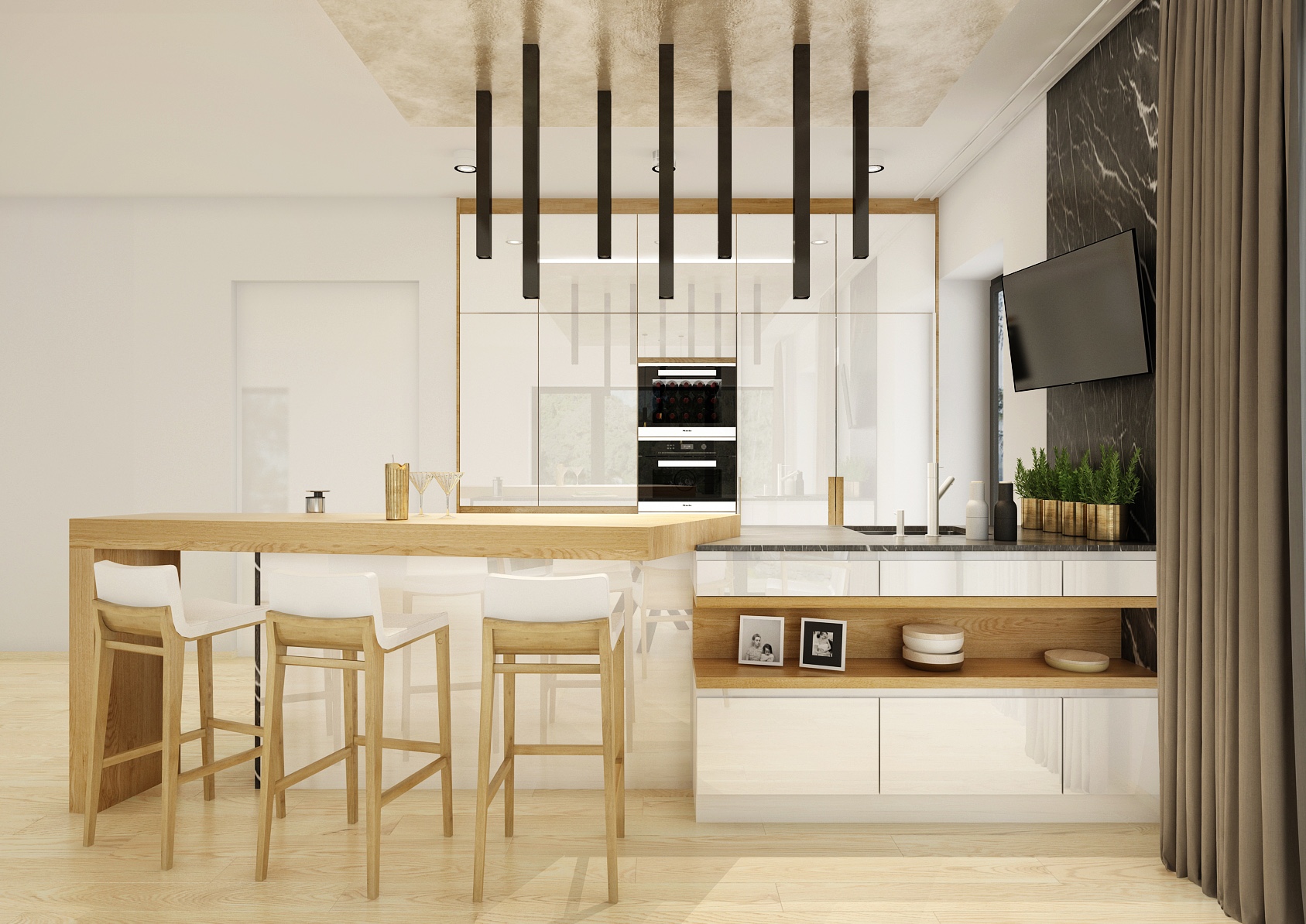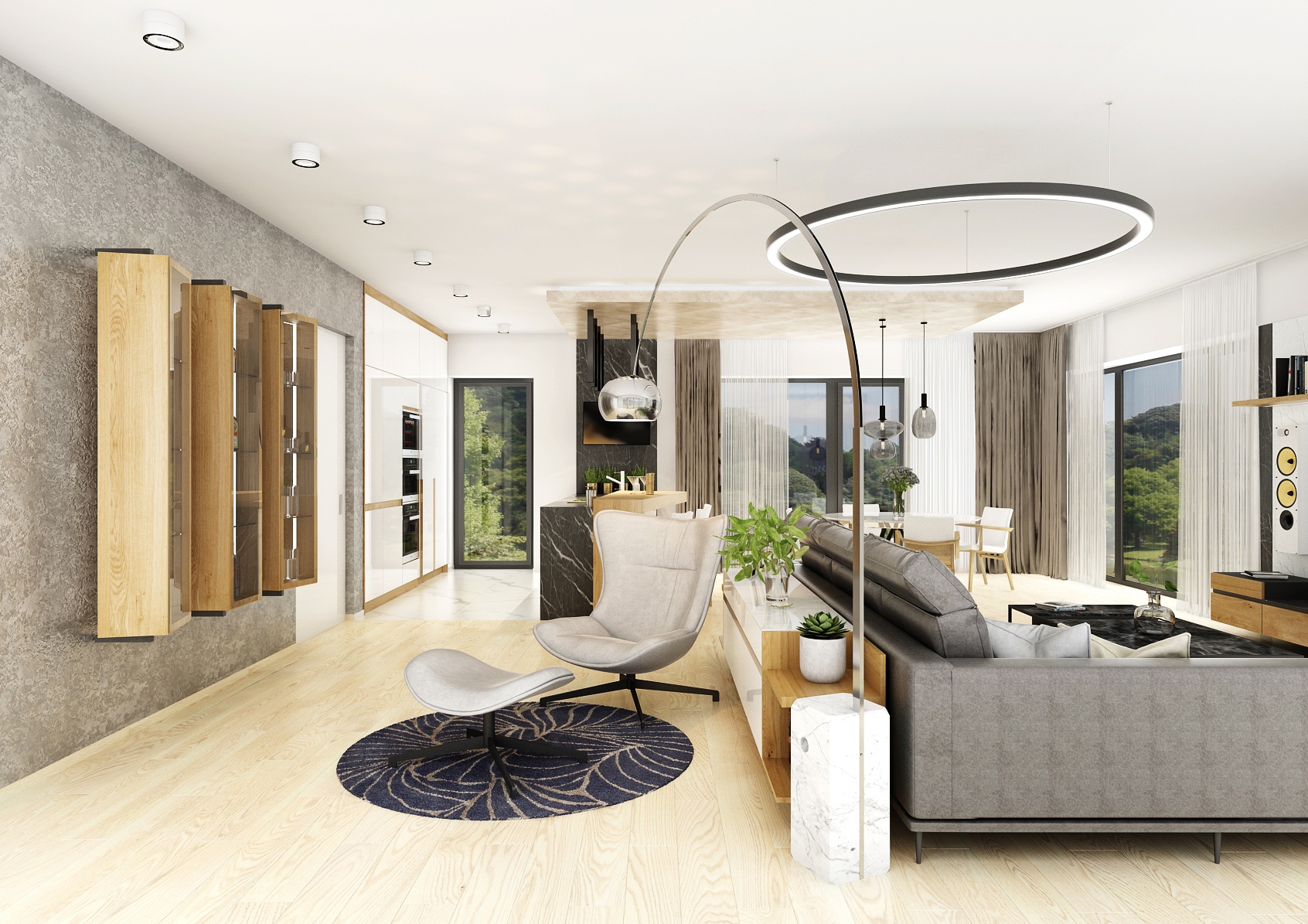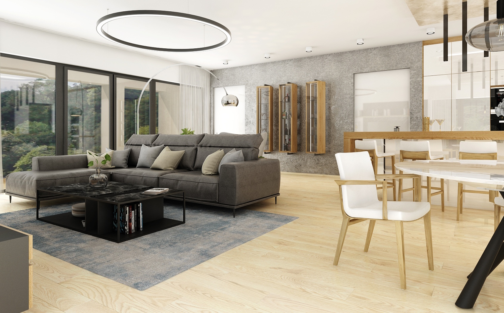 The central point of the living room is a comfortable gray sofa complemented by a stylish black coffee table that provides plenty of storage space. Bold circular ceiling lighting and modern pendant lamps add elegance to the rooms, while large windows provide plenty of natural light and beautiful views of the outdoors. Display cases with premium alcohol hang on the wall, which serve not only as practical storage, but also as an aesthetic element. The light wooden floors and neutral color palette of the entire space contribute to the feeling of airiness and openness.