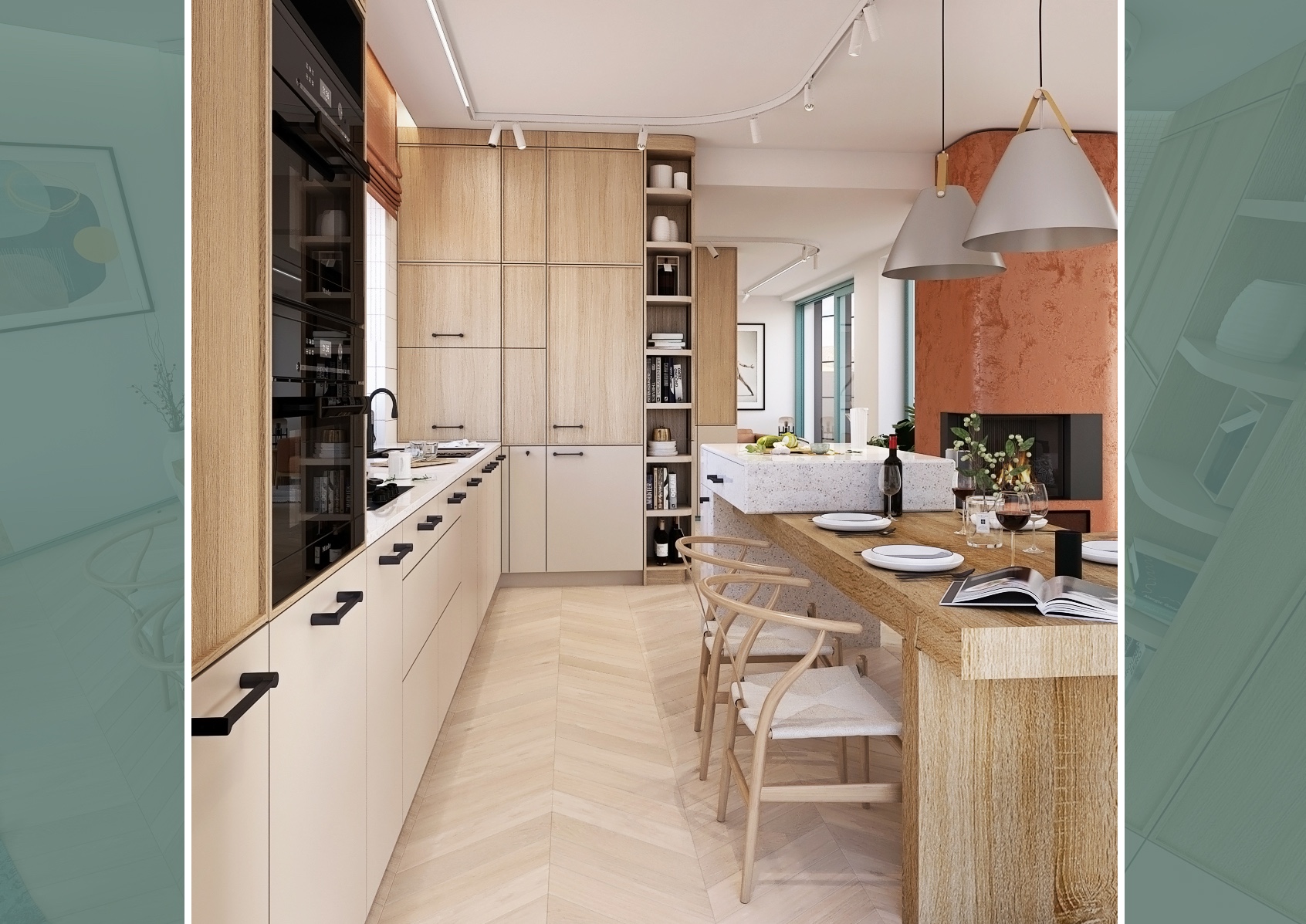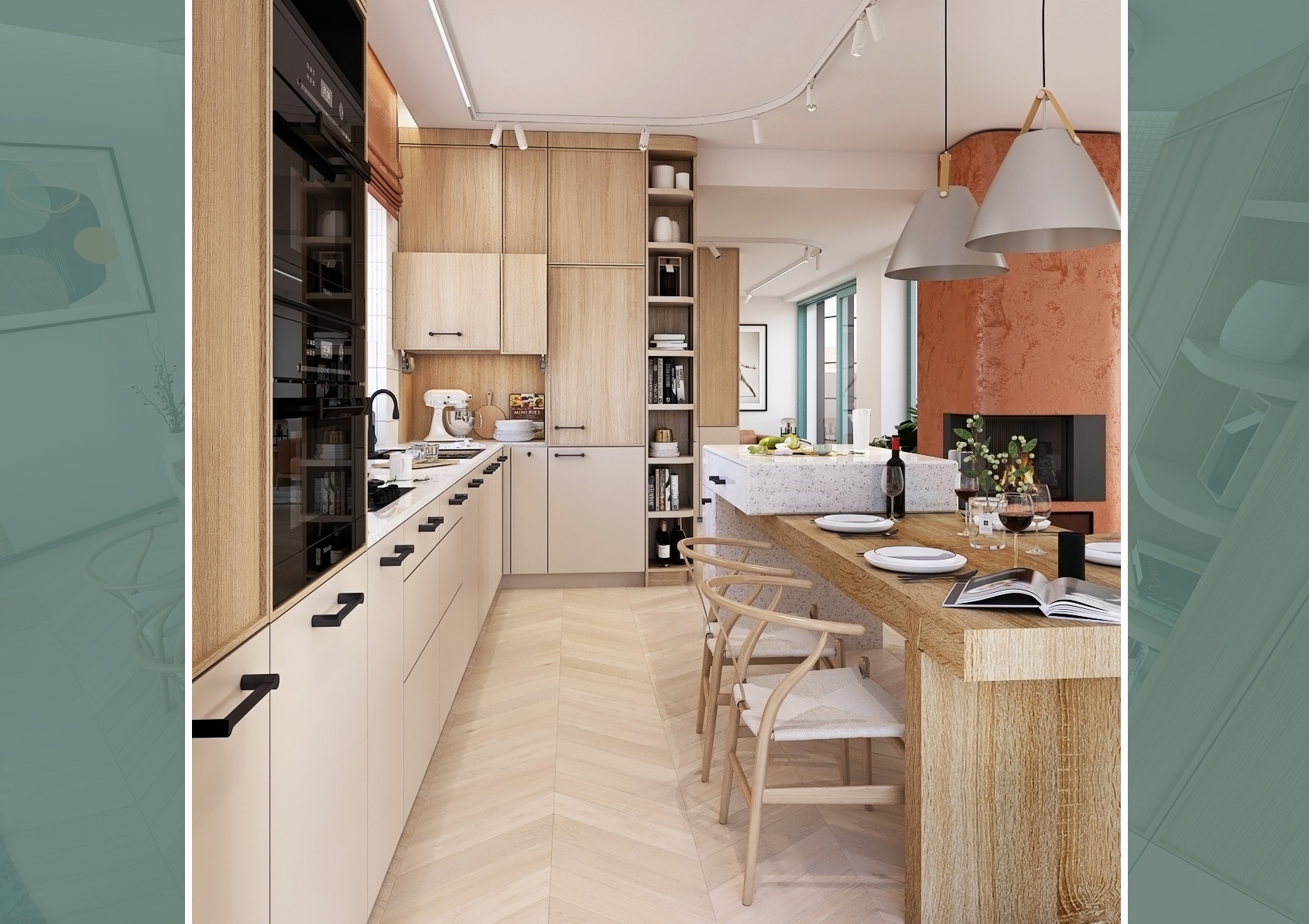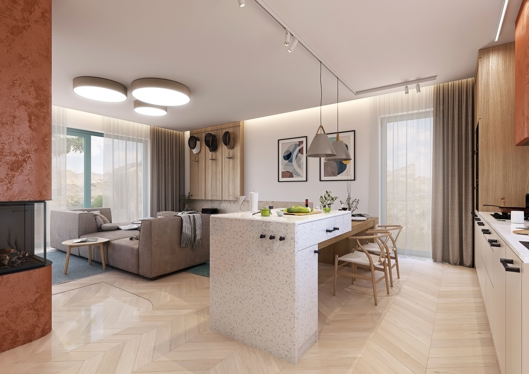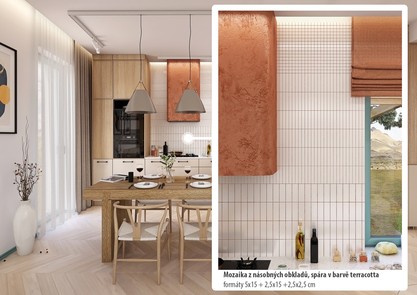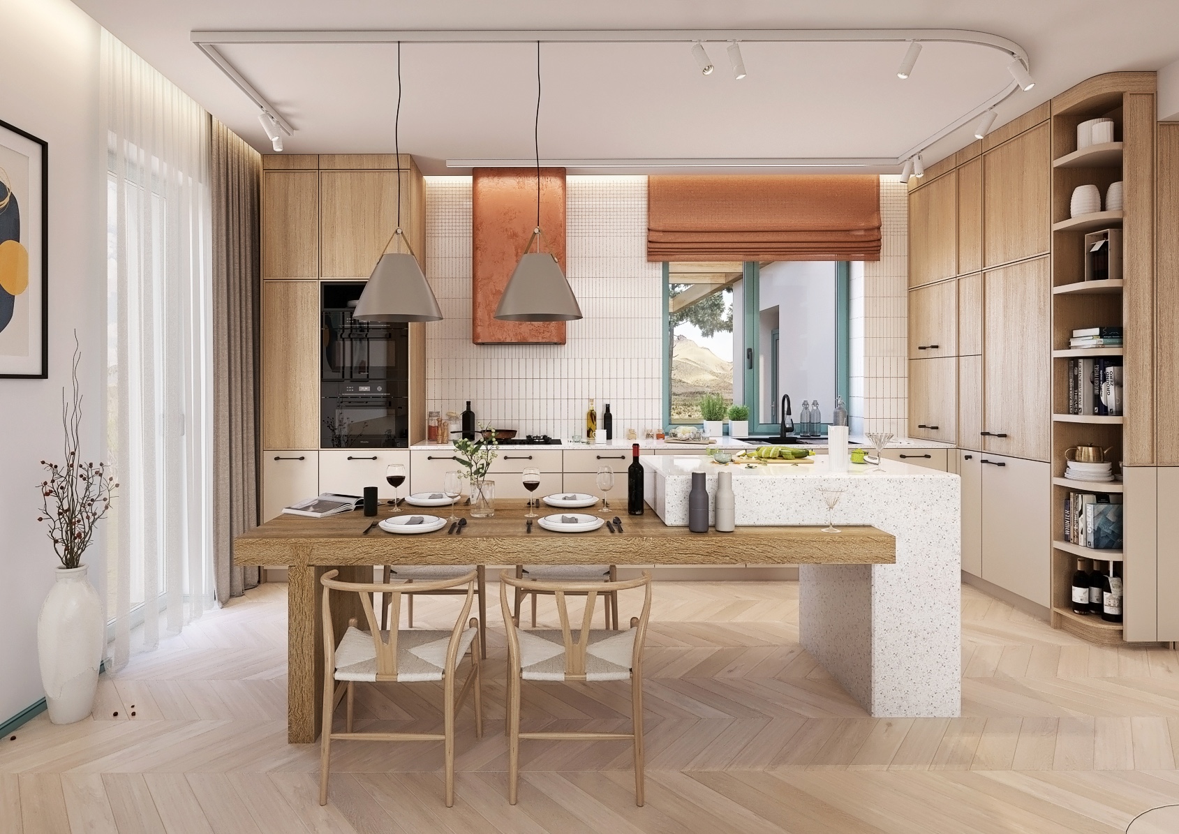 The main part of the kitchen consists of a spacious solid wood table surrounded by stylish armchairs. Two large pendant lights hang above the table, providing warm lighting to the space. The kitchen is equipped with built-in appliances and offers plenty of storage space, which ensures practical and efficient use of space.