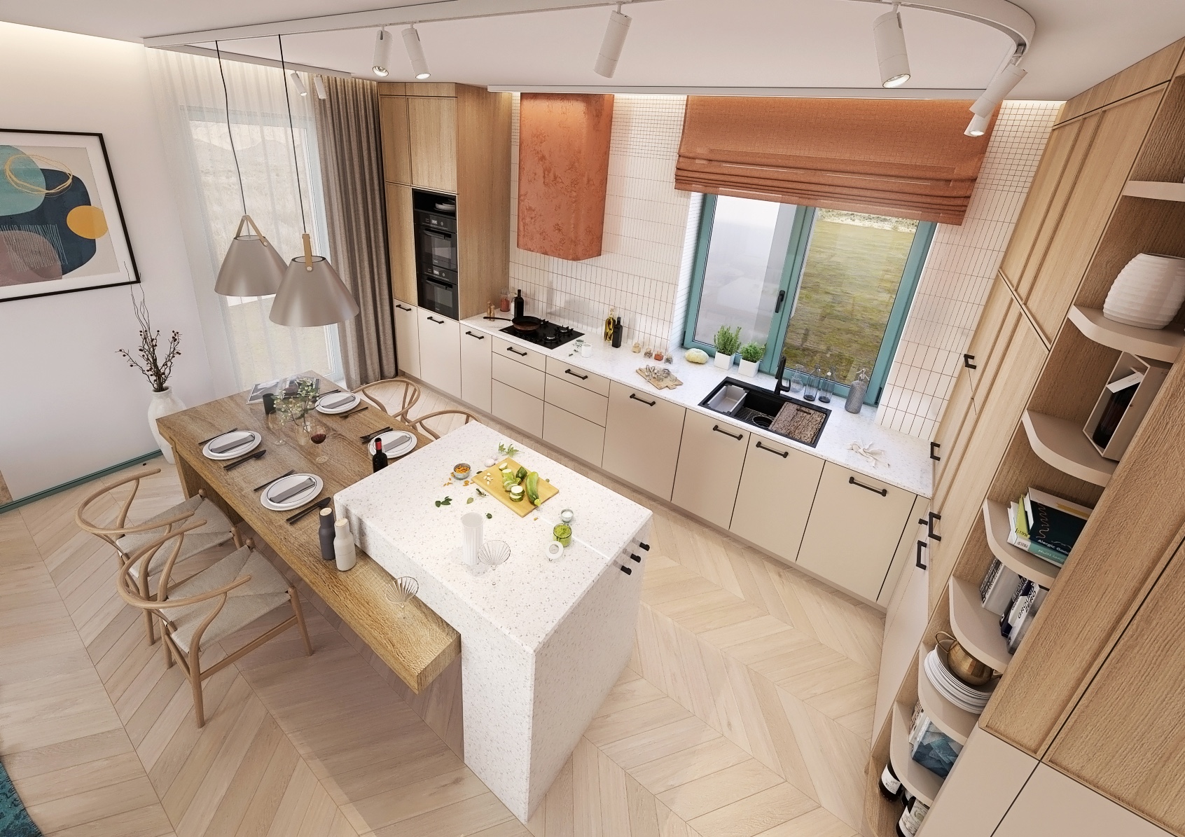 This kitchen impresses with its modern and elegant design, which combines natural wood with clean white surfaces.