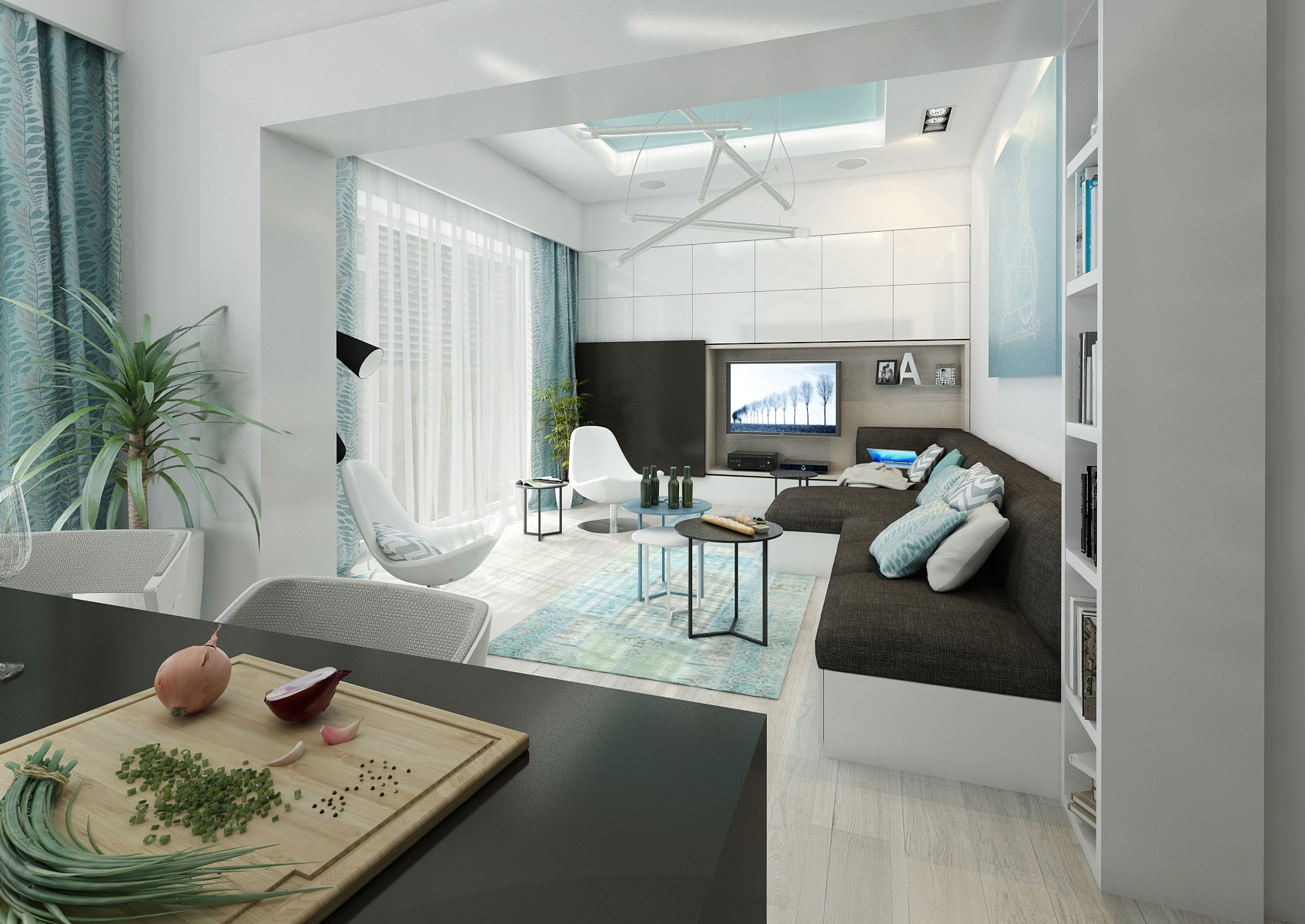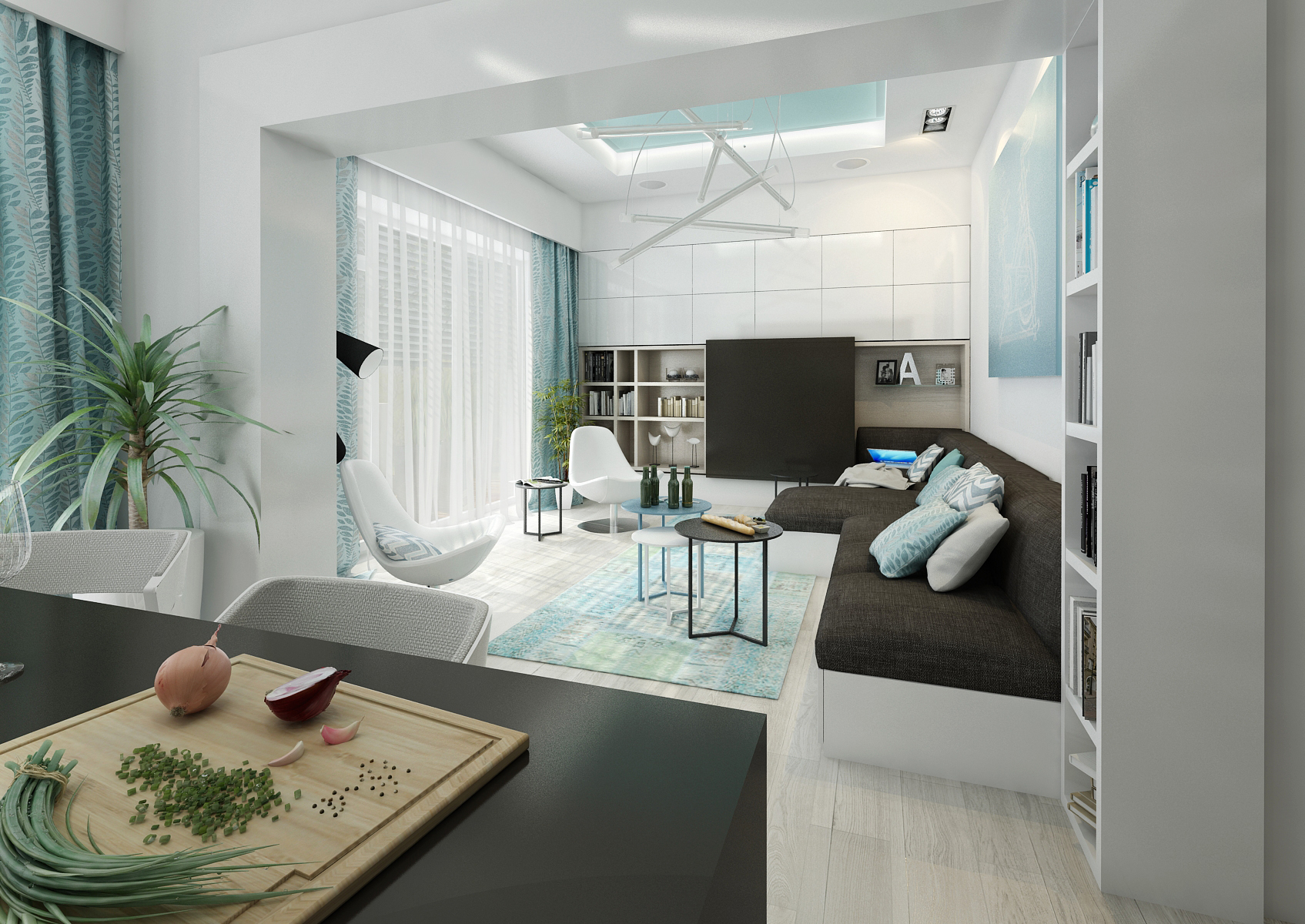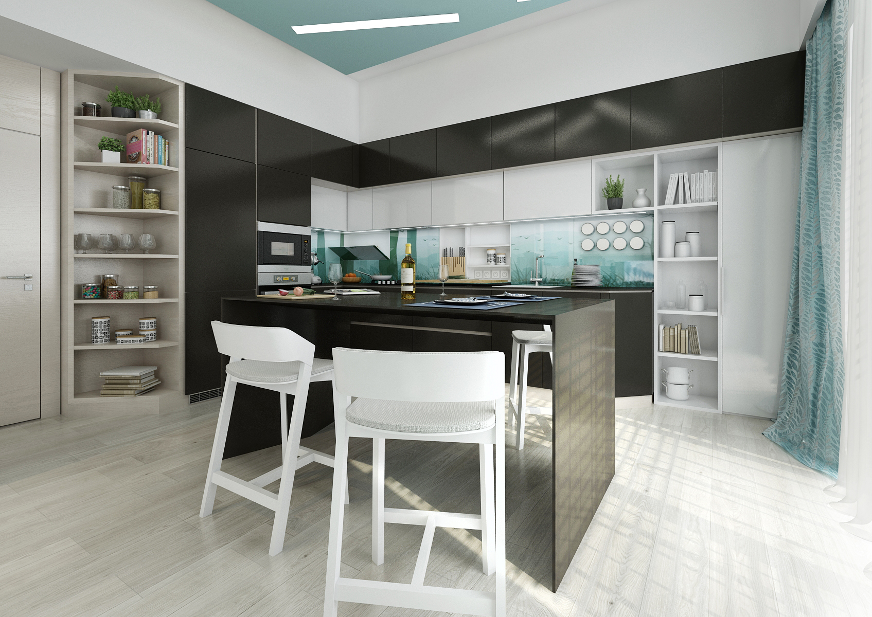 is designed in a modern style in a turquoise-black-white combination together with a light wooden floor made of bleached oak. A black compact top is used for the worktop and the bar / dining table. Untraditionally conceived tiling behind worktop. Behind the tempered glass, glued with a graphic motif, there is also a hinged storage space, for example for spices, knives, chopping boards, etc. In the living room, the main feature is a TV wall with a sliding element, behind which you can hide a TV or library.